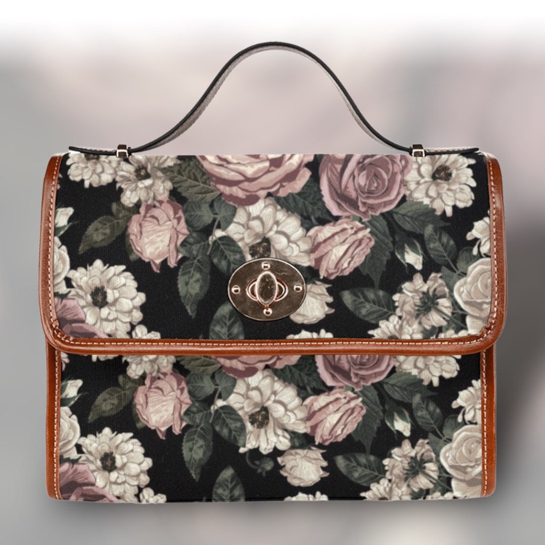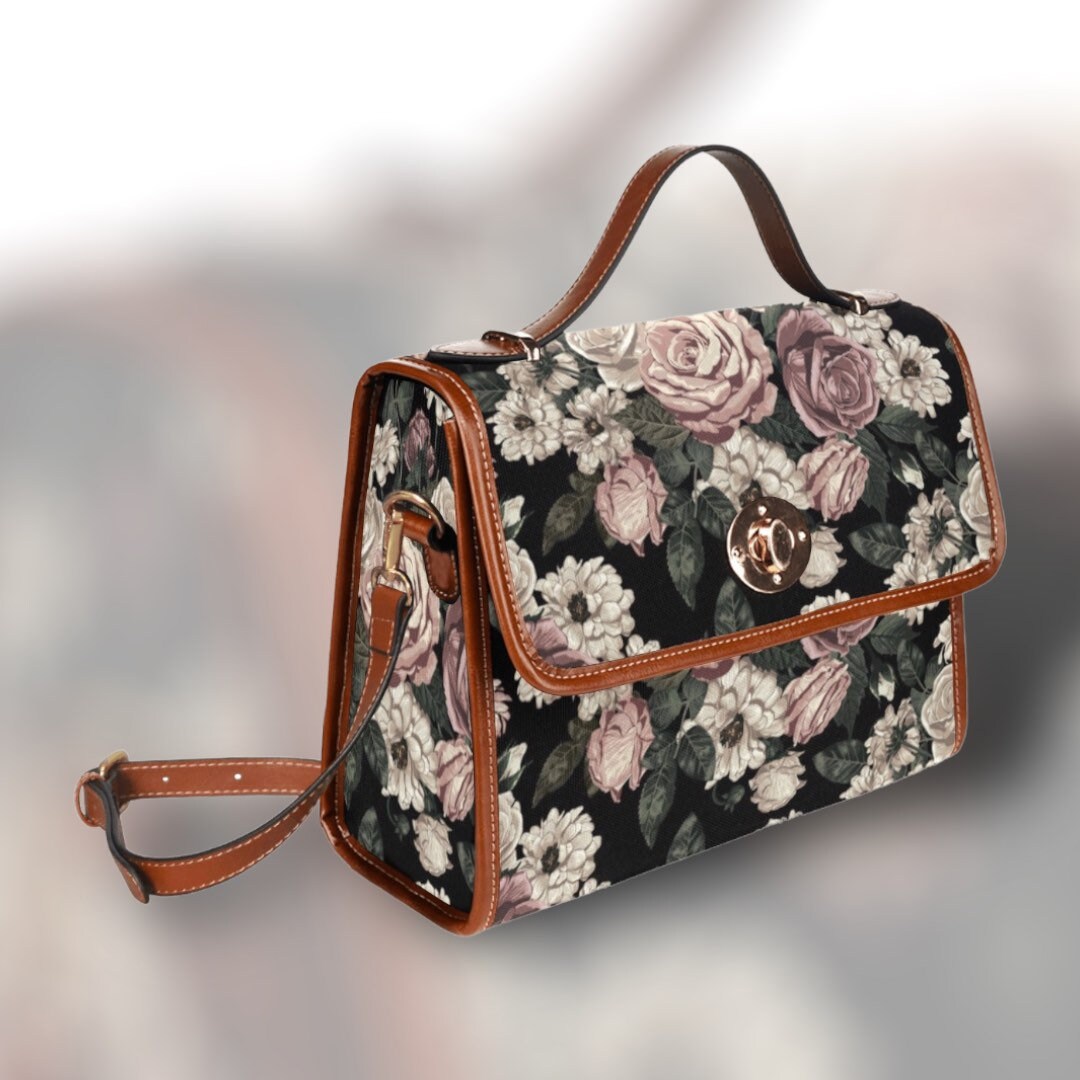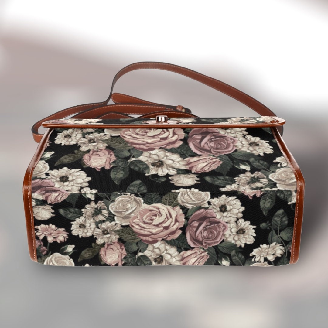 Cottagecore Rose foral Canvas Satchel bag, Cute women rose moon crossed body purse, cute vegan leather strap goth bag, hippies boho gift