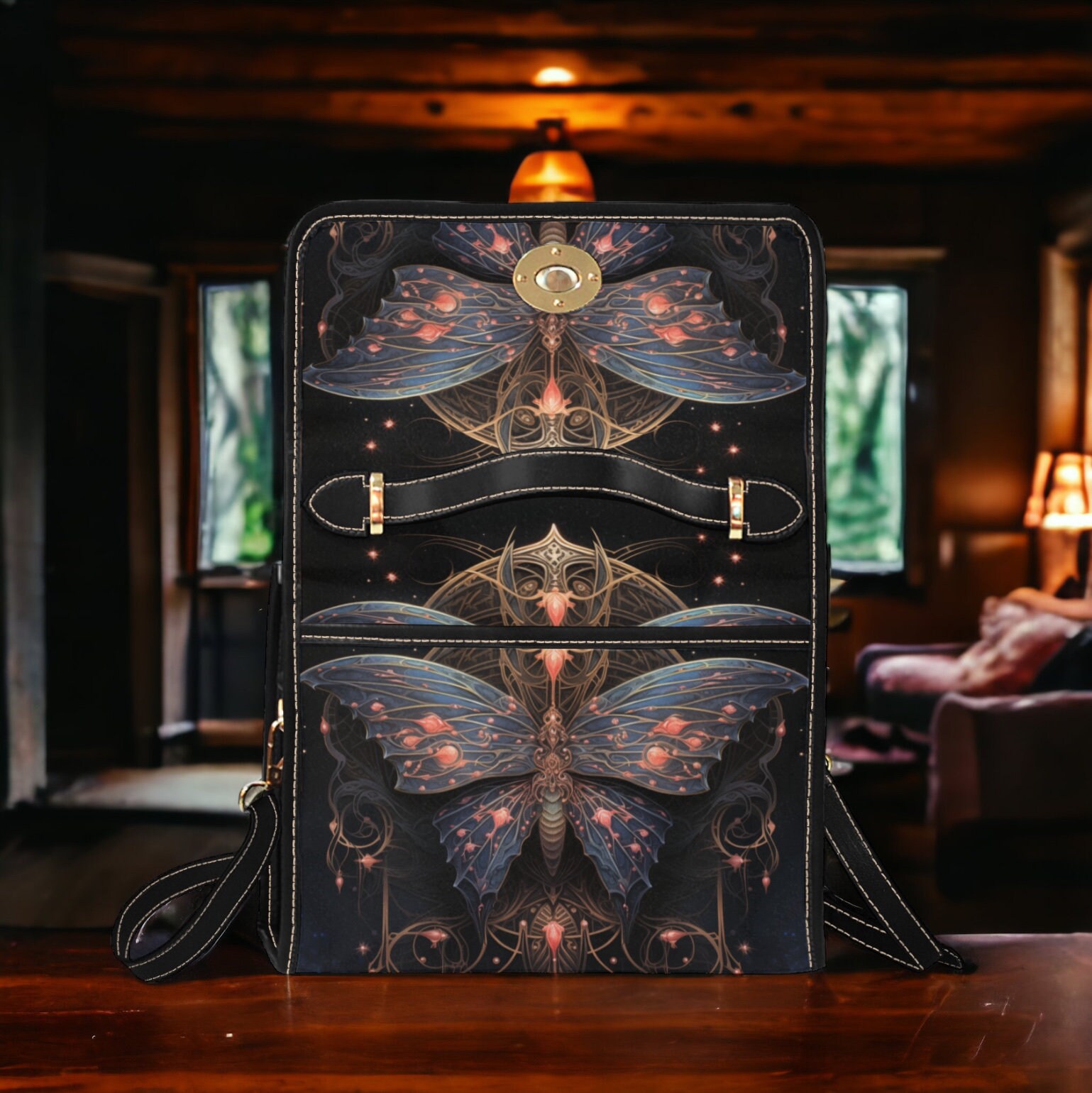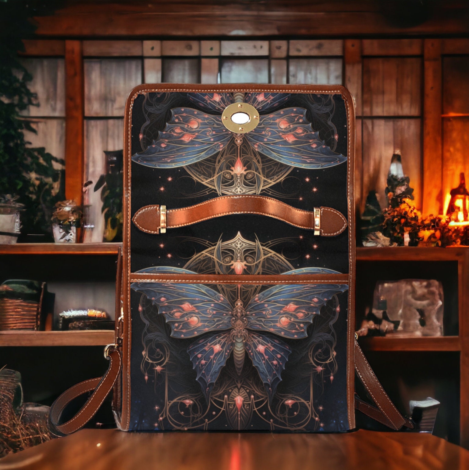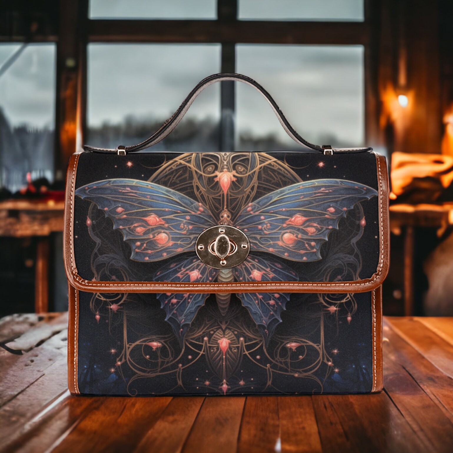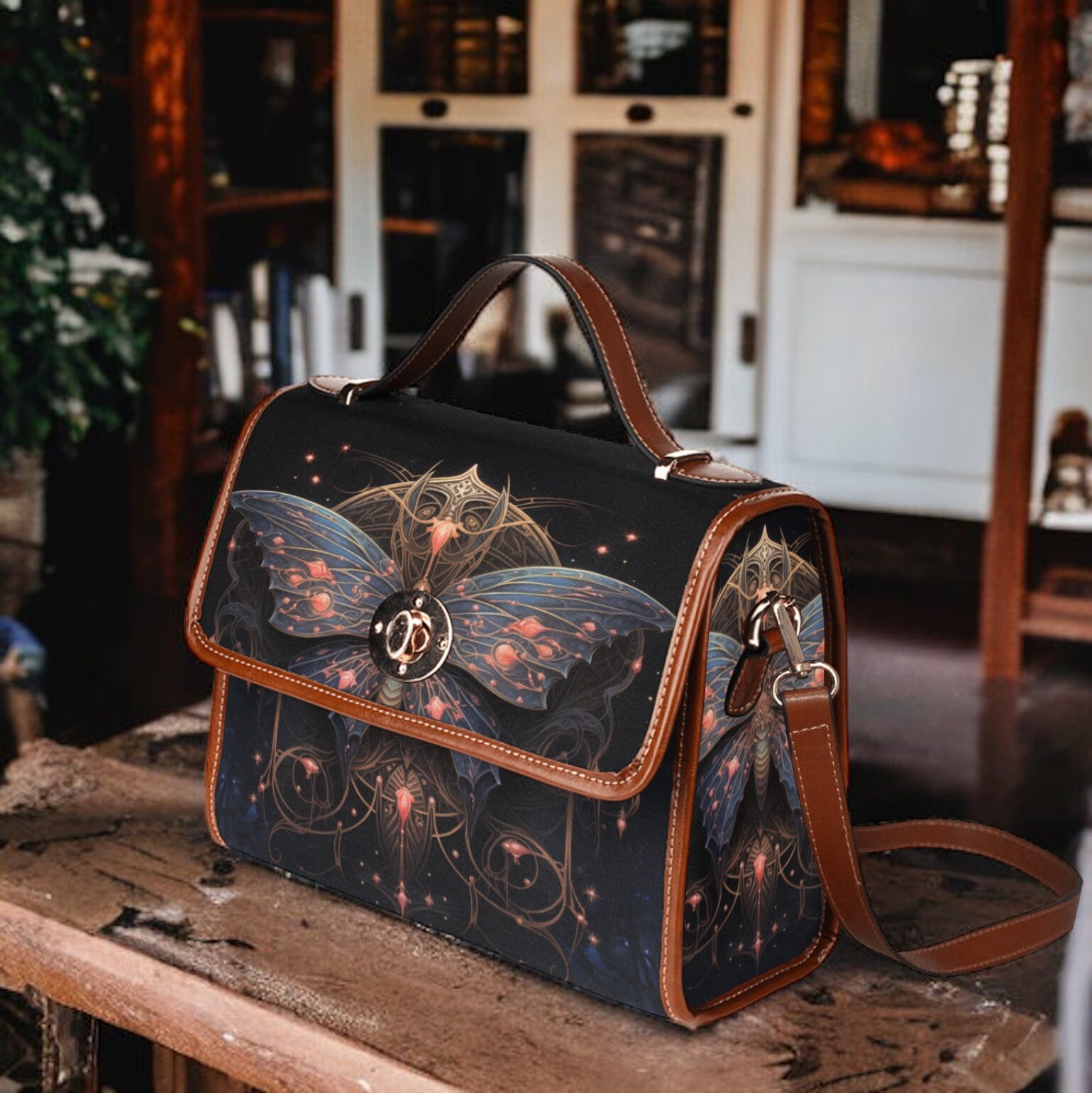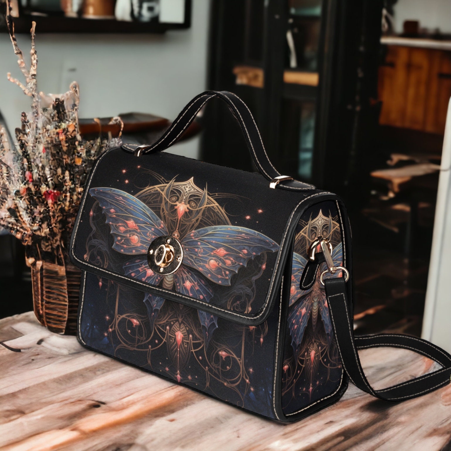 Cottagecore moth Forest Green Witch mini messenger bag, Moon phase Dark academia Black Vegan leather trim handbag, boho purse satchel bag