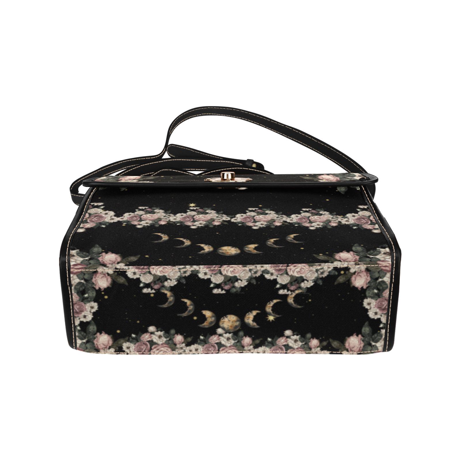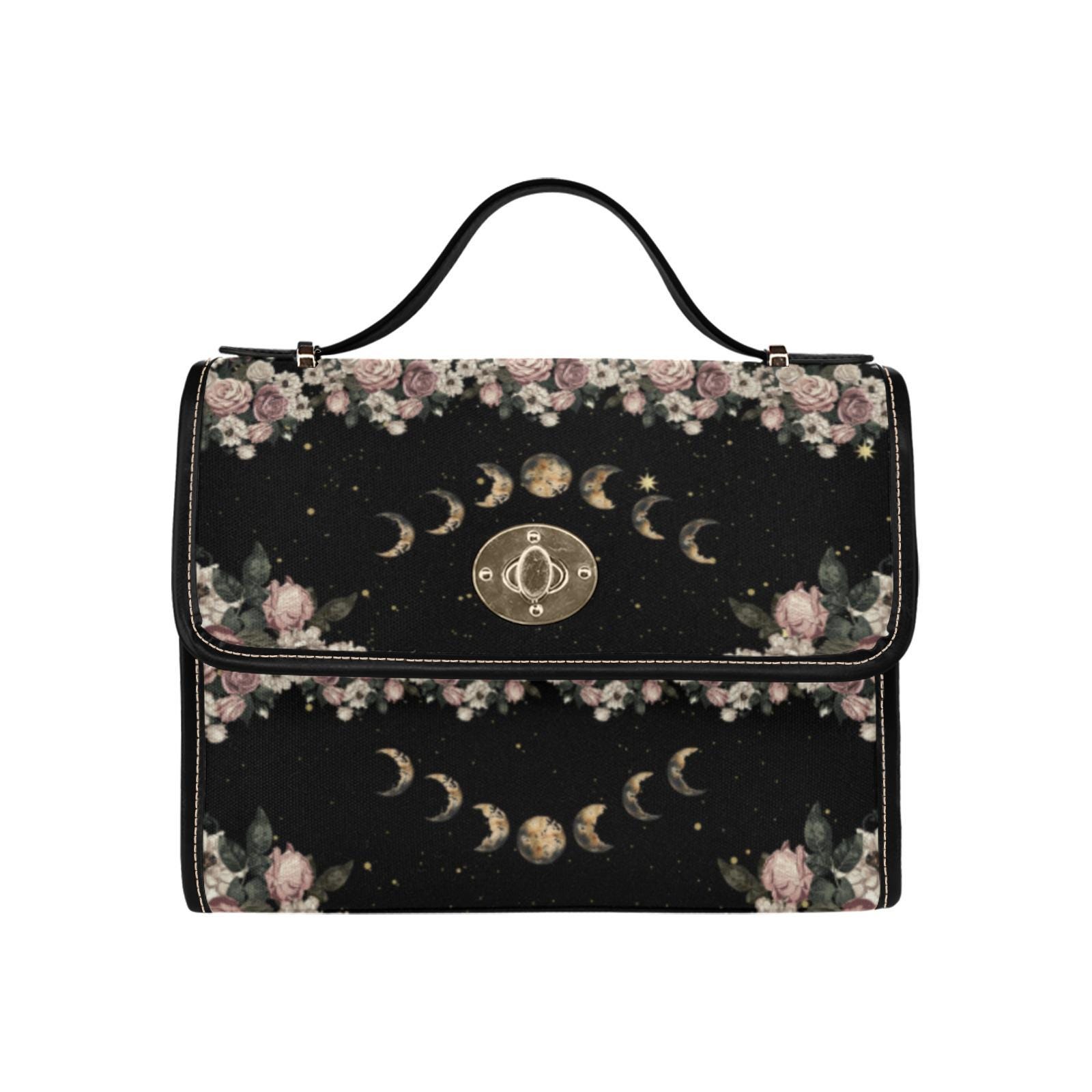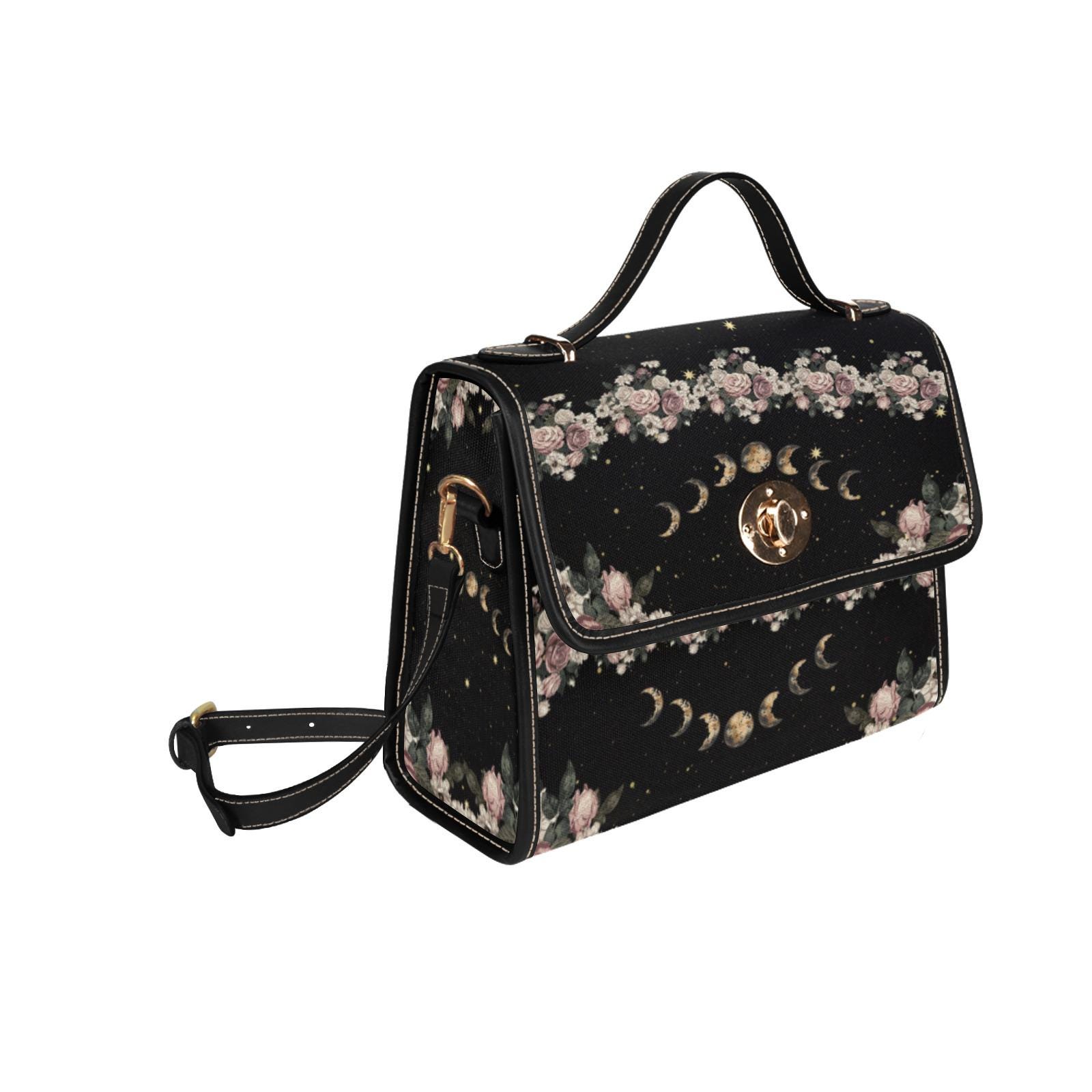 Cottagecore witch Canvas Satchel bag, Cute women rose moon crossed body purse, cute vegan leather goth moth moon phases bag, hippies boho