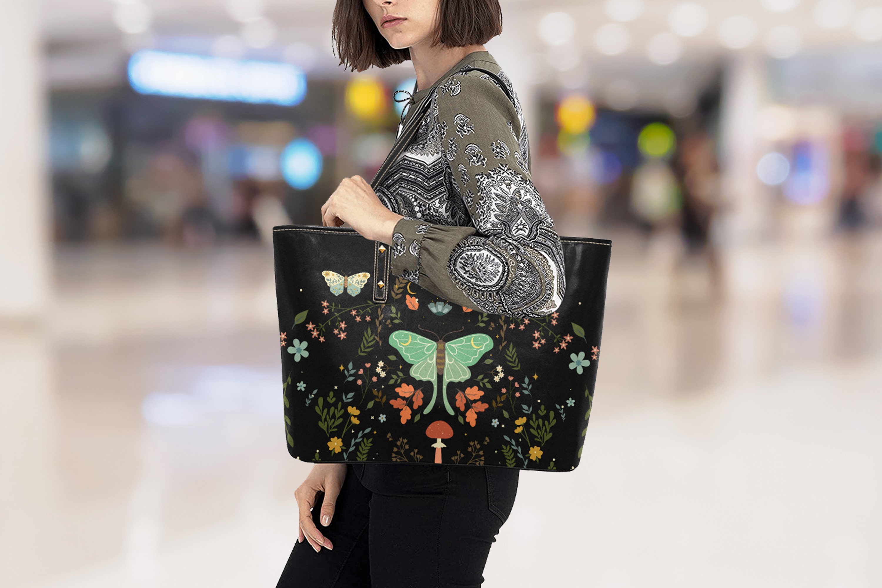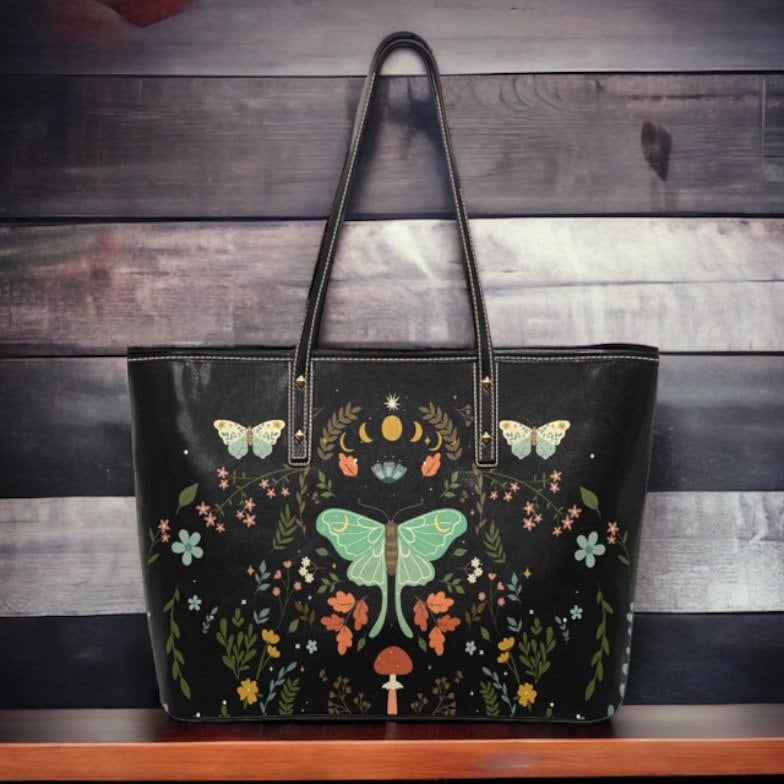 Black Cottagecore Floral Moth Bag Cute witchy Vegan leather tote bag, Cottagecore Pu leather bag, Cute Goth bag big zip tote, witchy purse