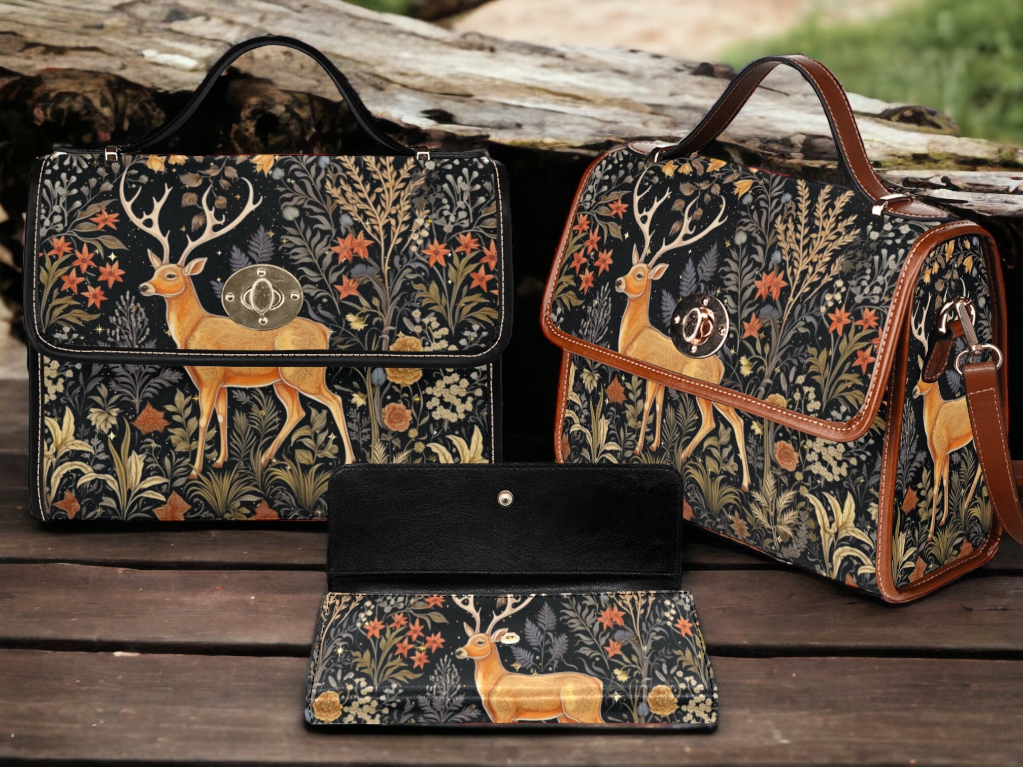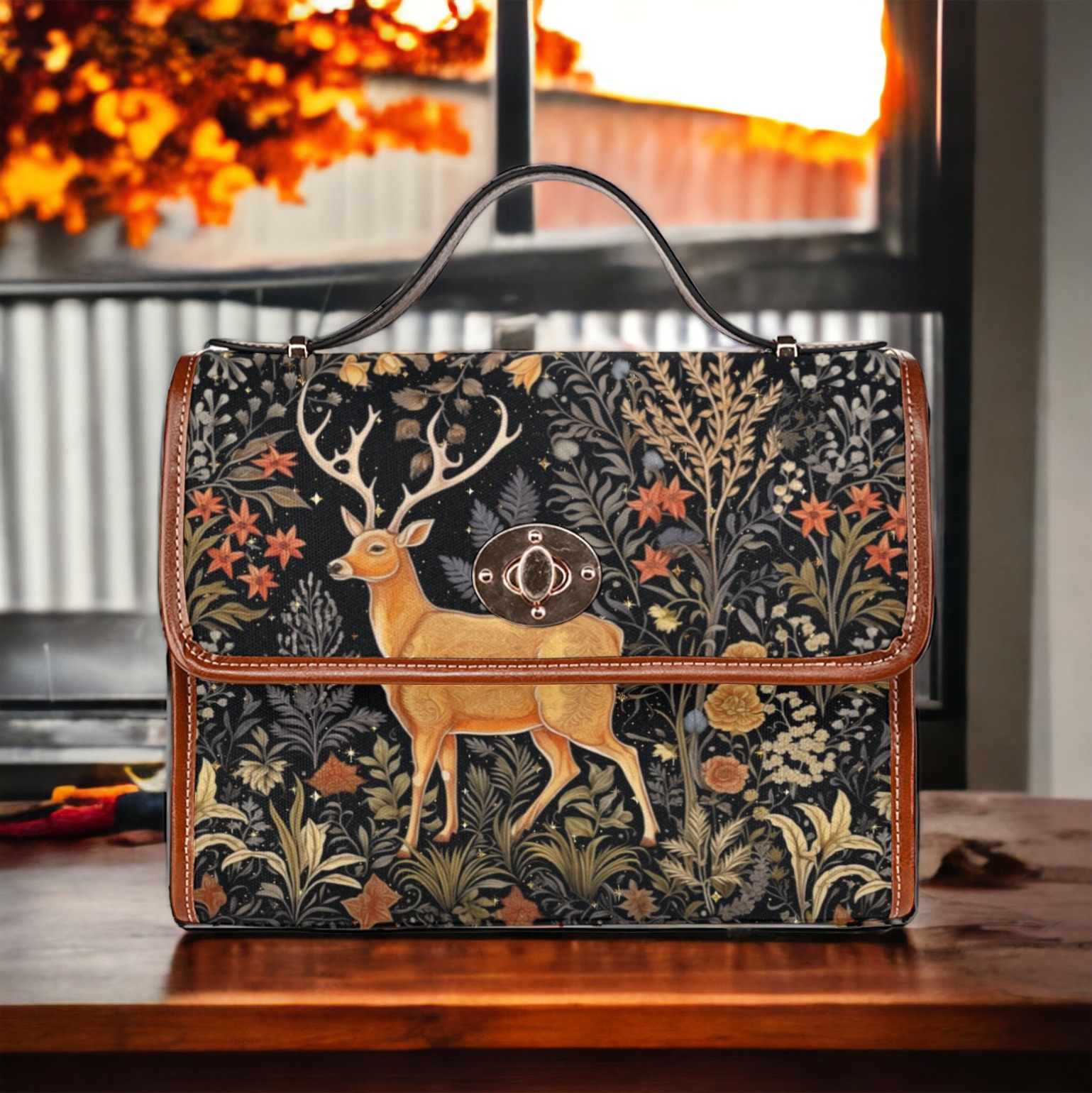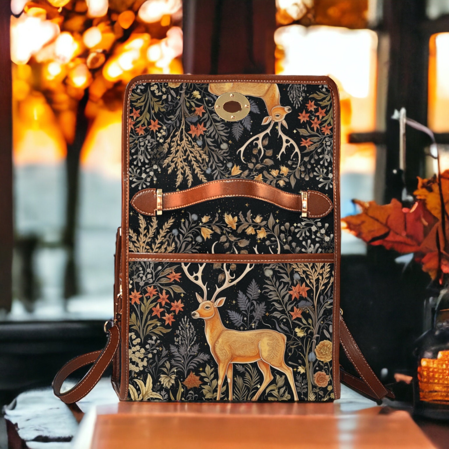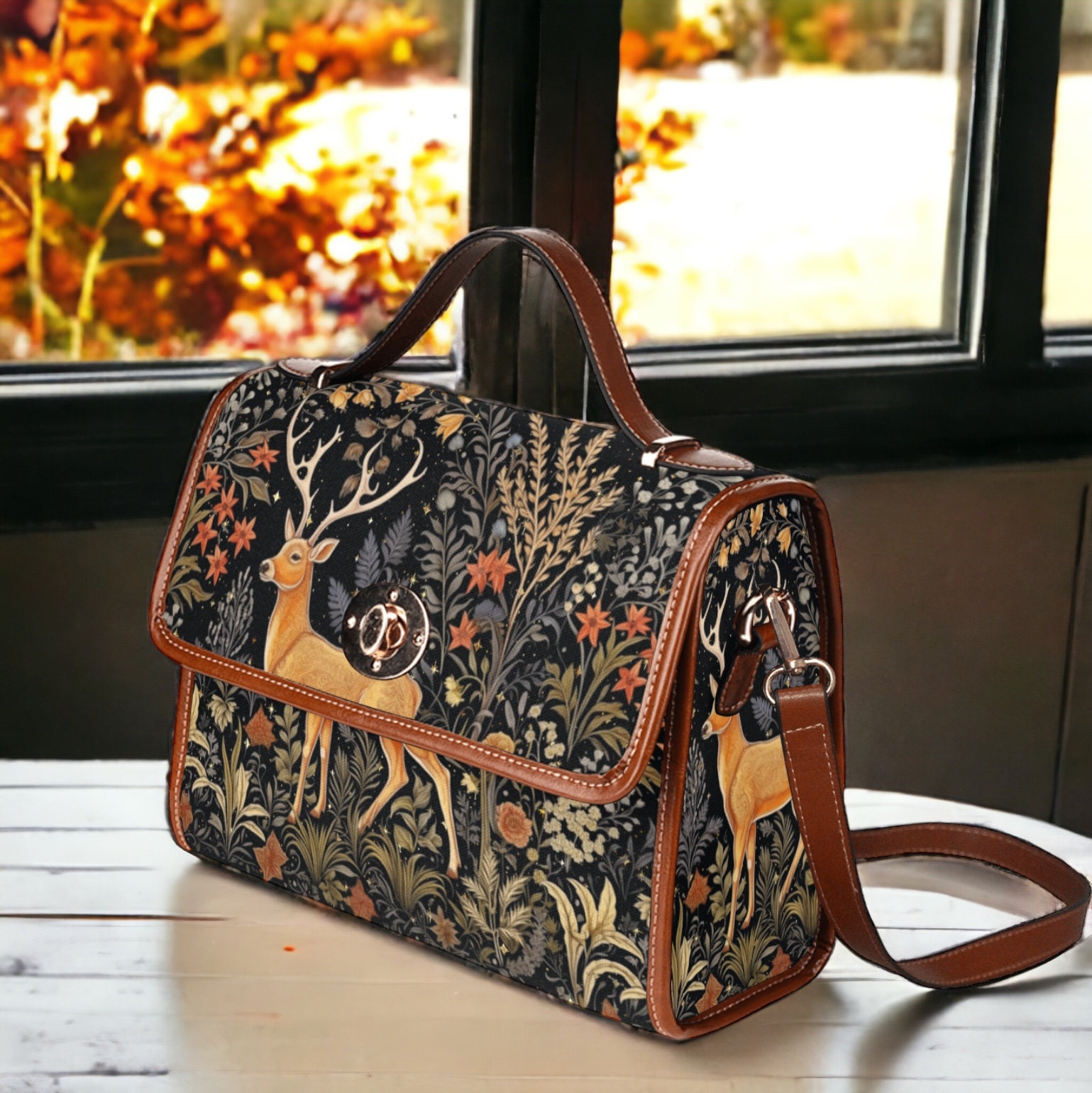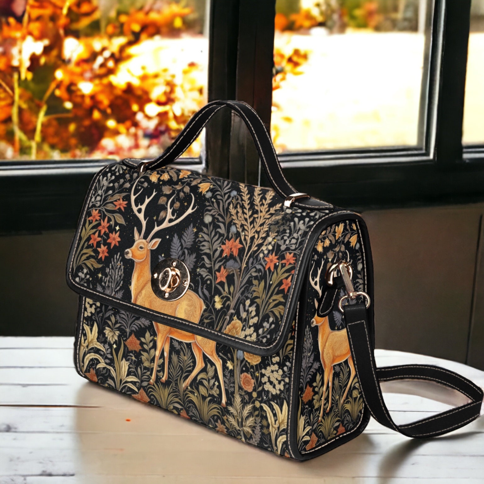 Cottagecore nature forest Canvas Satchel bag, Cute women mushroom deer crossbody purse, cute pu leather strap hand bag, hippies boho gift