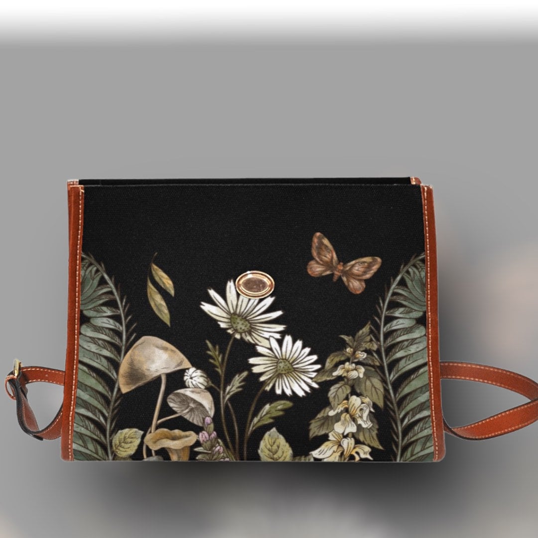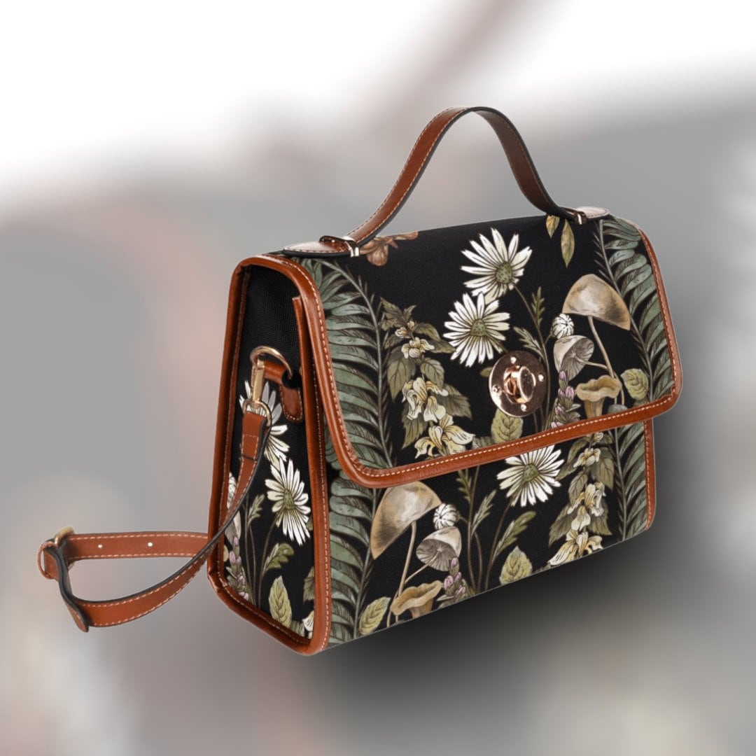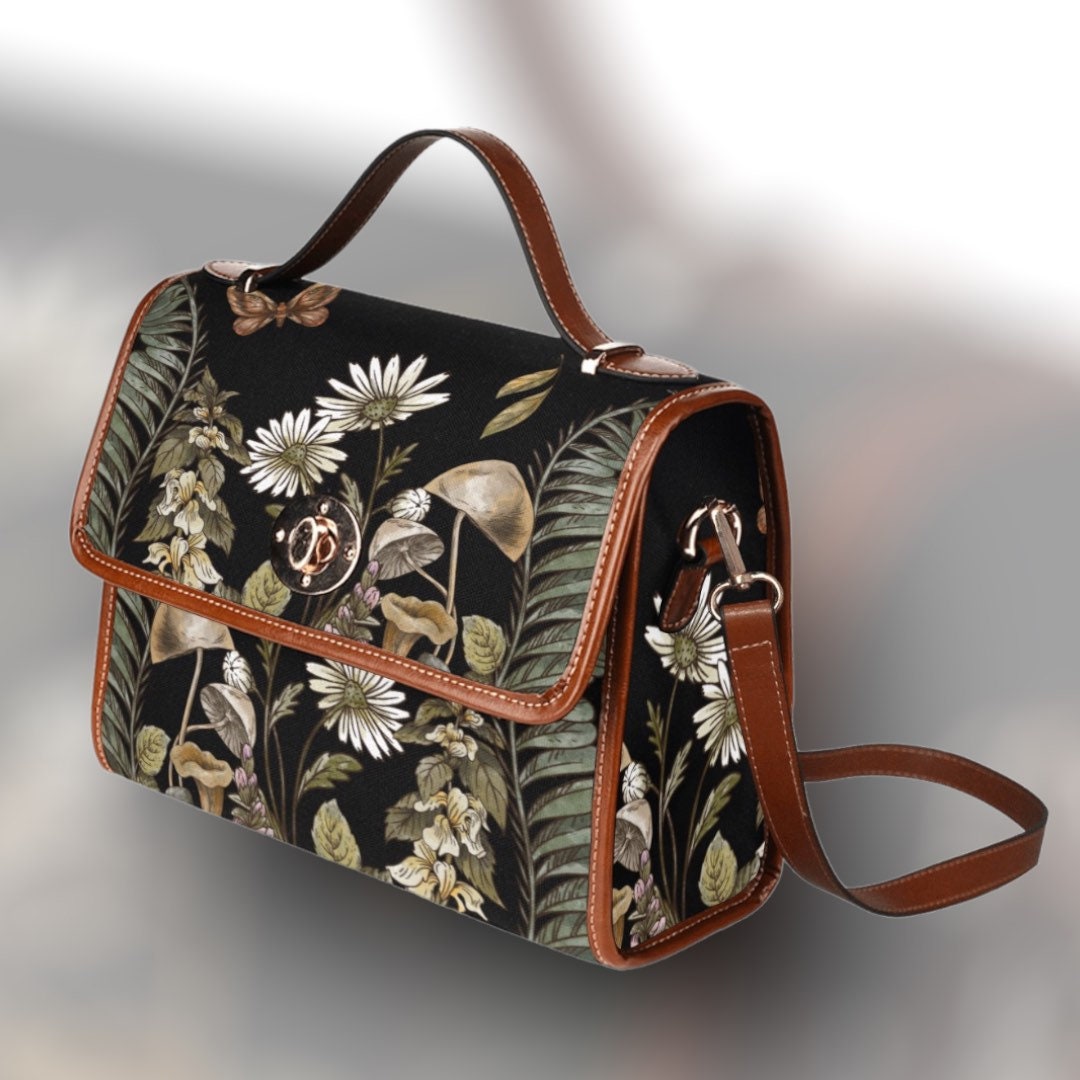 Black kawaii witch Forest Cottagecore Canvas Satchel bag, witchy bag for women, cute vegan leather strap hand bag boho bag hippies boho gift