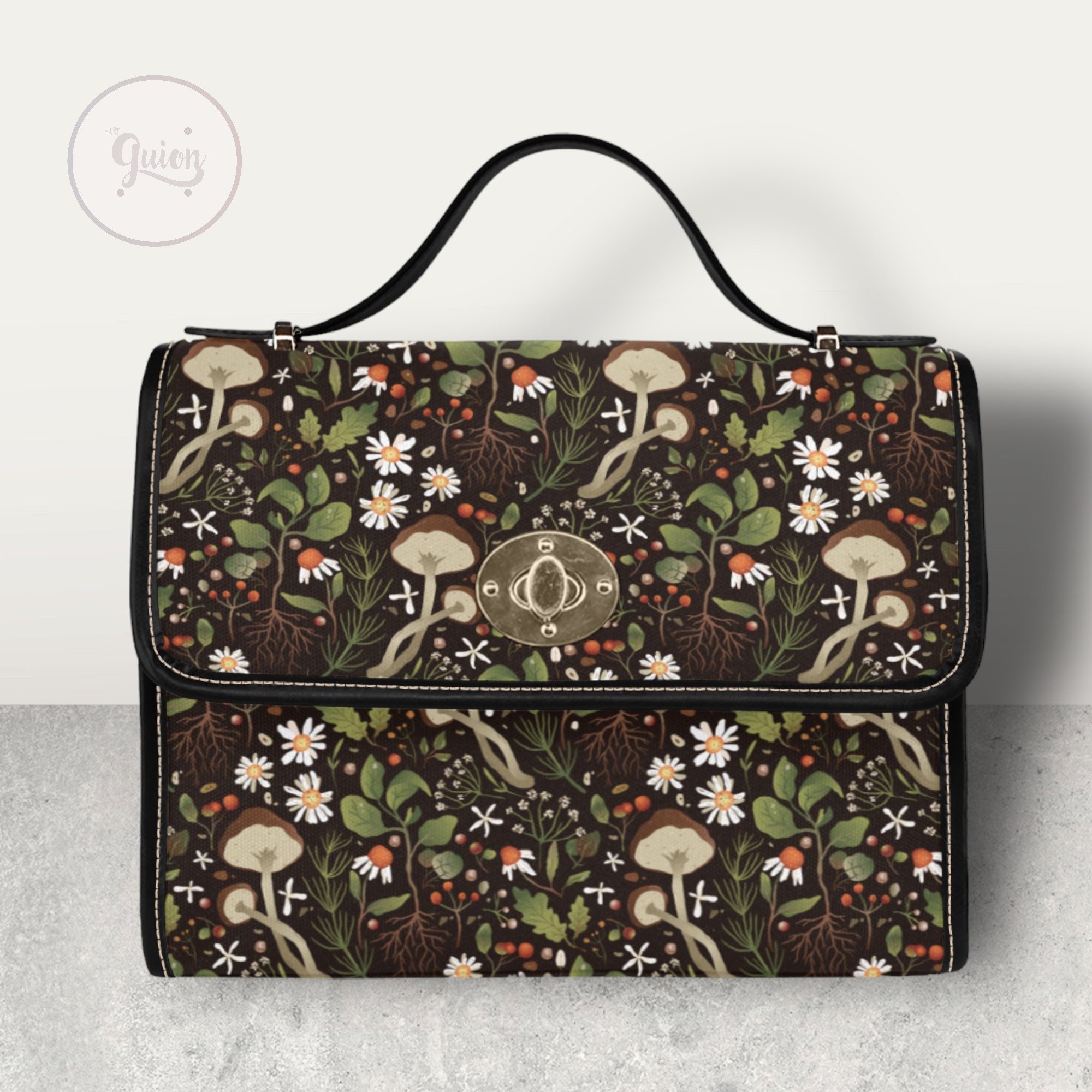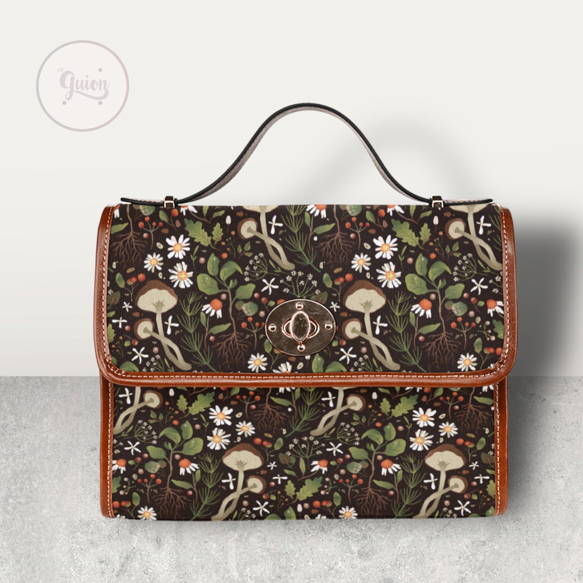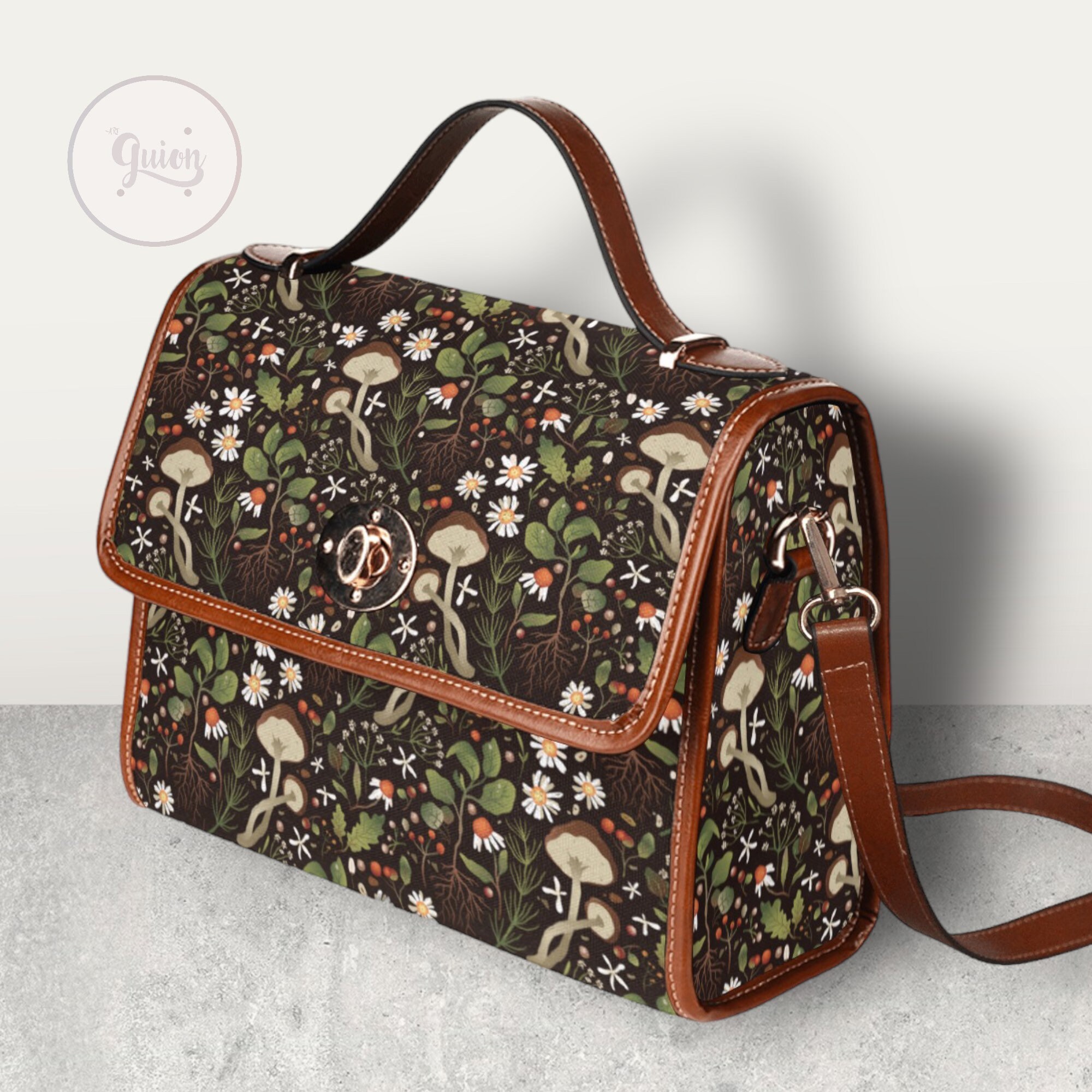 Green Mushroom Forest Canvas Satchel bag, Cute women mushroom crossbody purse, cute vegan leather strap hand bag goth bag, hippies boho gift