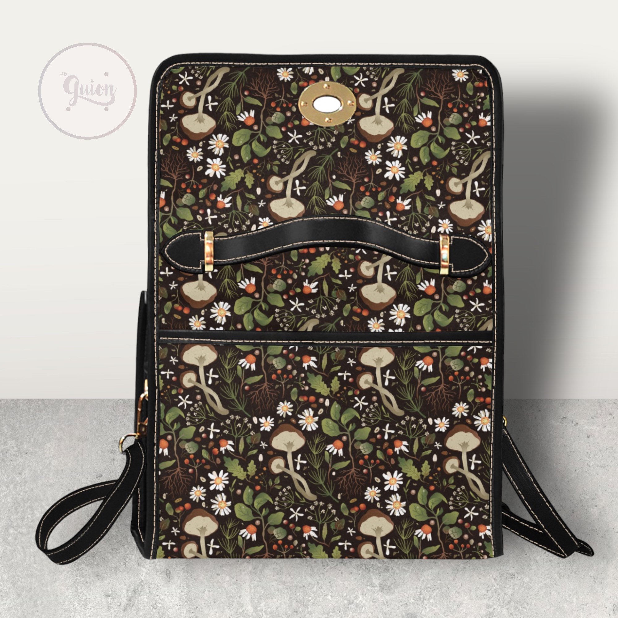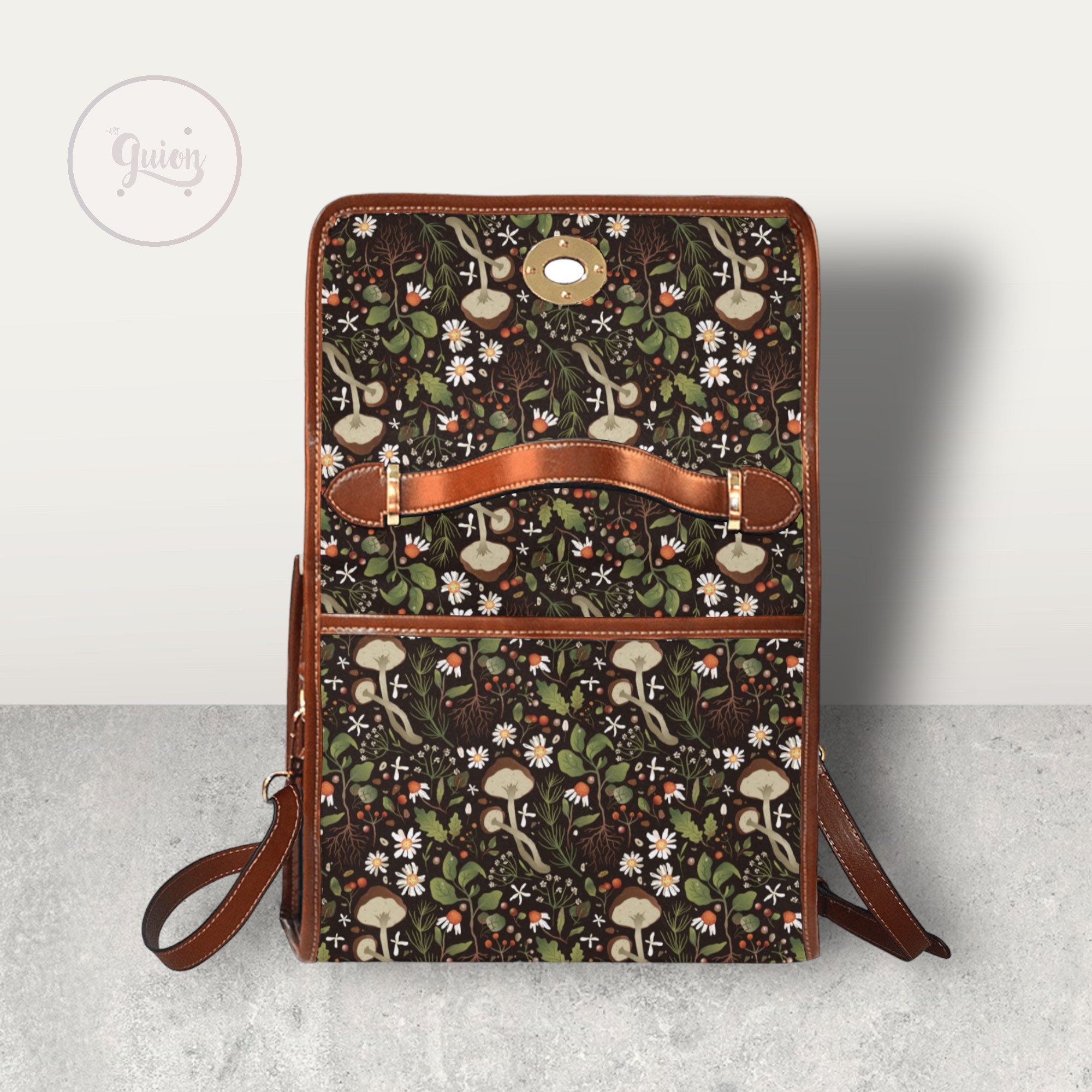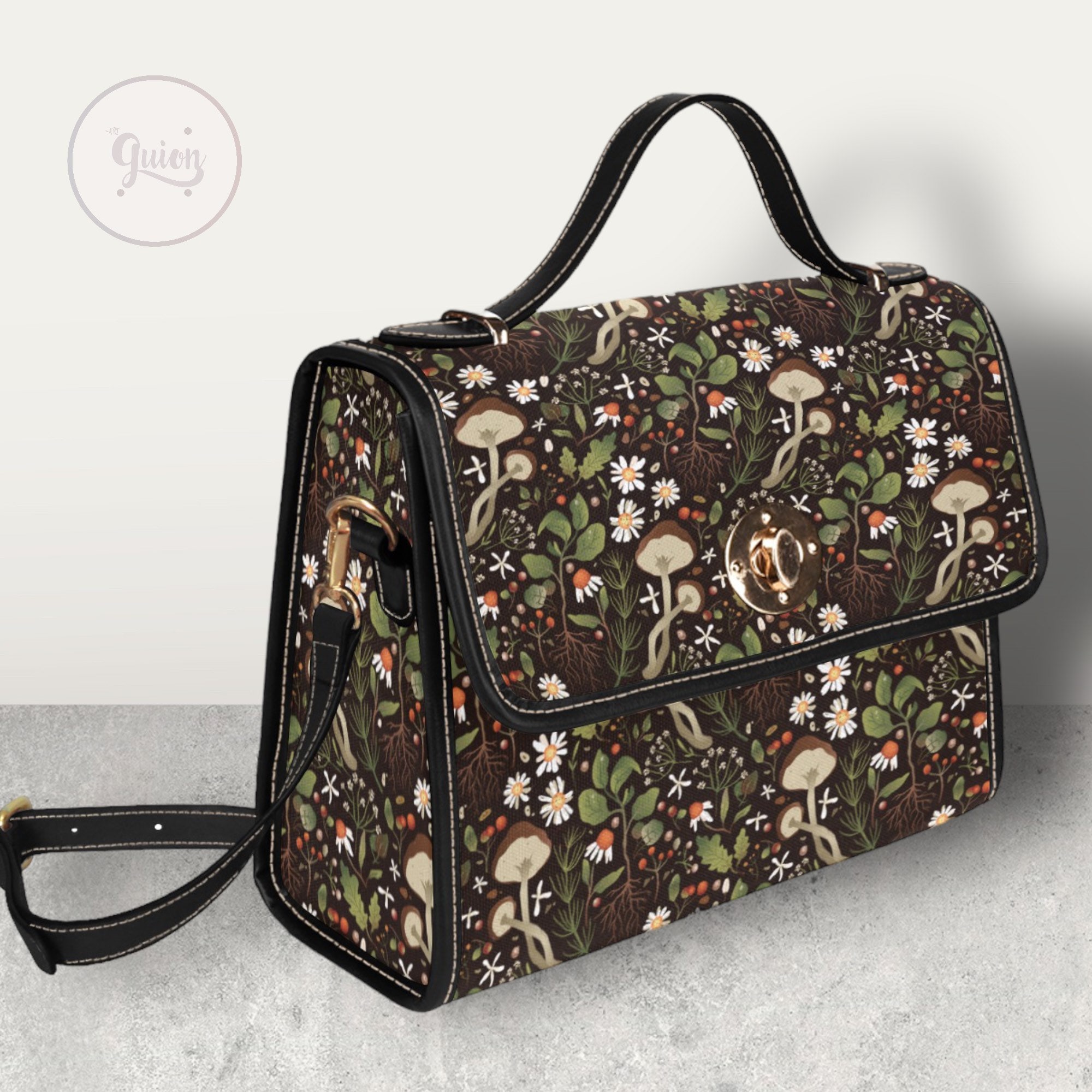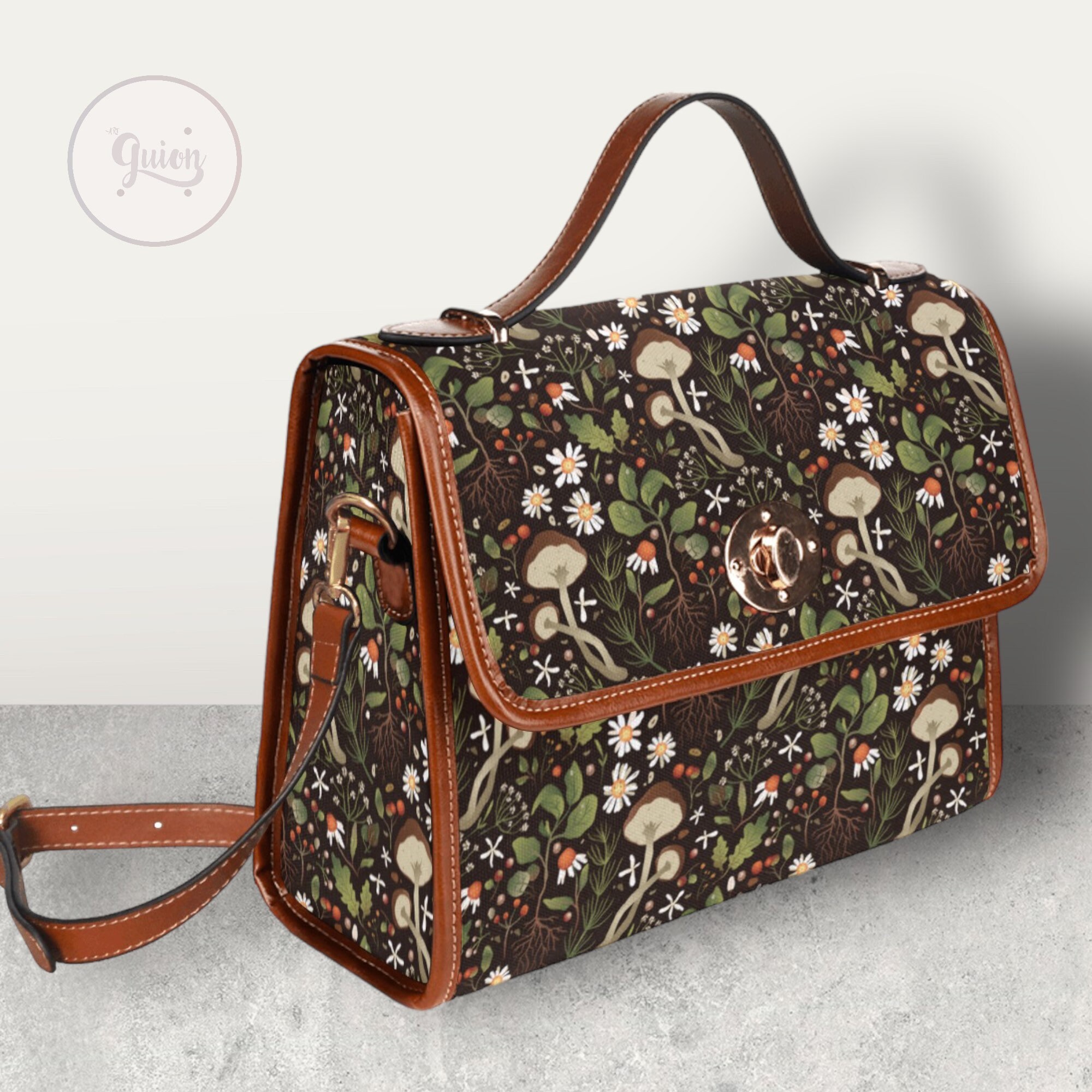Green Mushroom Forest Canvas Satchel bag, Cute women mushroom crossbody purse, cute vegan leather strap hand bag goth bag, hippies boho gift