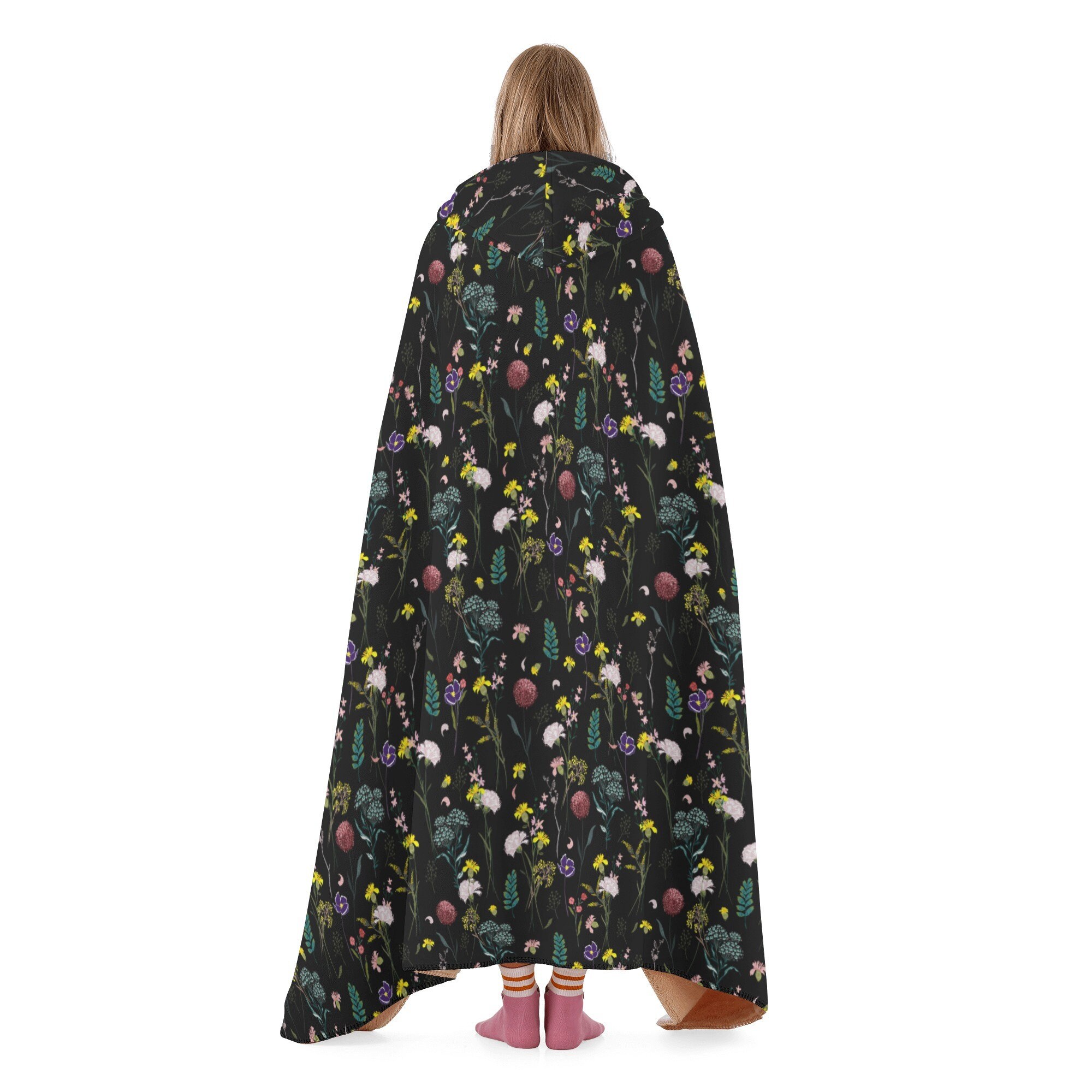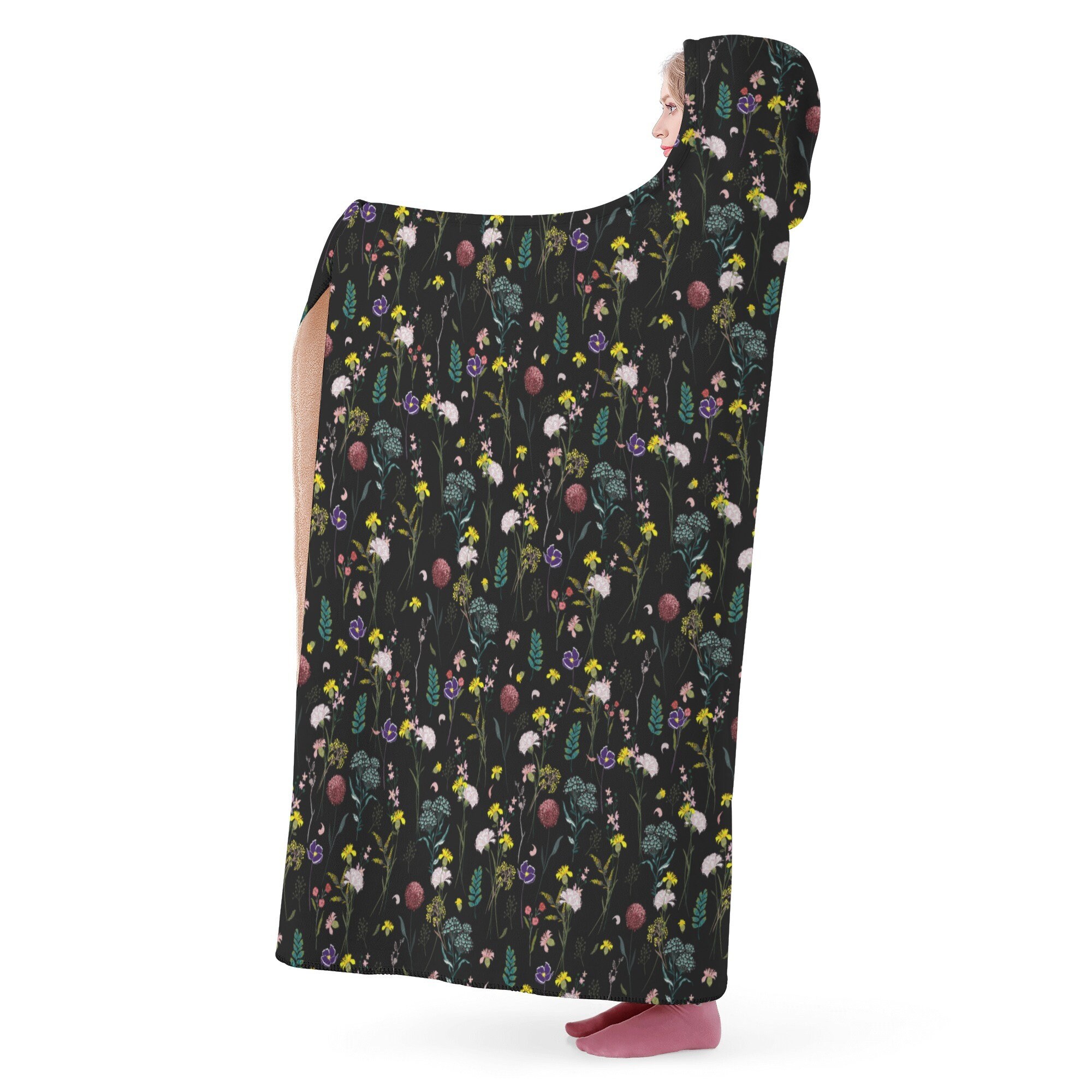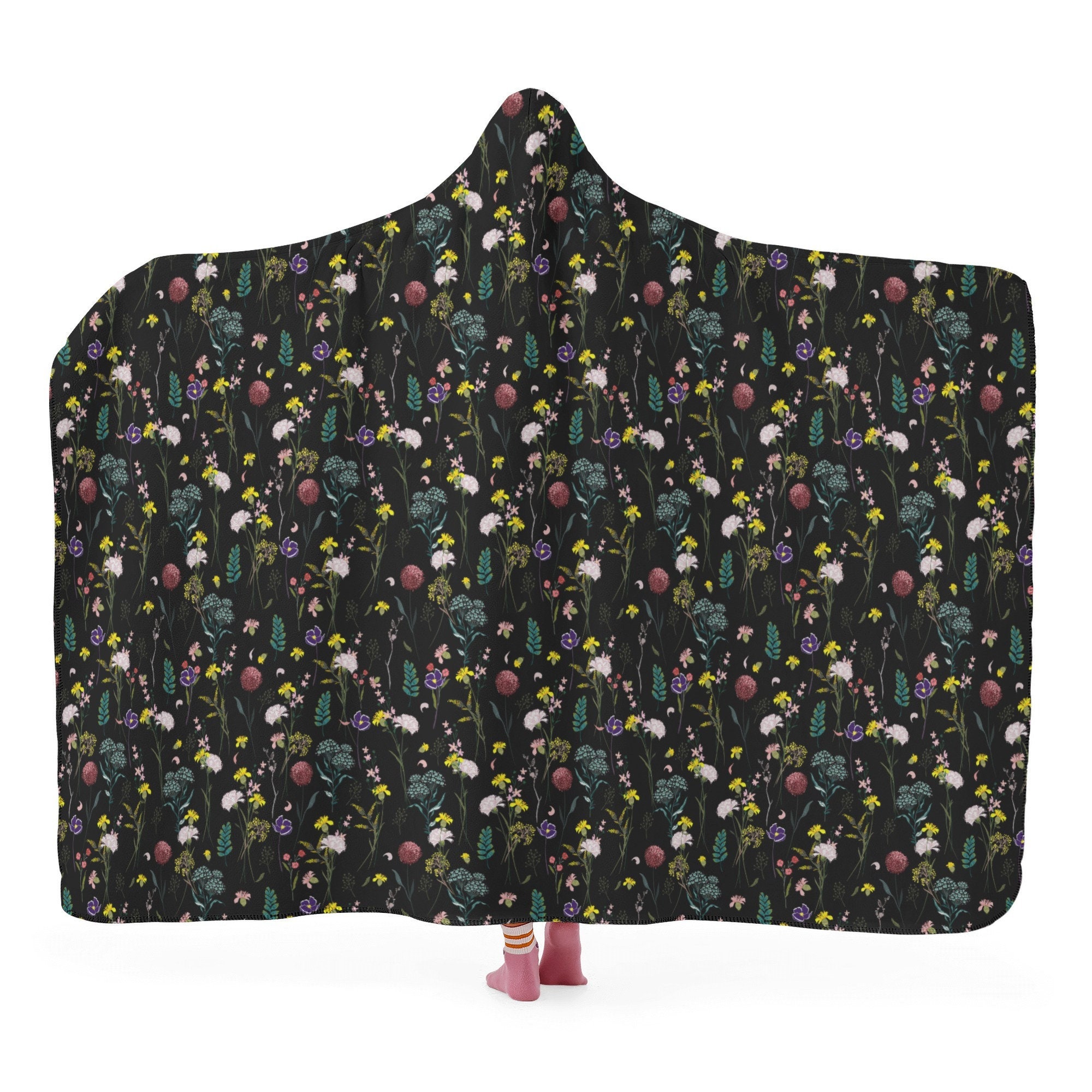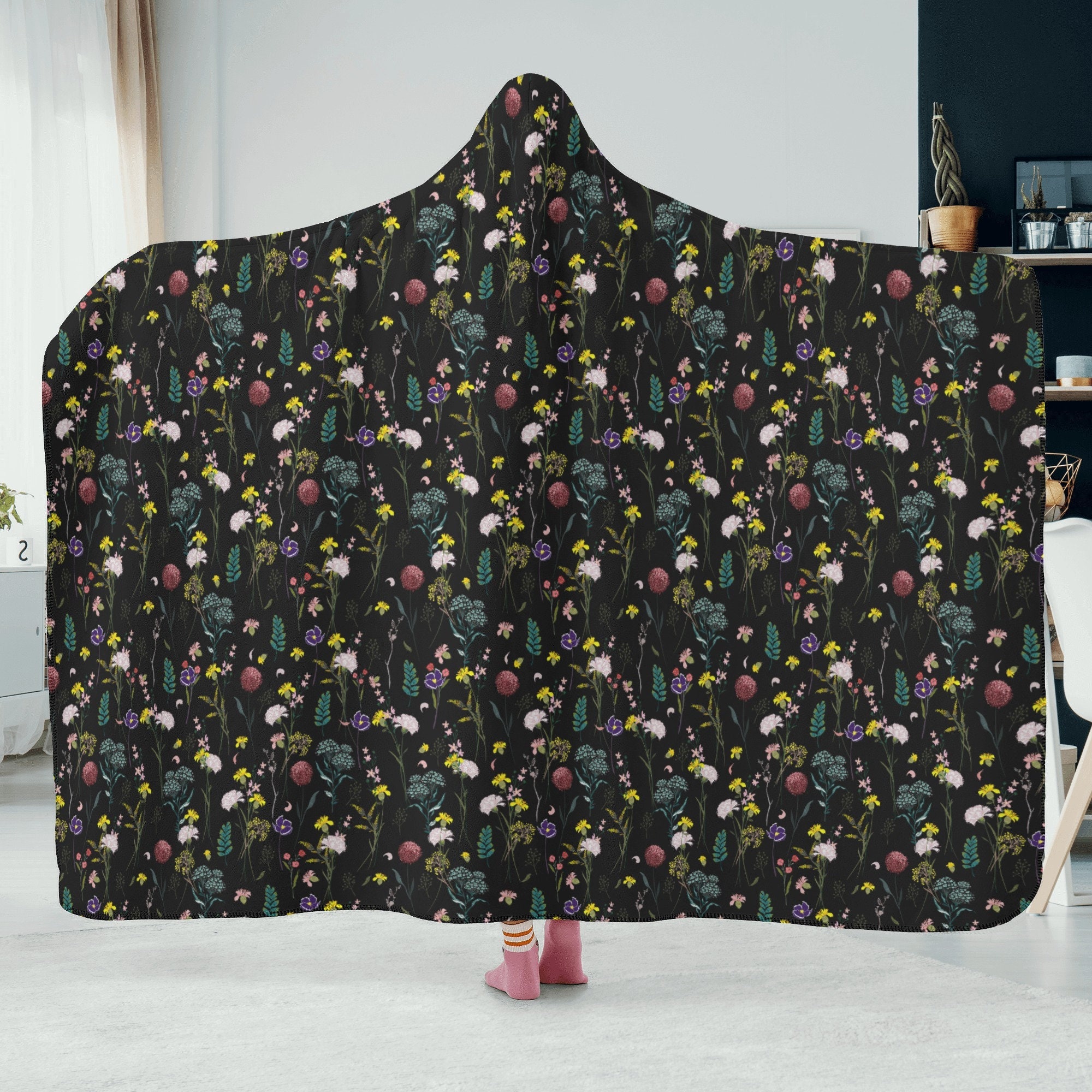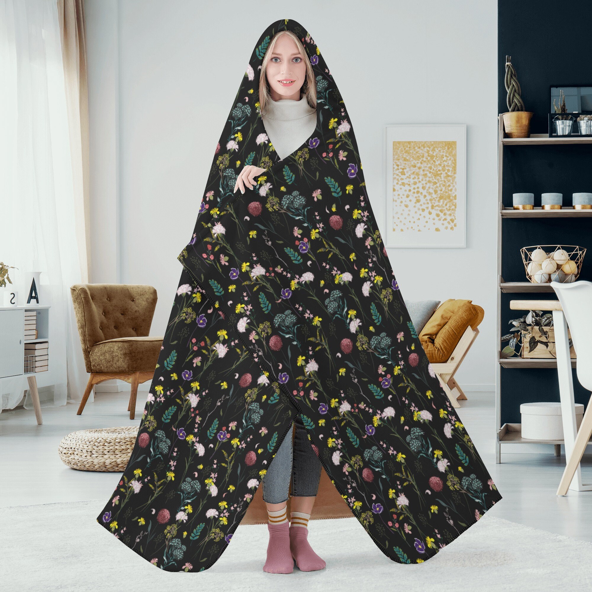 Cottagecore Floral Black Witchy Hooded Blanket, Floral Cottagecore blanket fall winter, blanket for Christmas gift Cottagecore home gift
