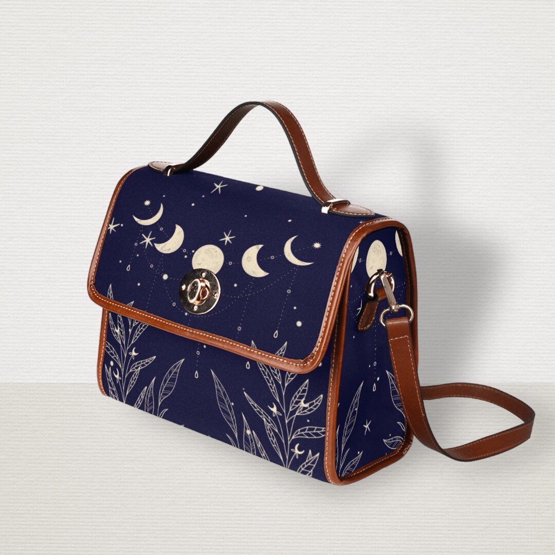 Cottagecore moon Canvas Satchel bag, Cute women navy moon crossed body purse, cute vegan leather strap hand bag goth bag, hippies boho gift