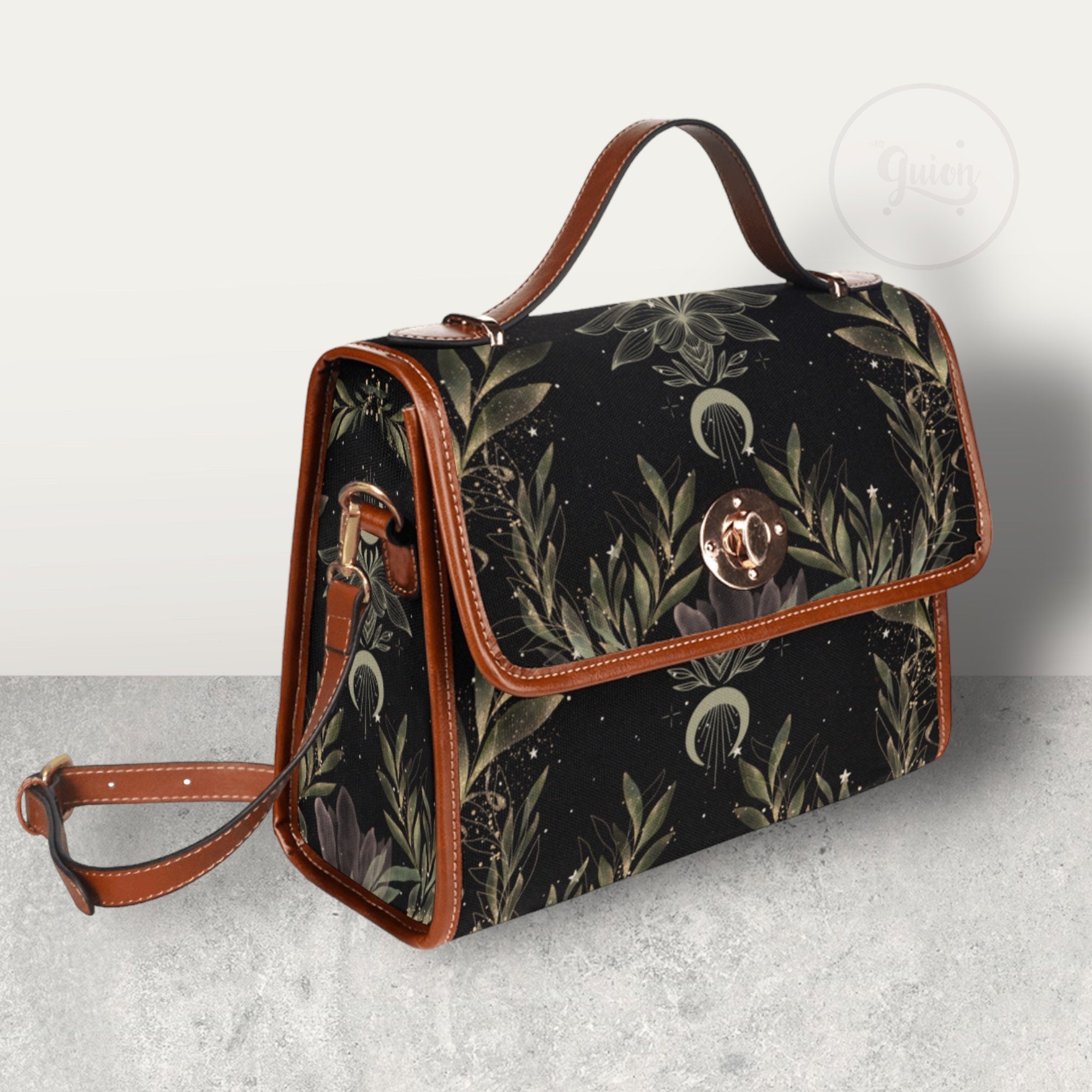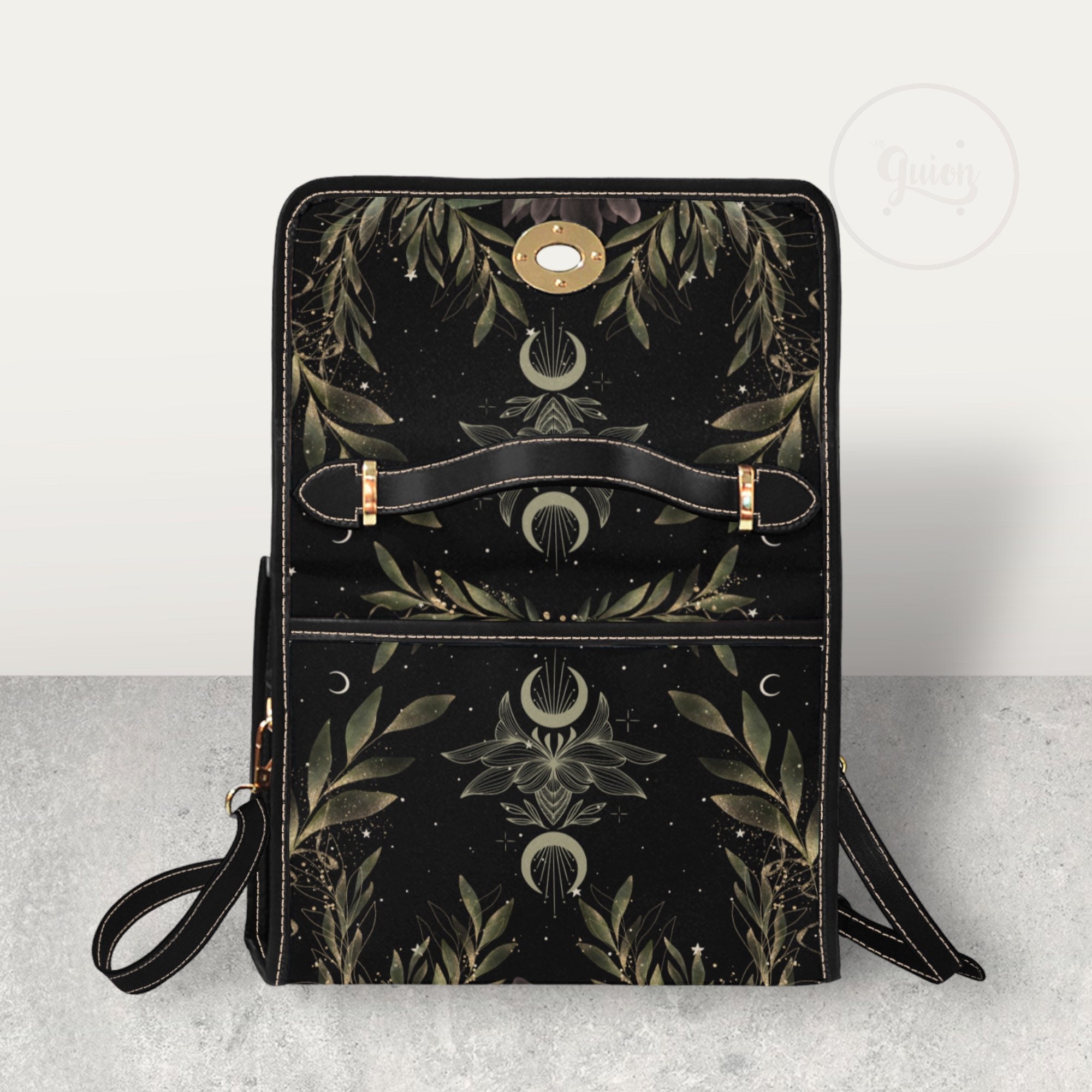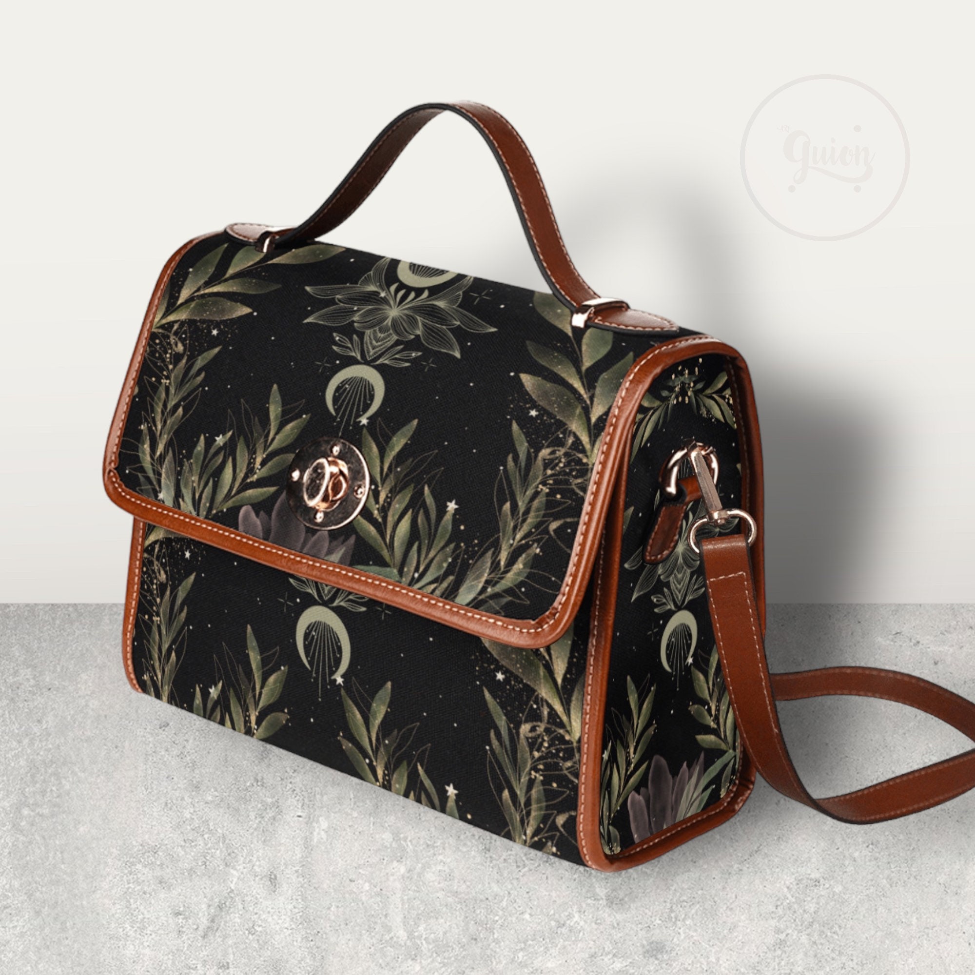 Cottagecore Magic Fern Green Watercolor Witch bag, boho cottage Dark academia Black Vegan leather handbag, goblincore handbag, boho hippies