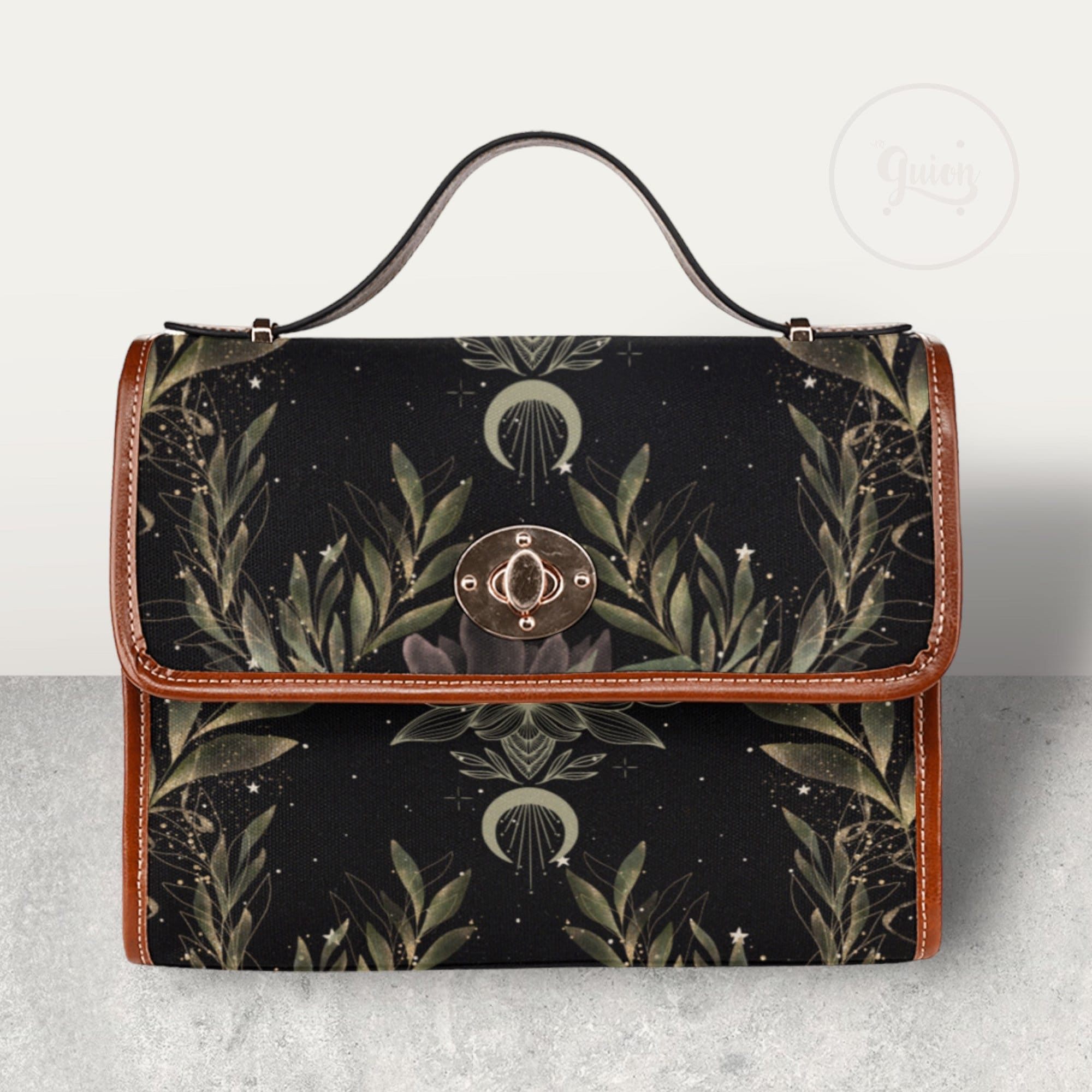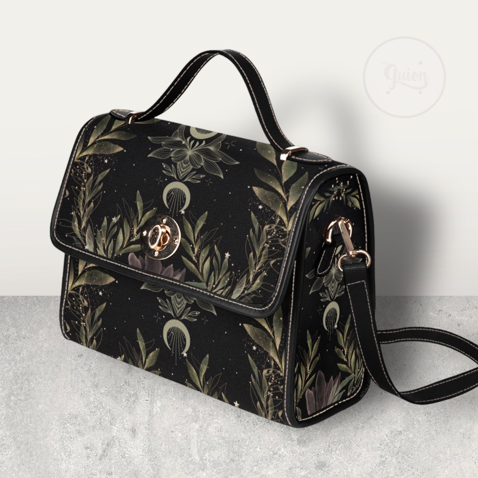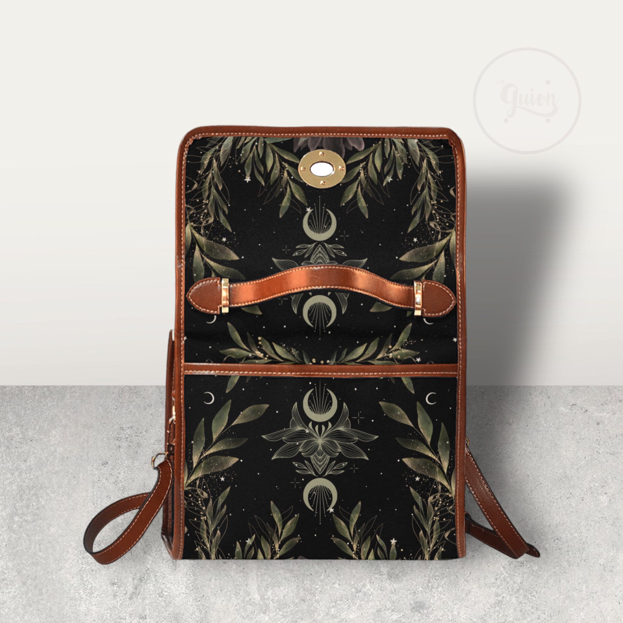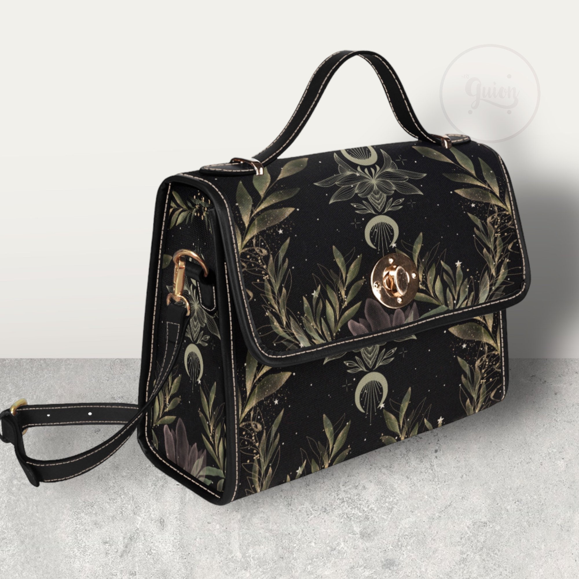 Cottagecore Magic Fern Green Watercolor Witch bag, boho cottage Dark academia Black Vegan leather handbag, goblincore handbag, boho hippies
