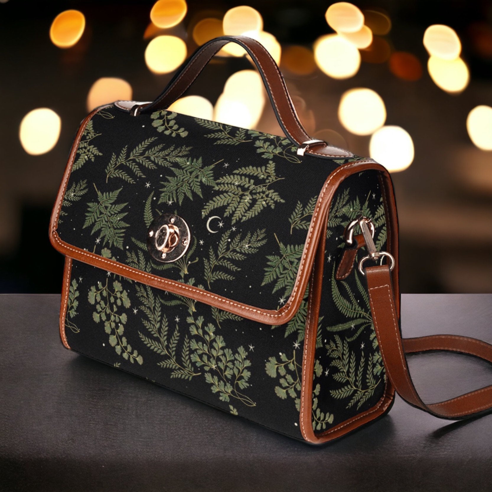 Boho Fern forest Black Canvas Satchel bag, Green crossbody Moon purse, Cute Vegan leather strap Dark Cottagecore adjustable strap handbag