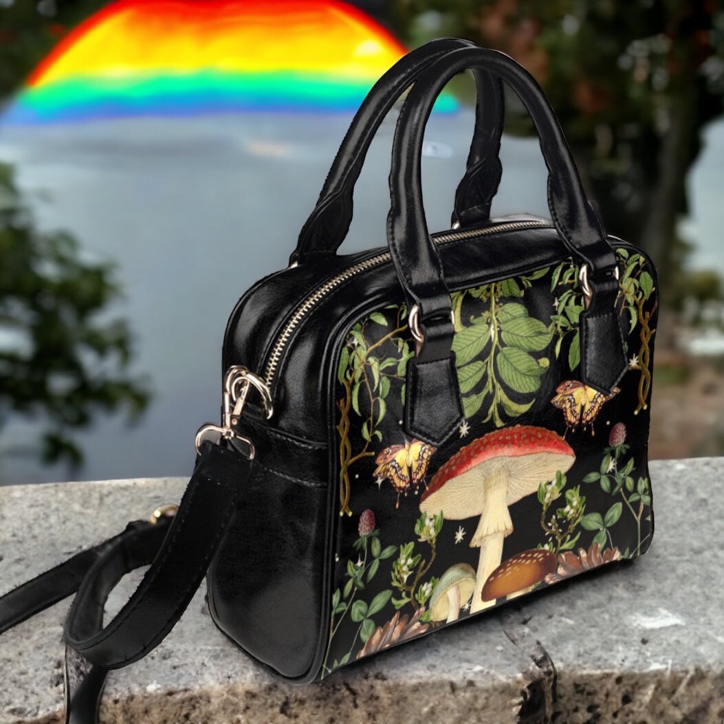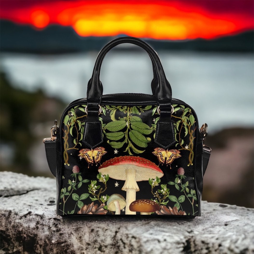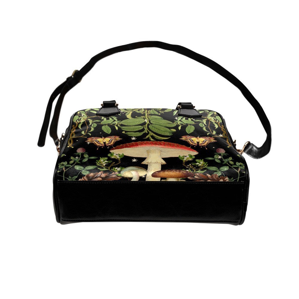 Boho Mushroom Boranical Cottagecore magic boho bowler handbag, green floral aesthetic bag, Cute PU Vegan leather shoulder strap purse bag
