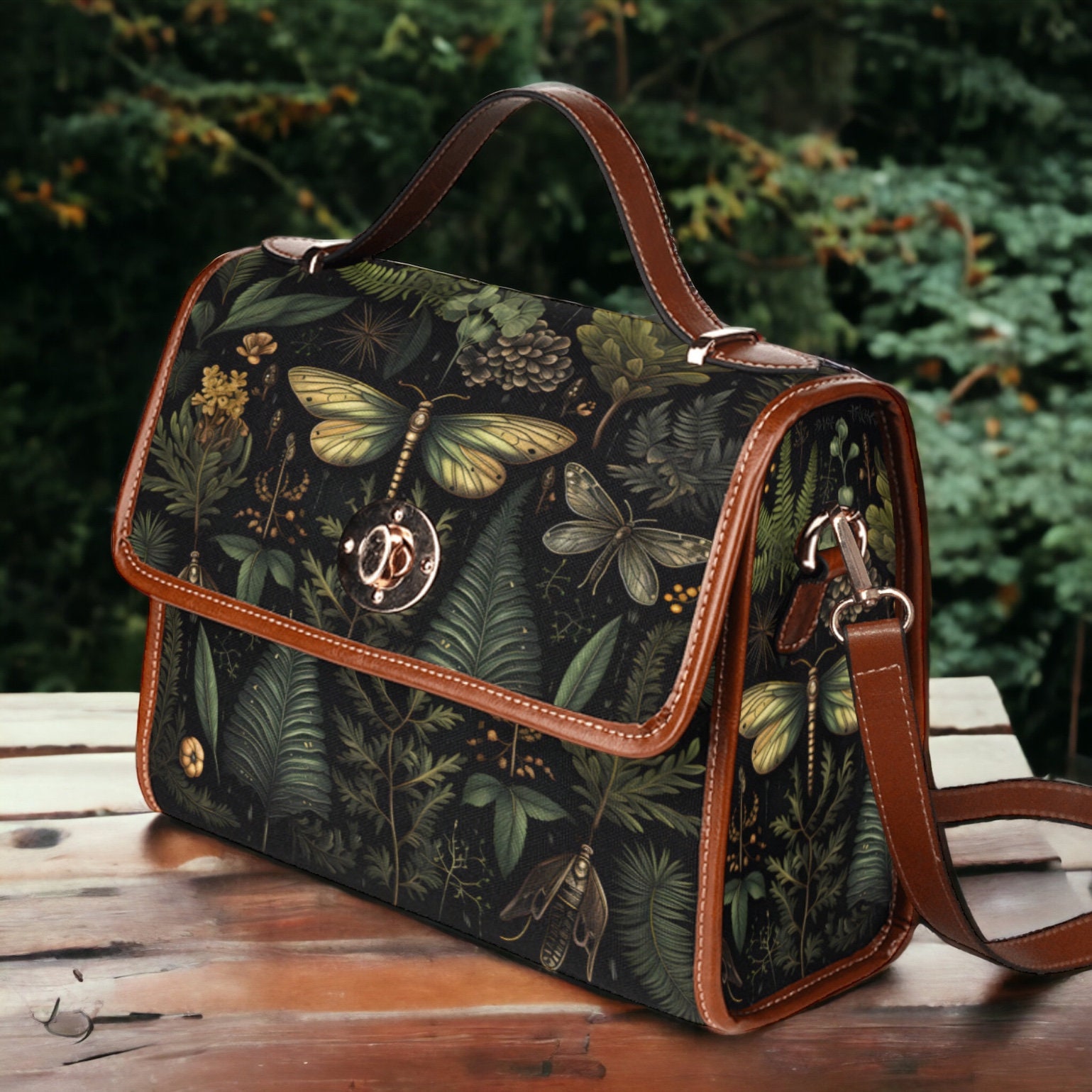 Butterfly Botanical Ferns Canvas Satchel bag, cottagecore forest women purse, cute vegan leather strap handbag boho bag, hippies boho gift