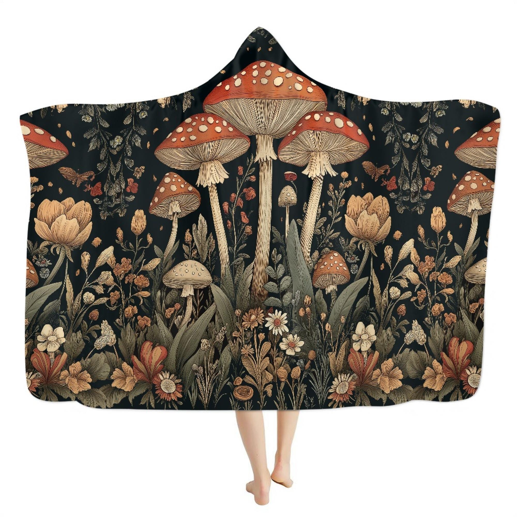 Cottagecore Mushroom Forest hooded blanket, Enchanted Forest Witchy lounging cozy blanket throw, Fairycore Boho hooded cloak Cape Blanket