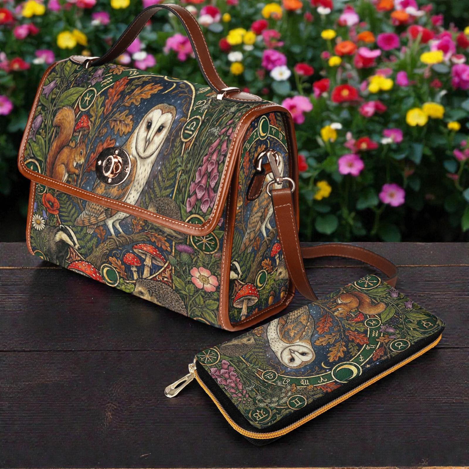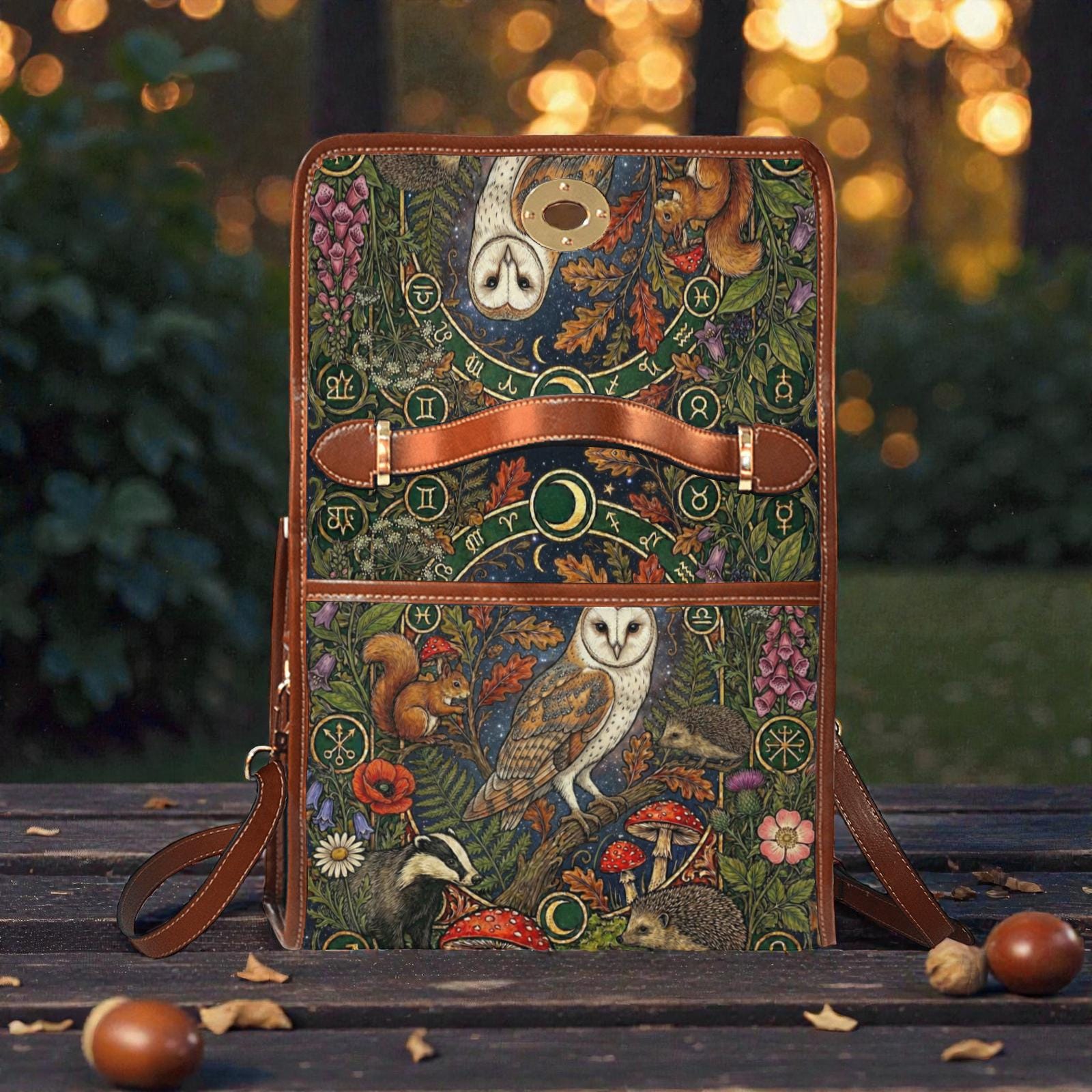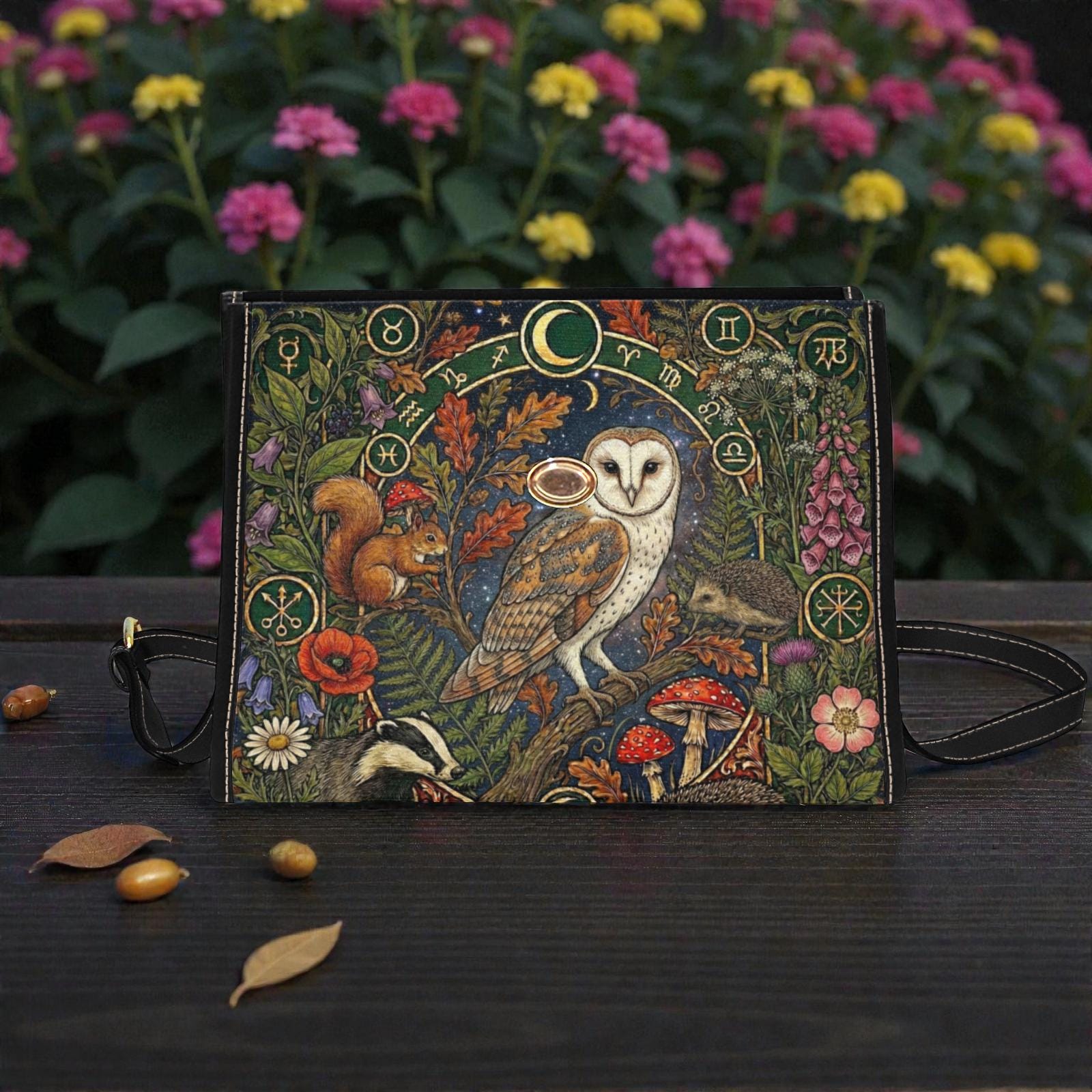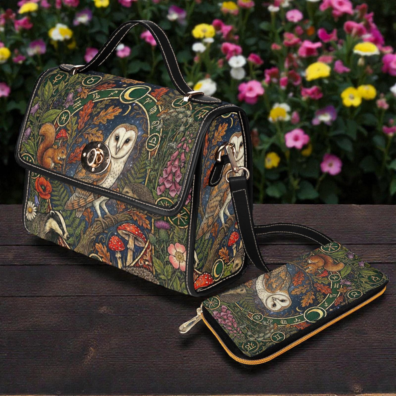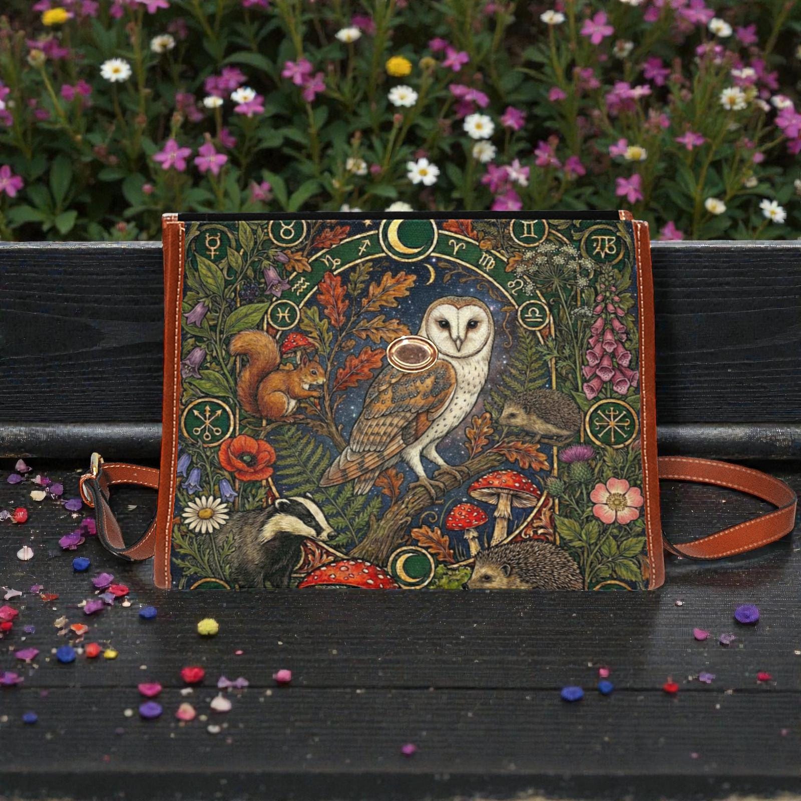 Mystic Owl Moon Canvas Satchel Bag, Cottagecore Astrology Handbag, Animal Woodland Crossbody Shoulder Bag, Boho hippies gift zipper wallet