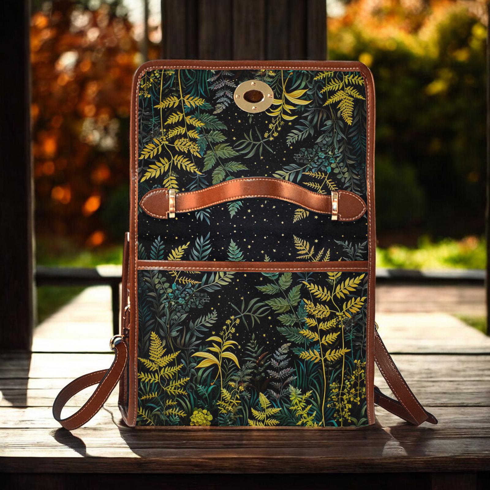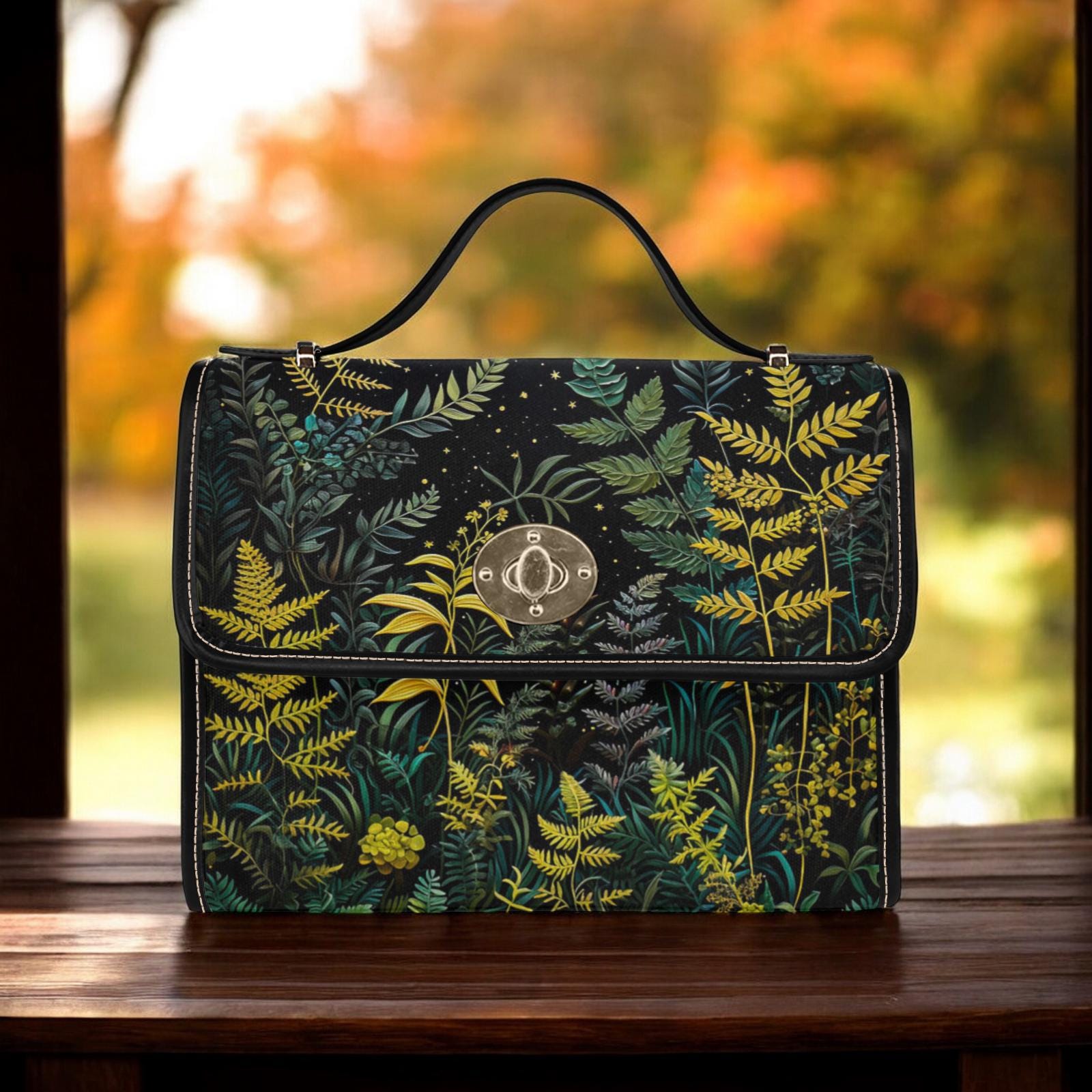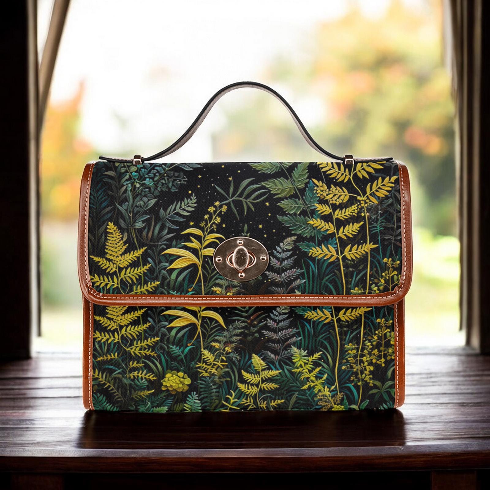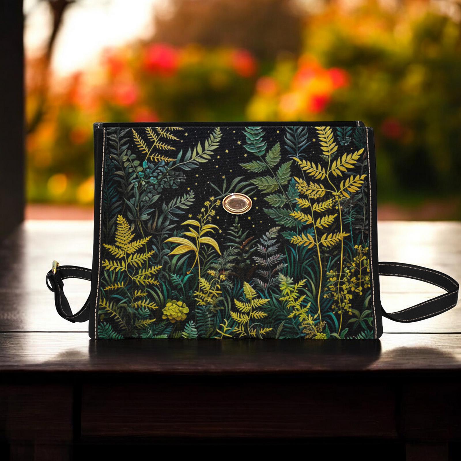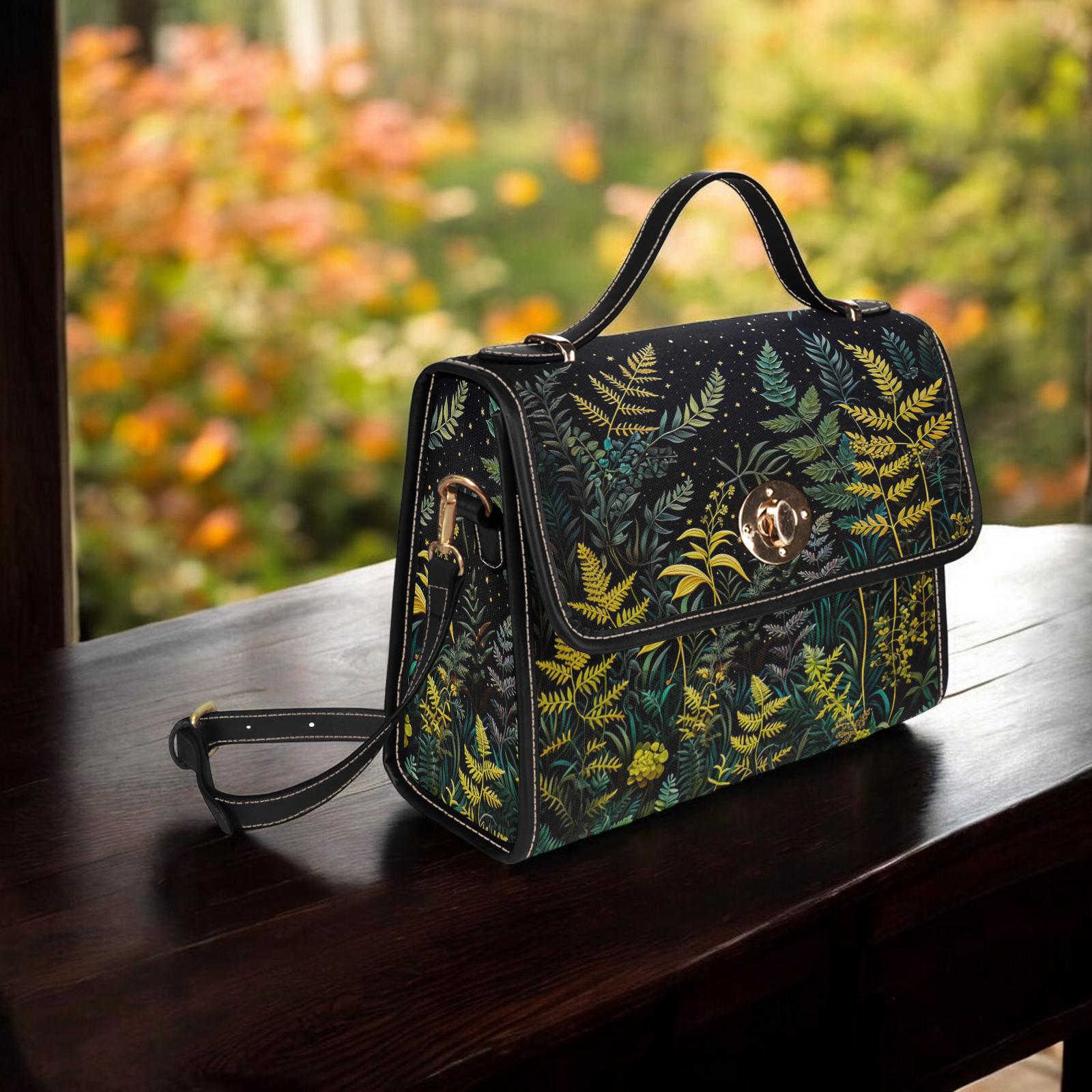 Green Boho Fern forest Canvas Satchel bag, Green crossbody Moon purse, Cute Vegan leather strap Dark Cottagecore adjustable strap handbag