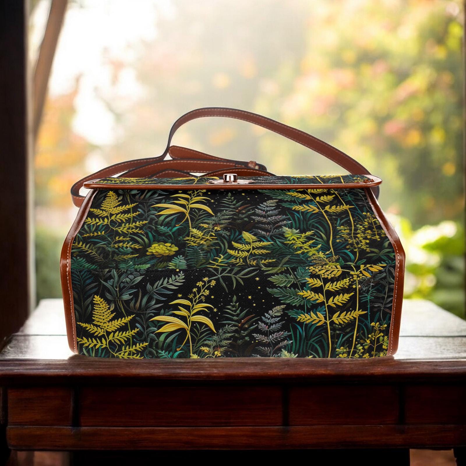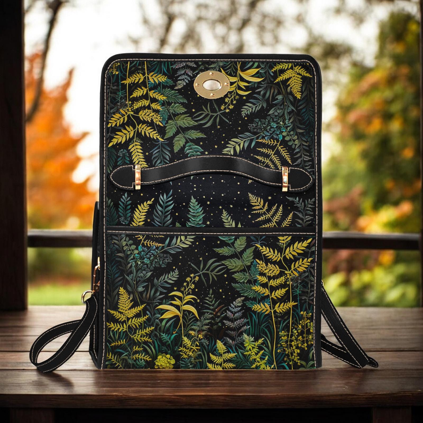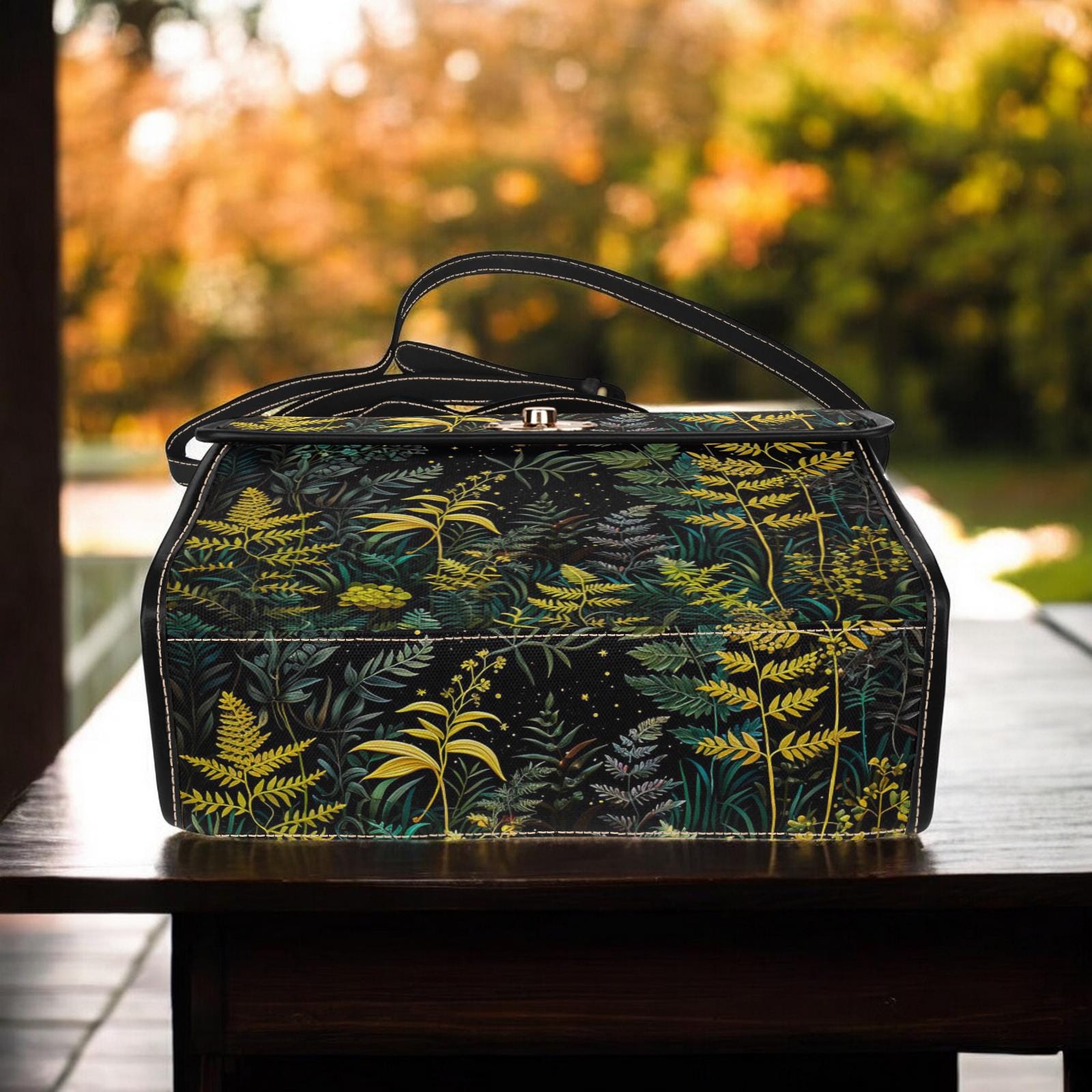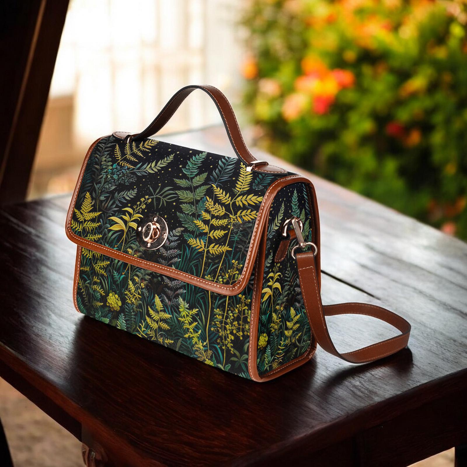 Green Boho Fern forest Canvas Satchel bag, Green crossbody Moon purse, Cute Vegan leather strap Dark Cottagecore adjustable strap handbag