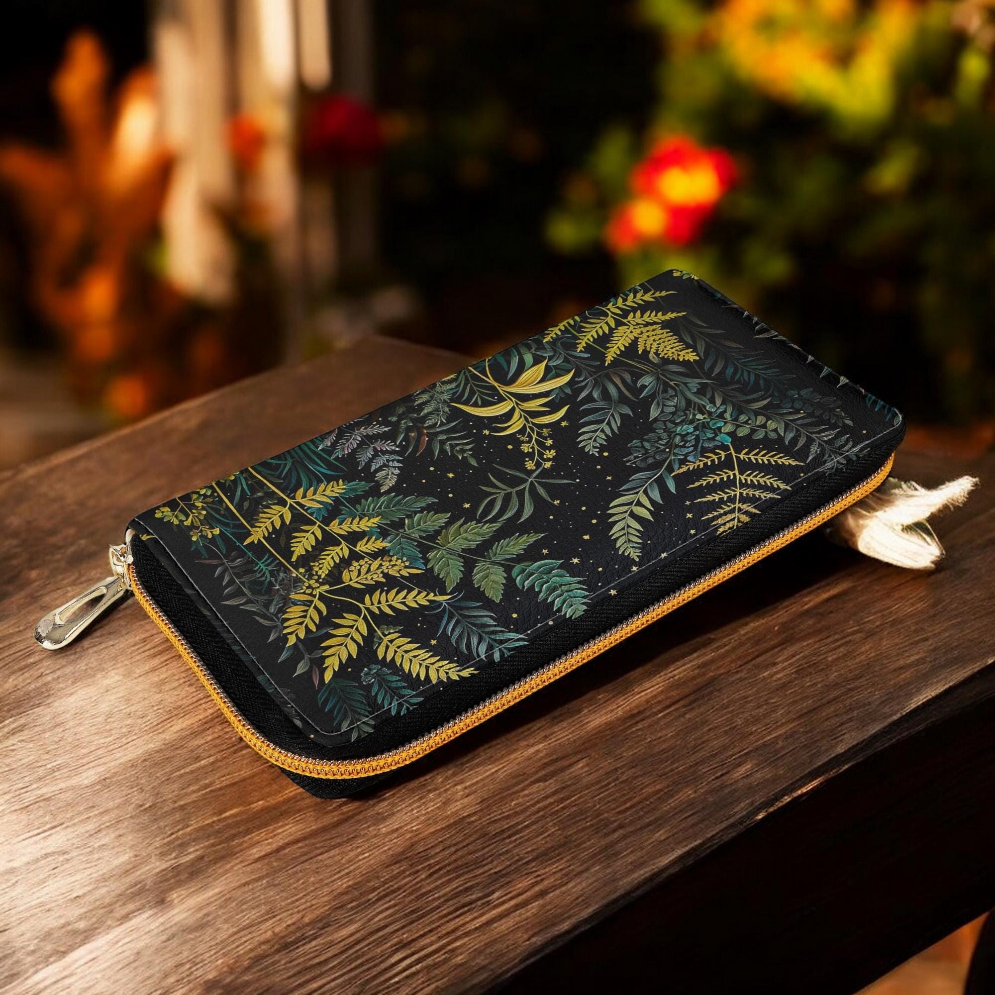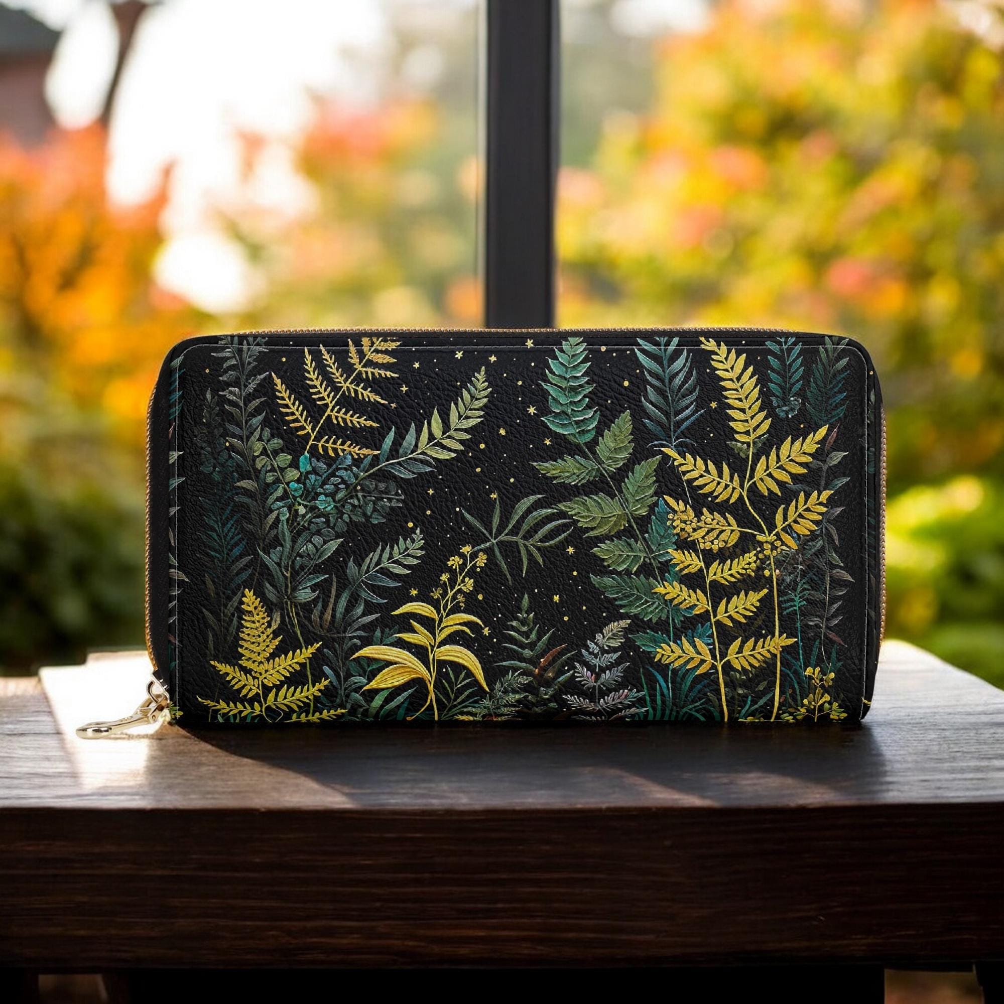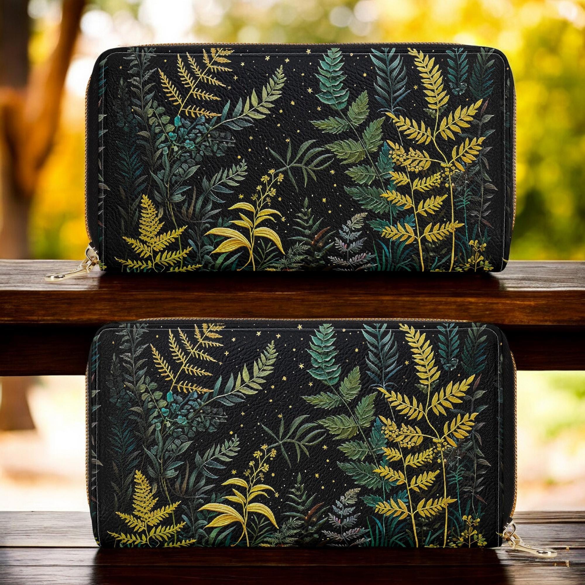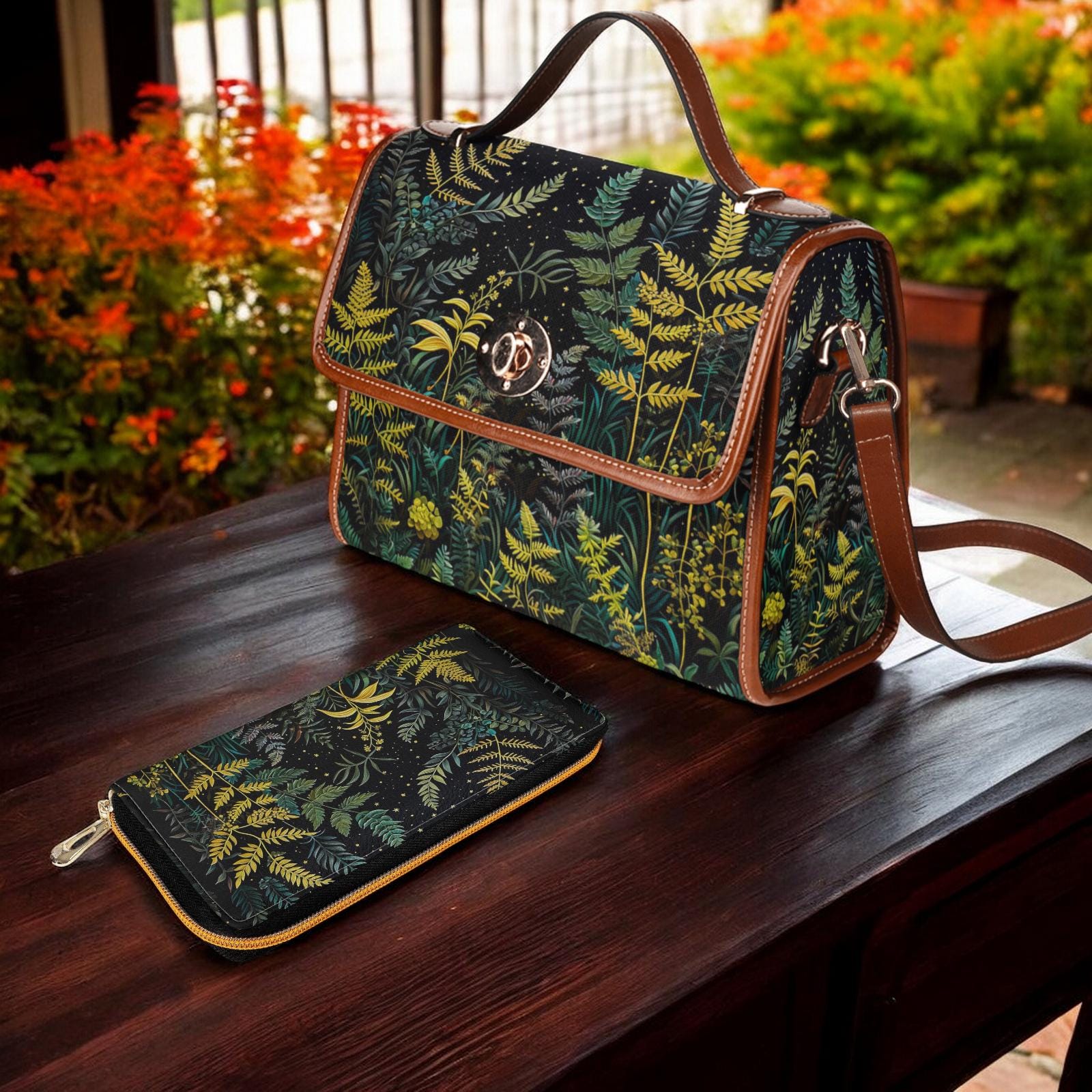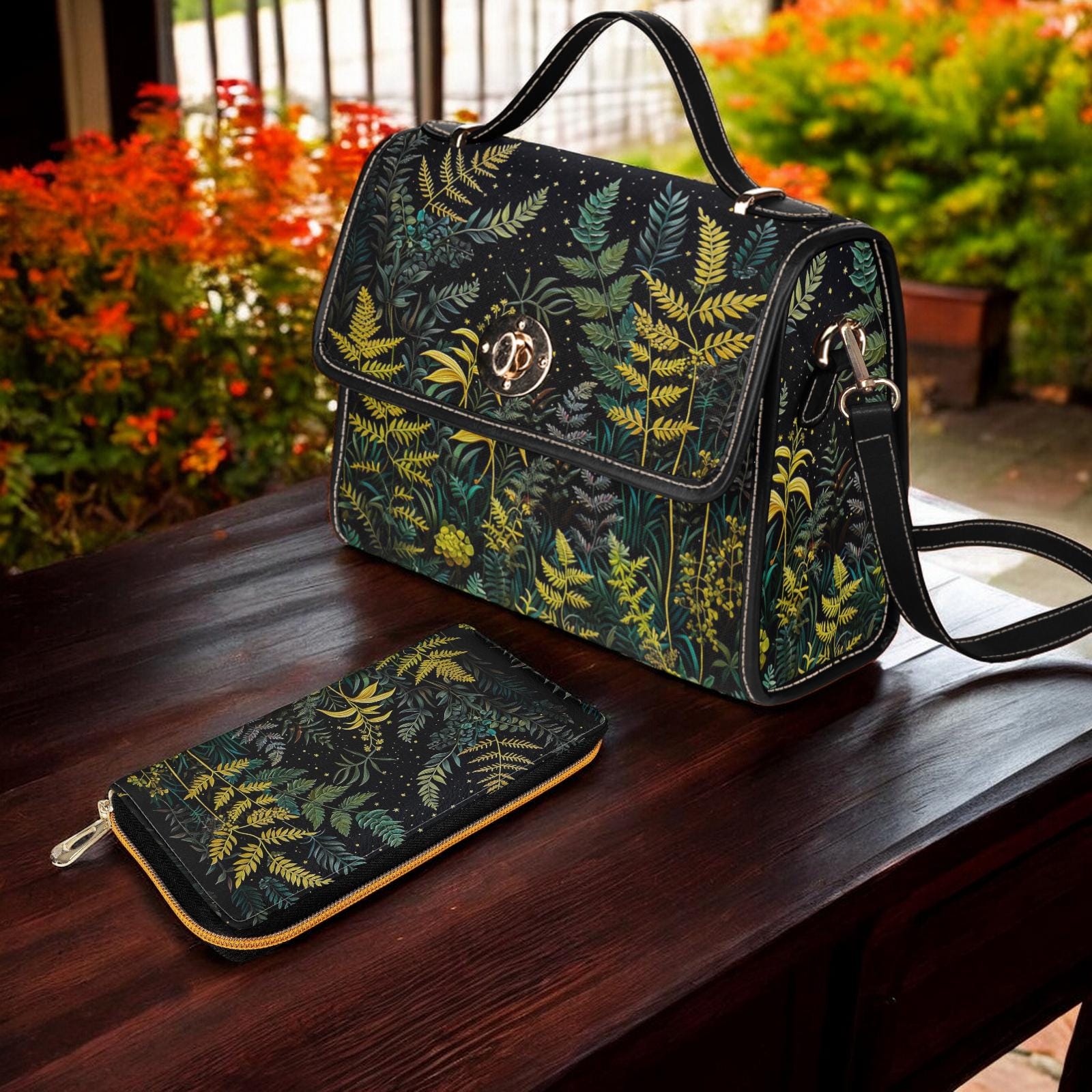 Green Boho Fern forest Canvas Satchel bag, Green crossbody Moon purse, Cute Vegan leather strap Dark Cottagecore adjustable strap handbag