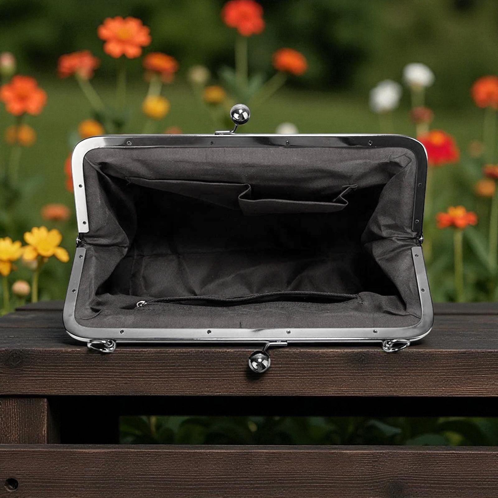This stylish kisslock bag is the perfect accessory for a variety of occasions, from elegant evening events and weddings to formal gatherings and vintage-themed parties. Its timeless design also makes it a chic choice for casual day outings, adding a touch of sophistication to any look.