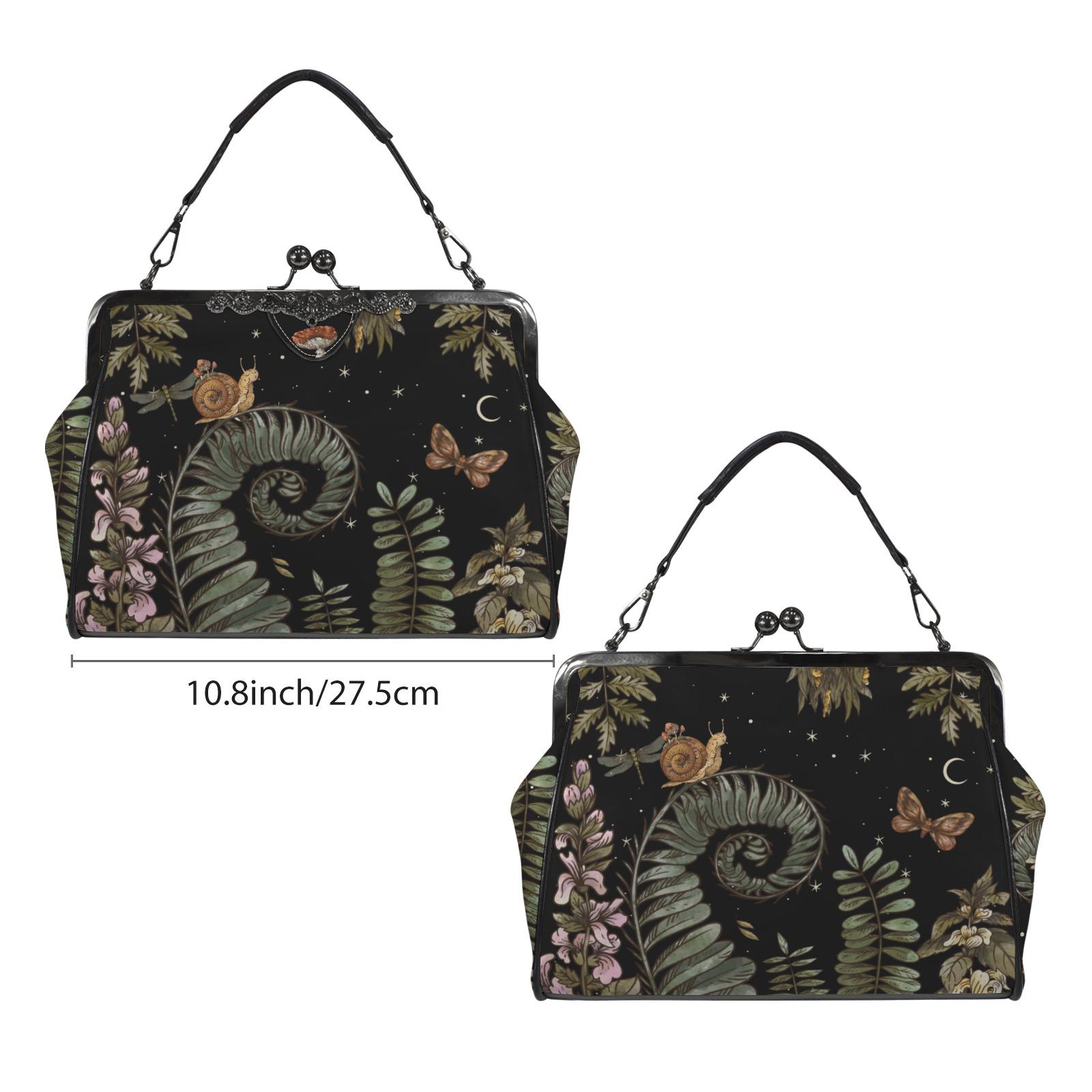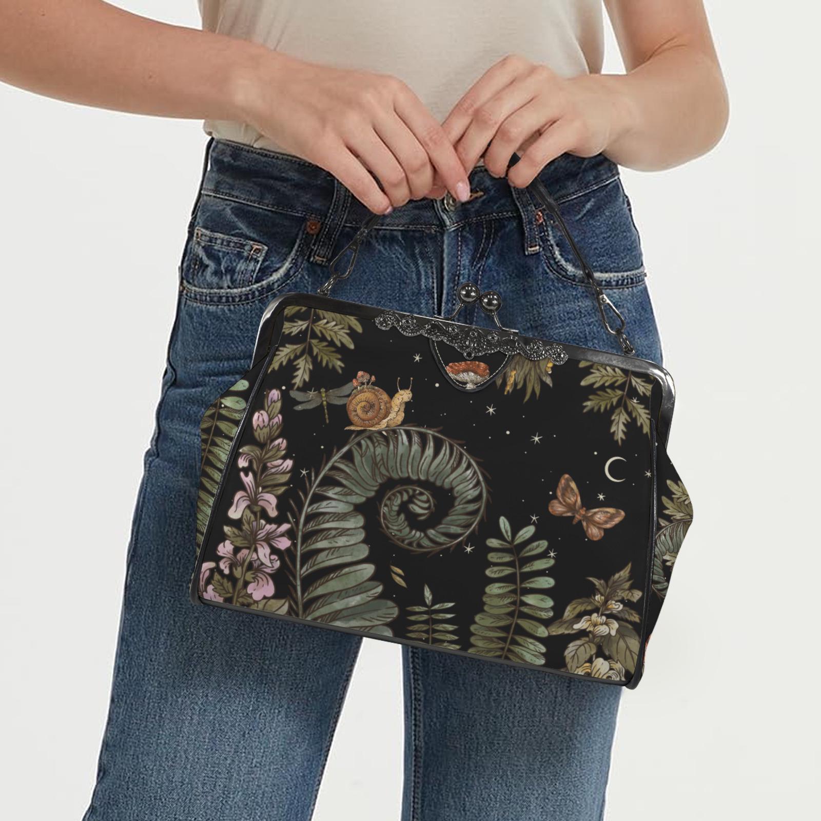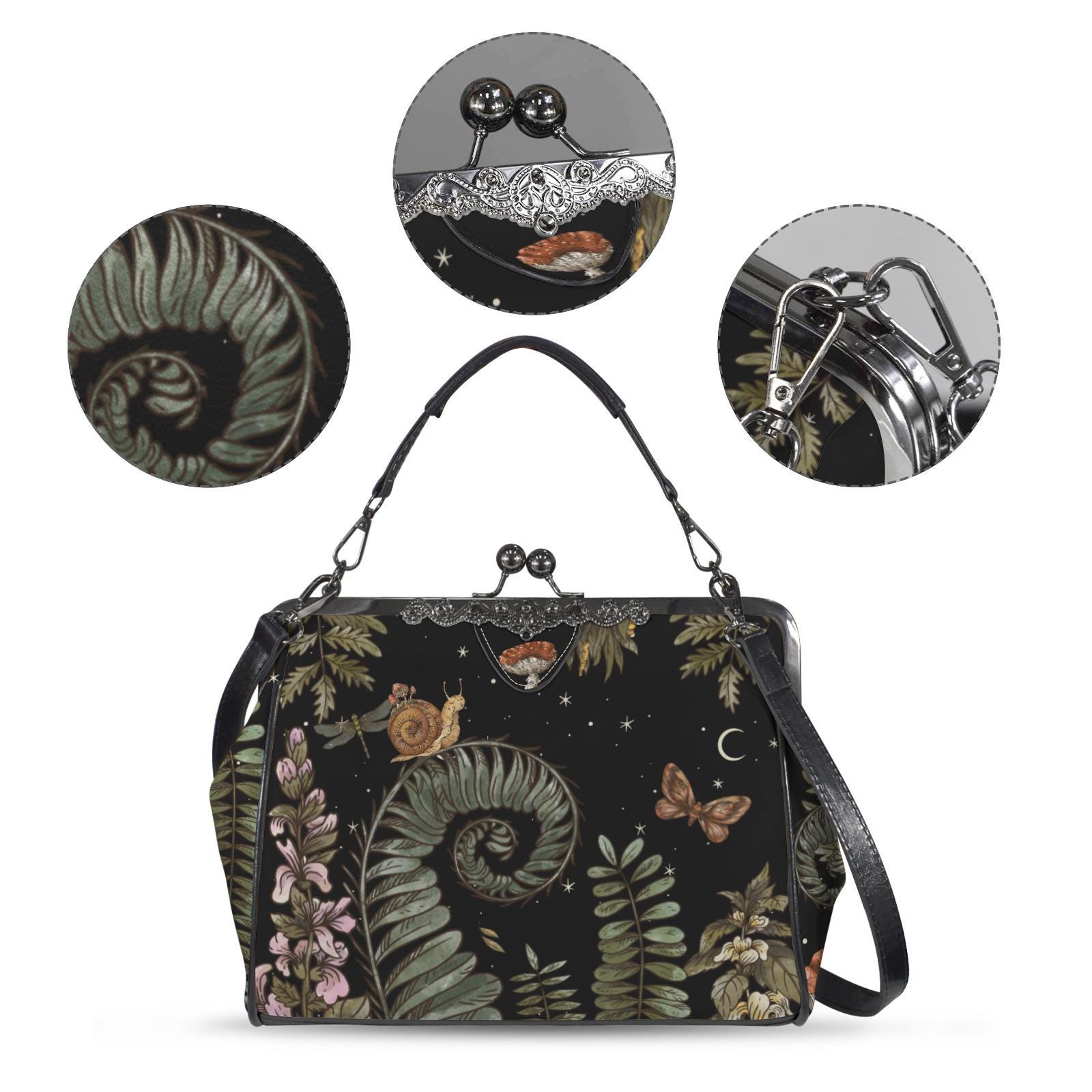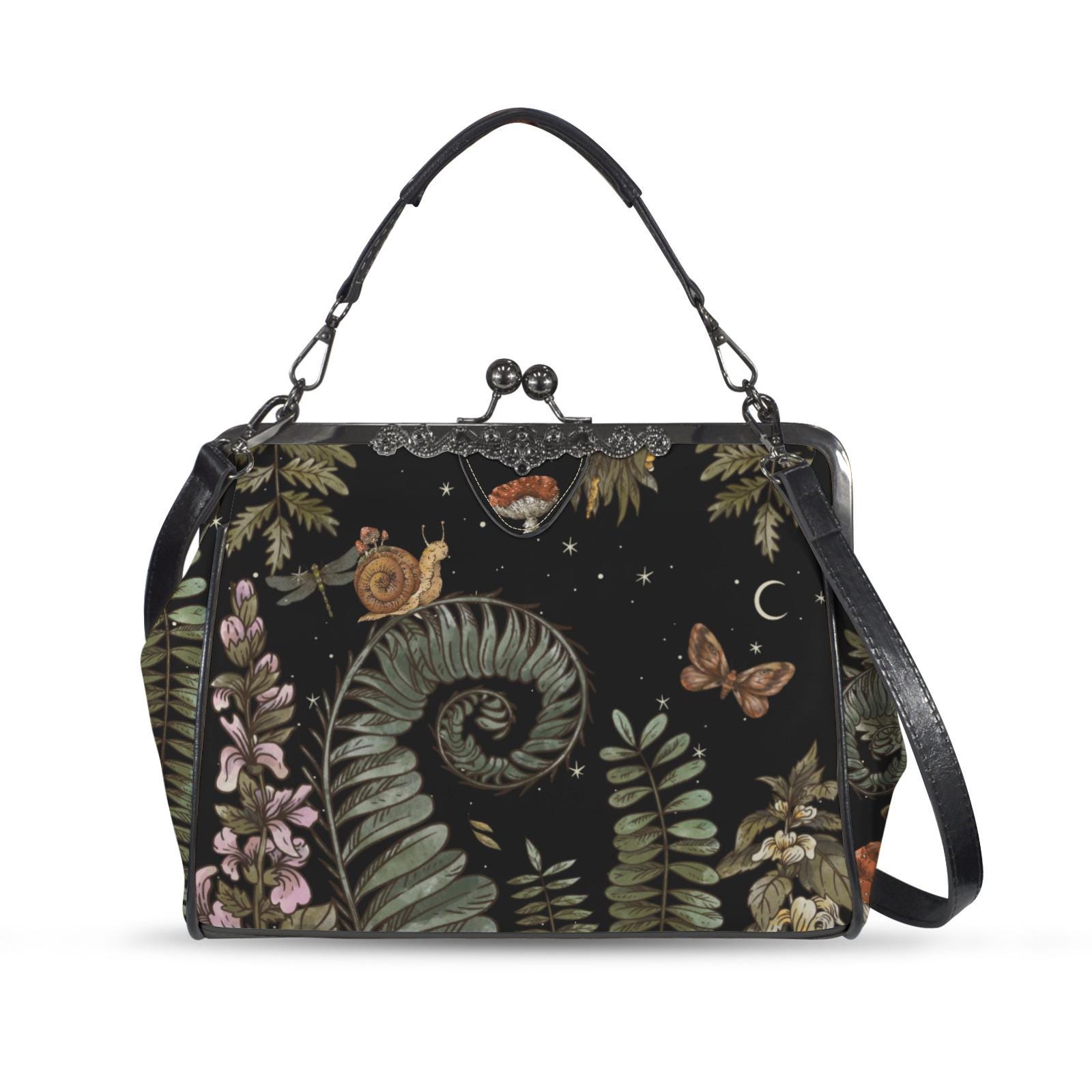 Cottagecore Forest Boho Kisslock Bag, Vegan Leather Mushroom Kisslock Purse, Witchy Crossed body Mushroom purse, goth bag, hippies boho gift