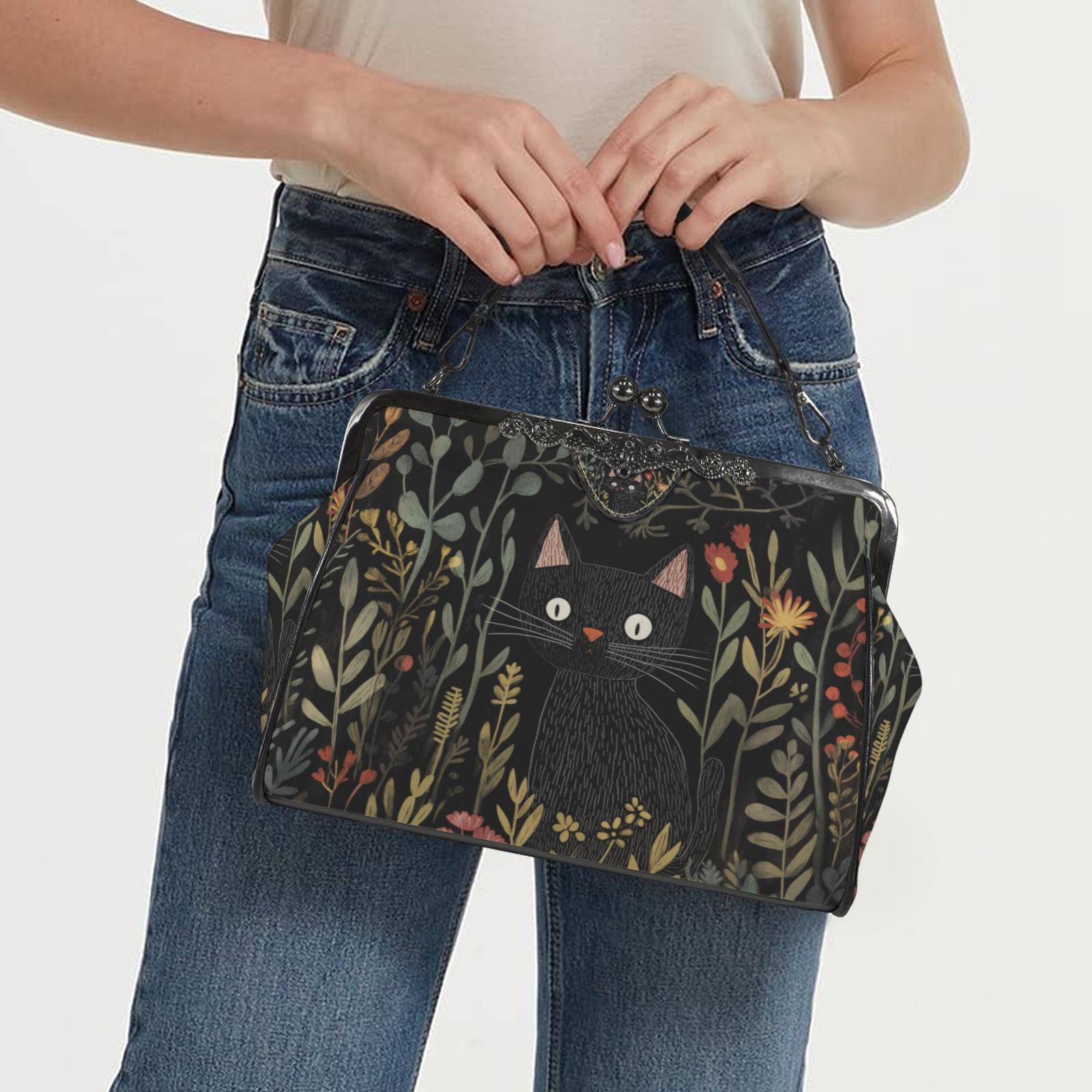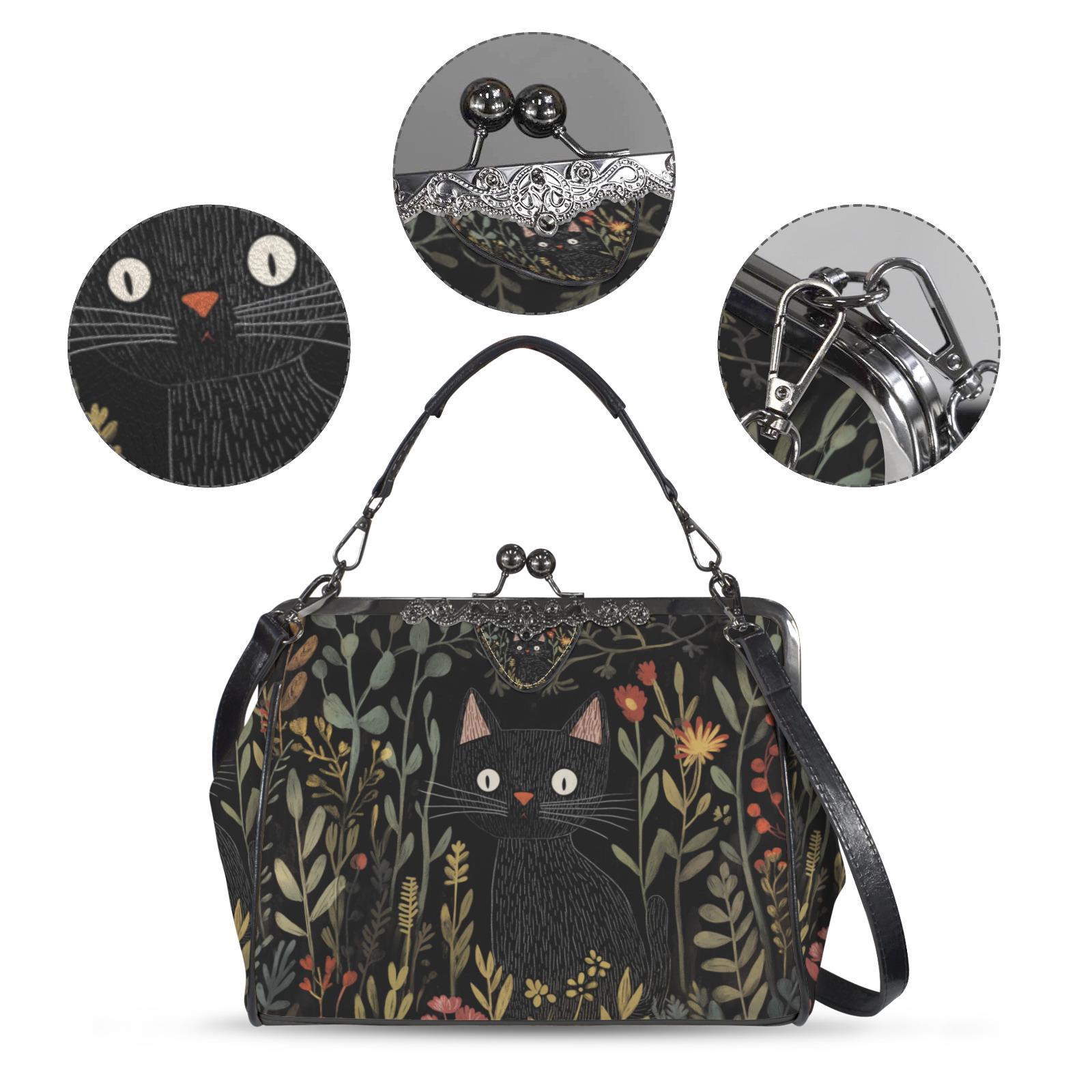 Cute Black Cat Kisslock Bag - Vegan Leather Witchy Kisslock Purse, Witchy Crossed body Mushroom purse, animal goth bag, hippies boho gift