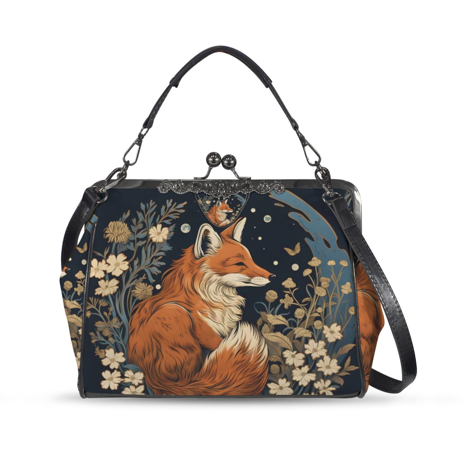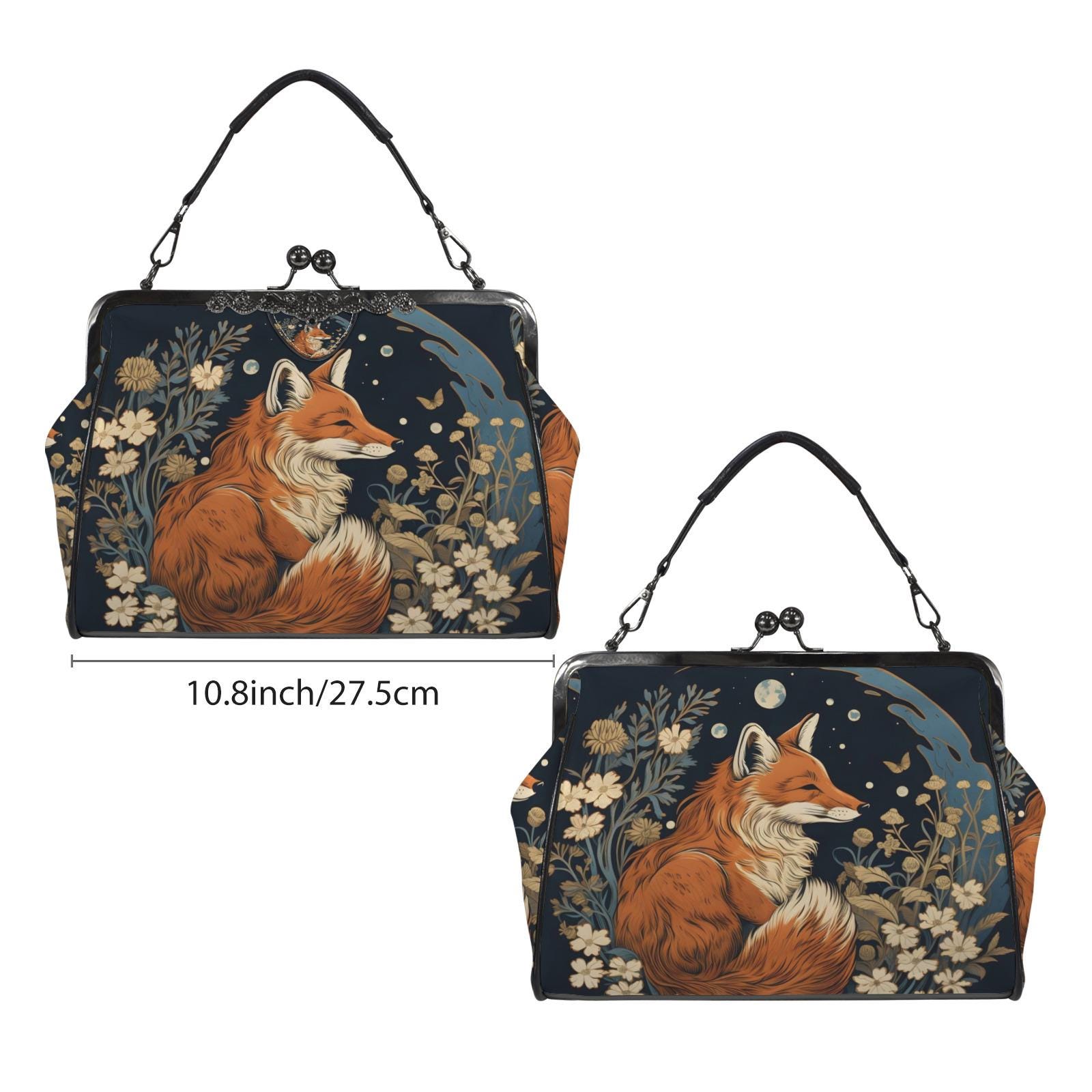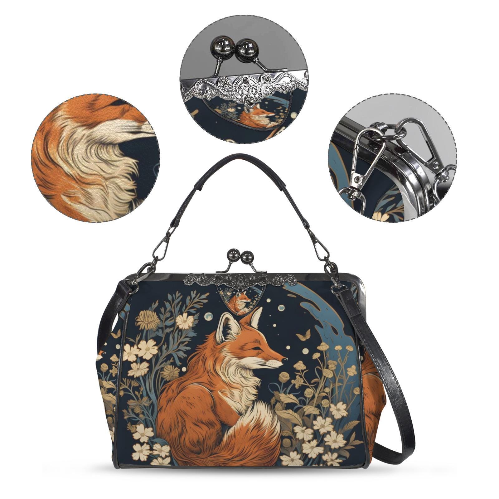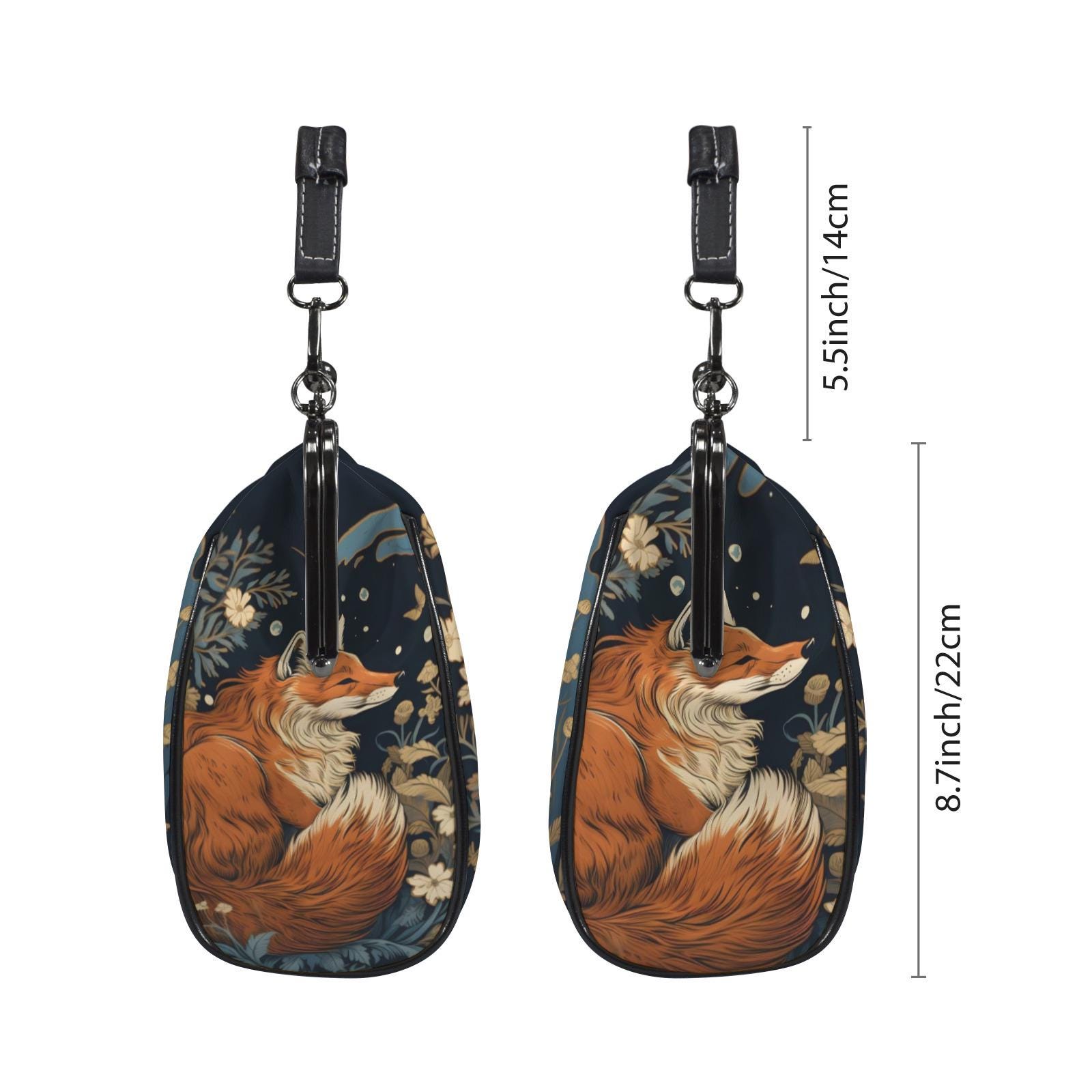 Retro Fox Boho Kisslock Bag - Vegan Leather Christmas Kisslock Purse, Witchy Crossed body Mushroom purse, goth bag, hippies boho gift
