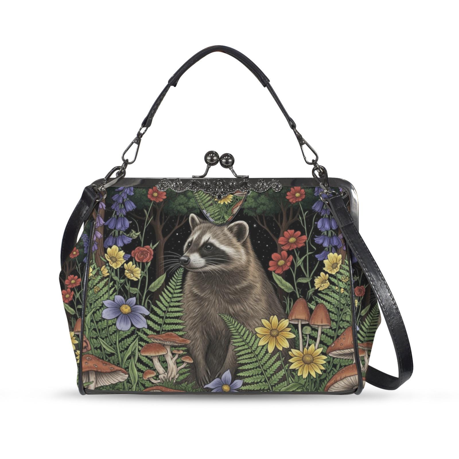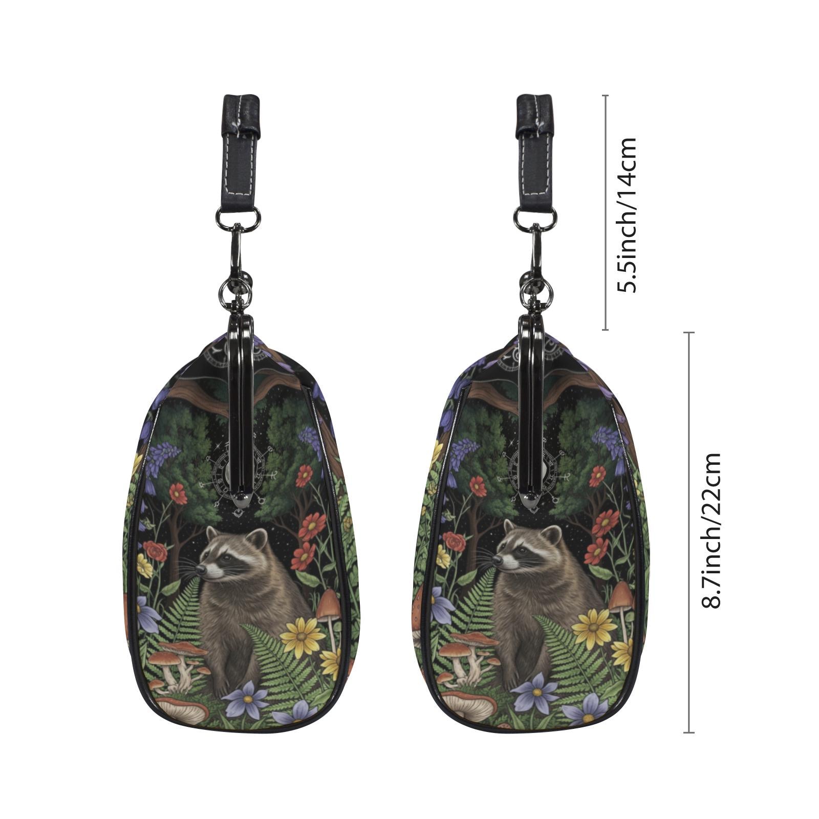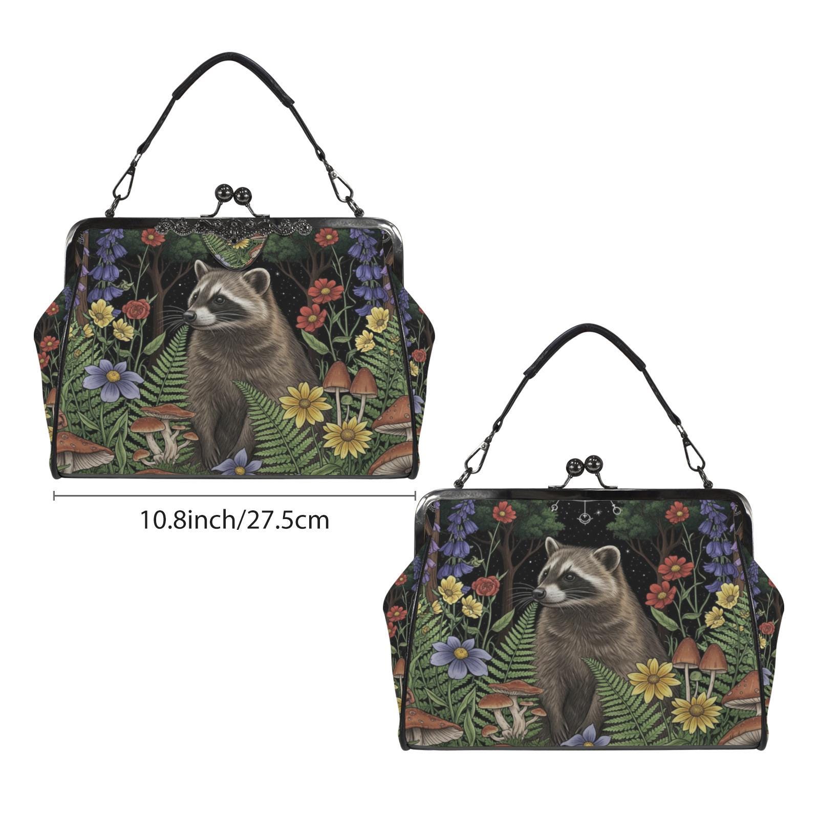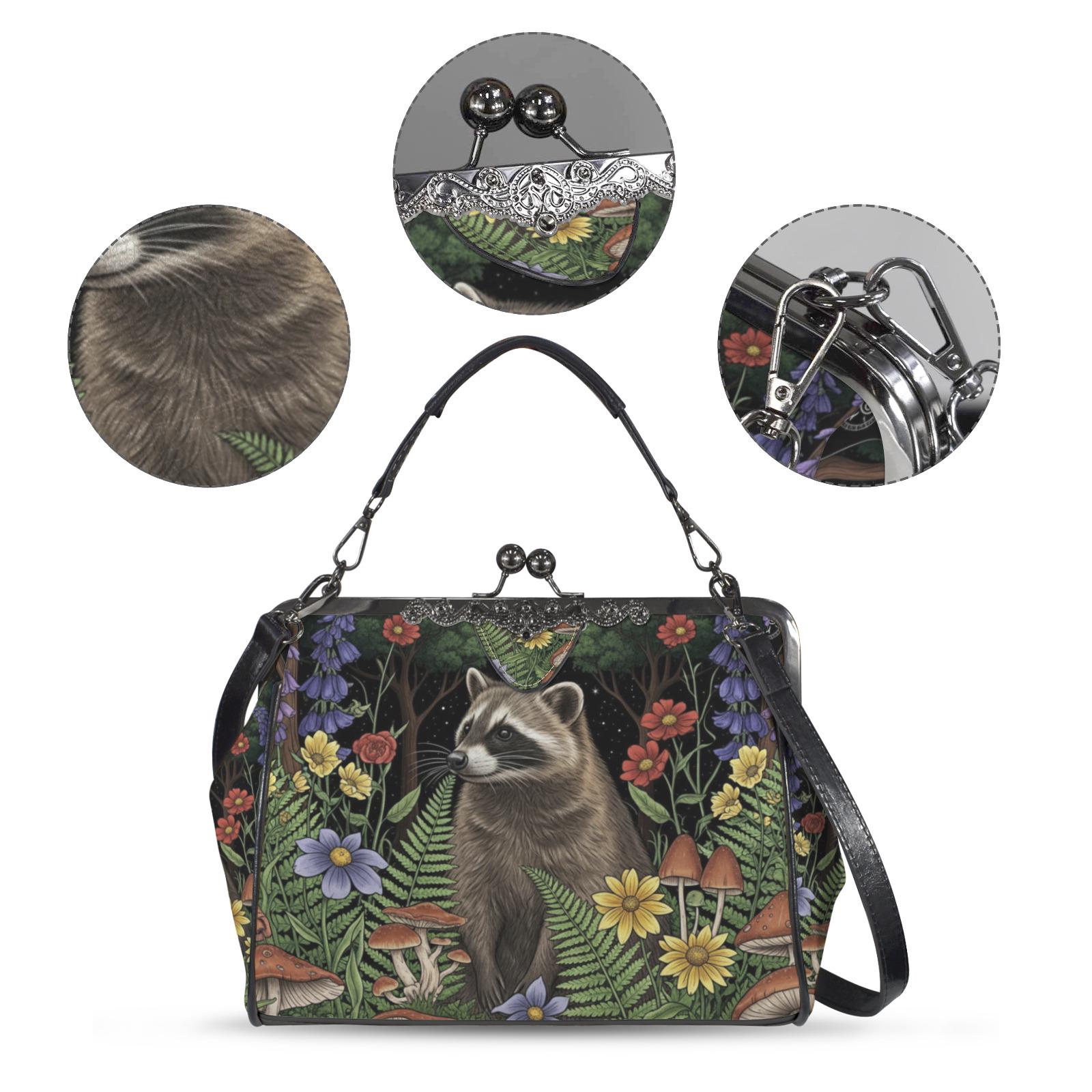 Raccoon Kiss Lock Purse, Boho Vegan Leather Handbag, Cottagecore Witch Kisslock Bag, Top Handle Kisslock Bag, Crossed body pu leather bag