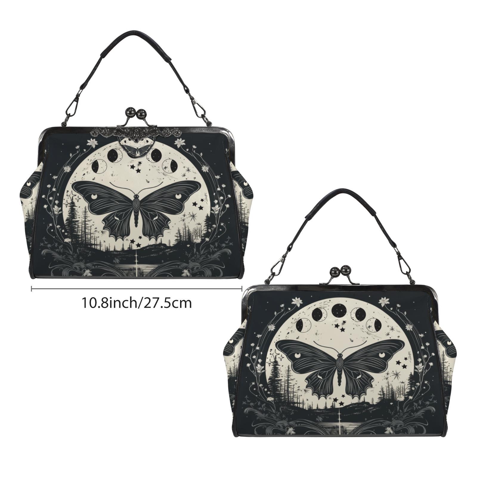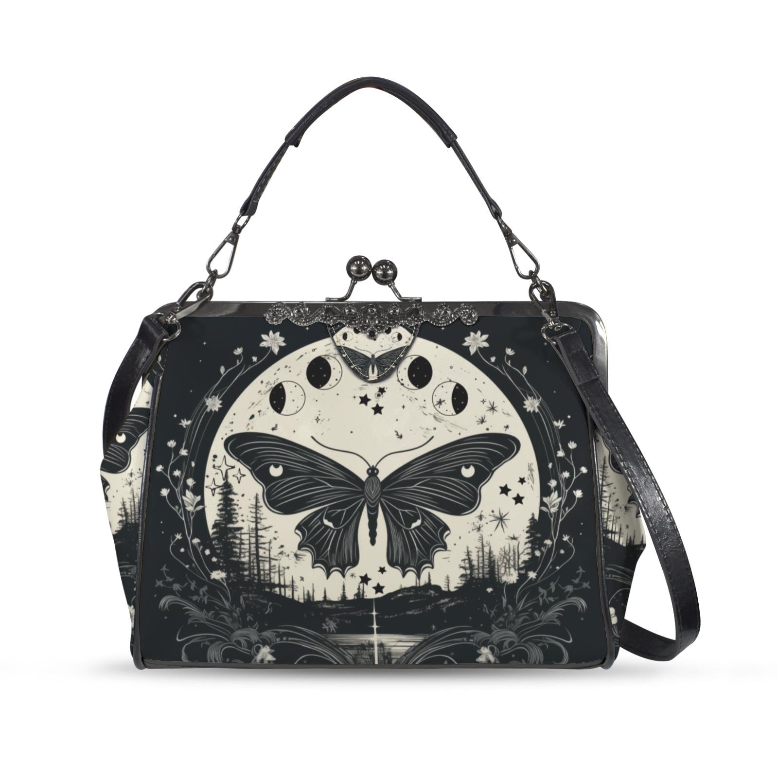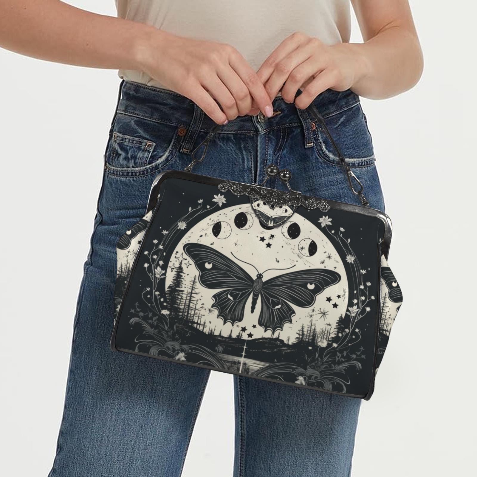 Witchy Moth Moon Kisslock Bag - Vegan Leather Dark academia Kisslock Purse, Witchy Crossed body Mushroom purse, goth bag, hippies boho gift