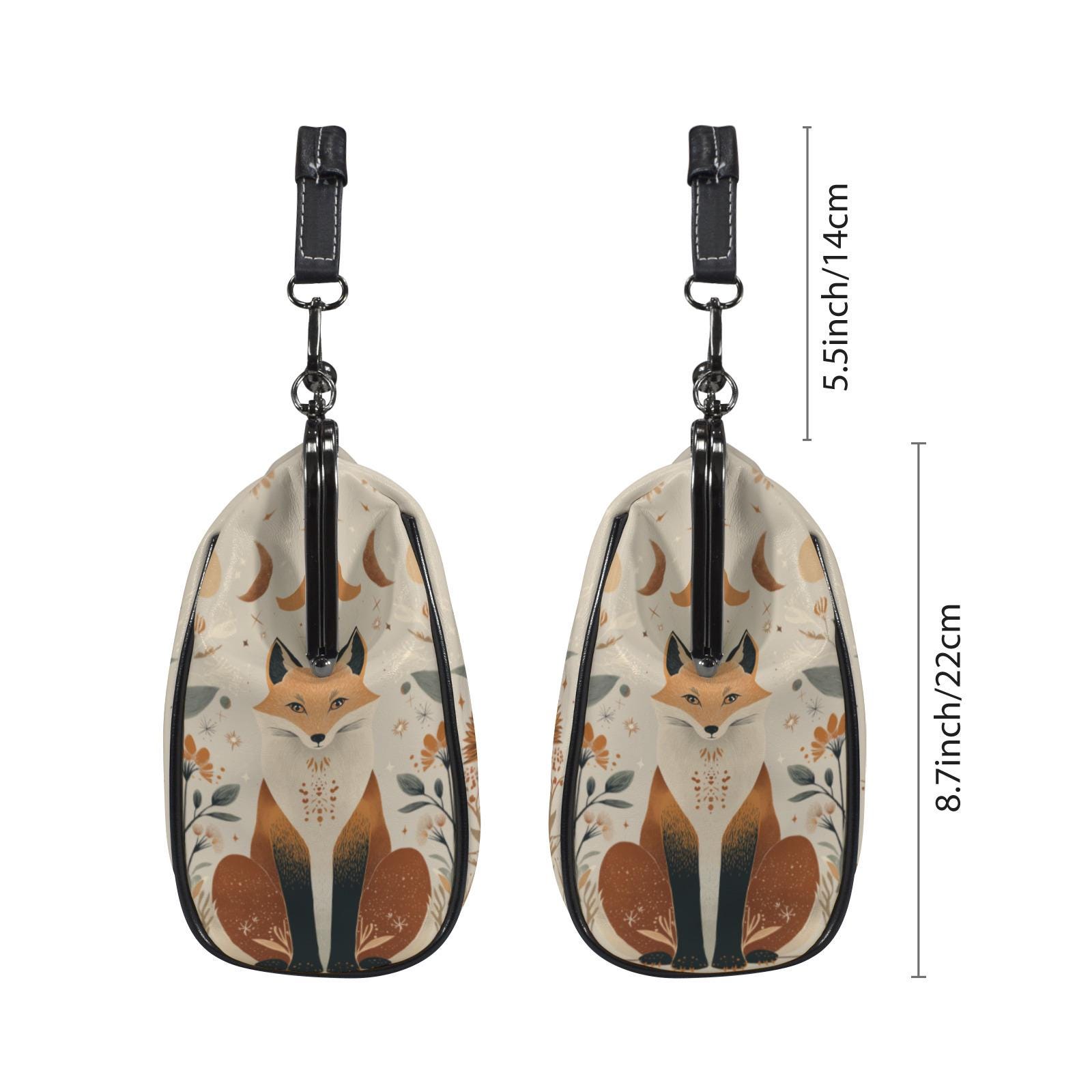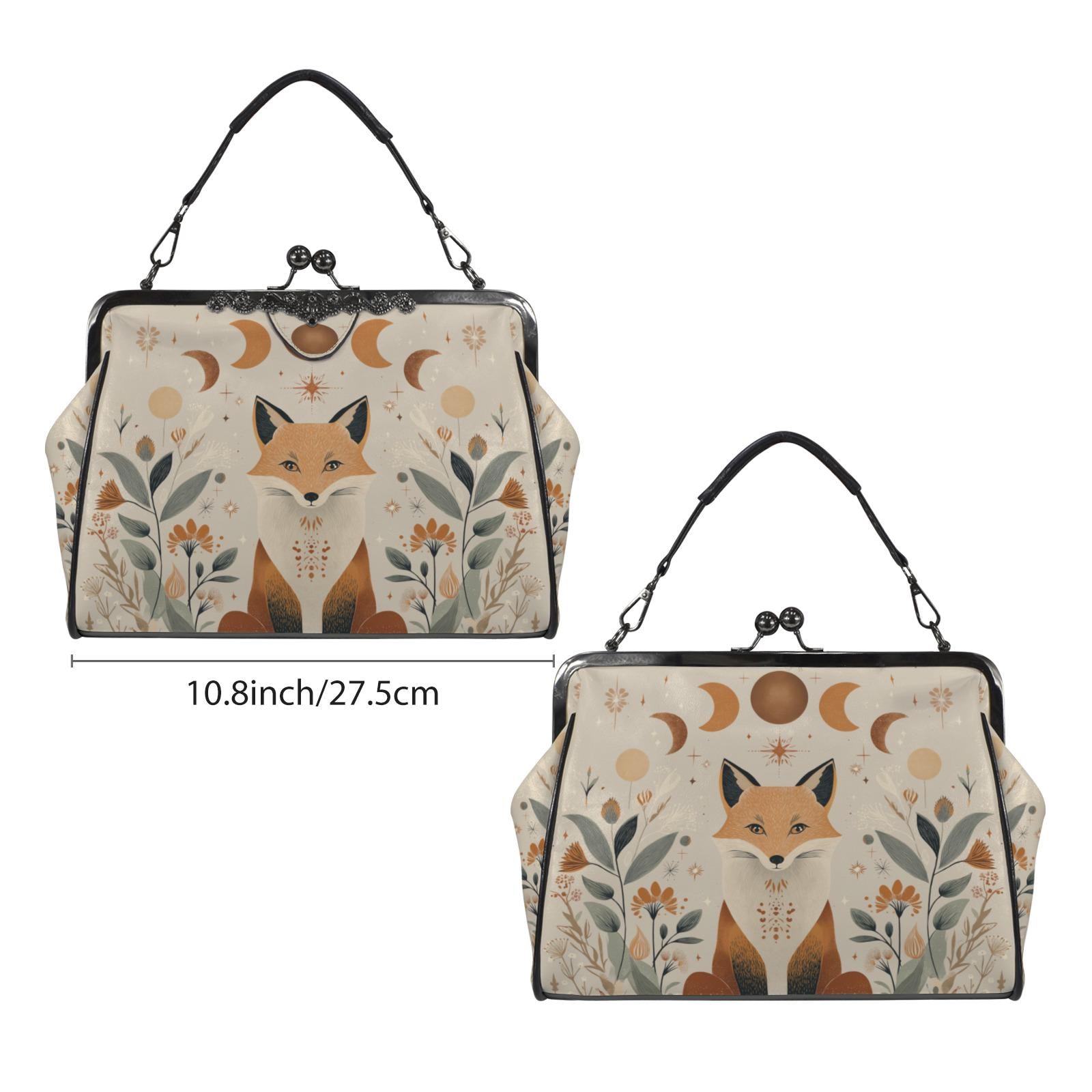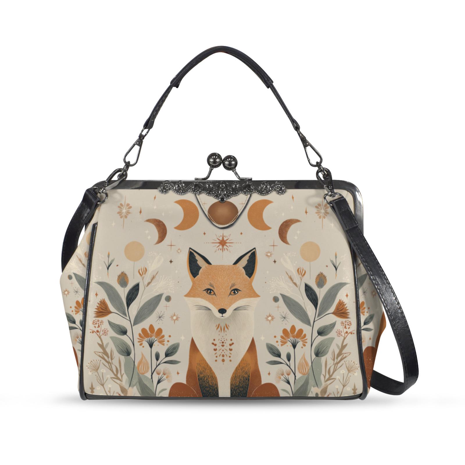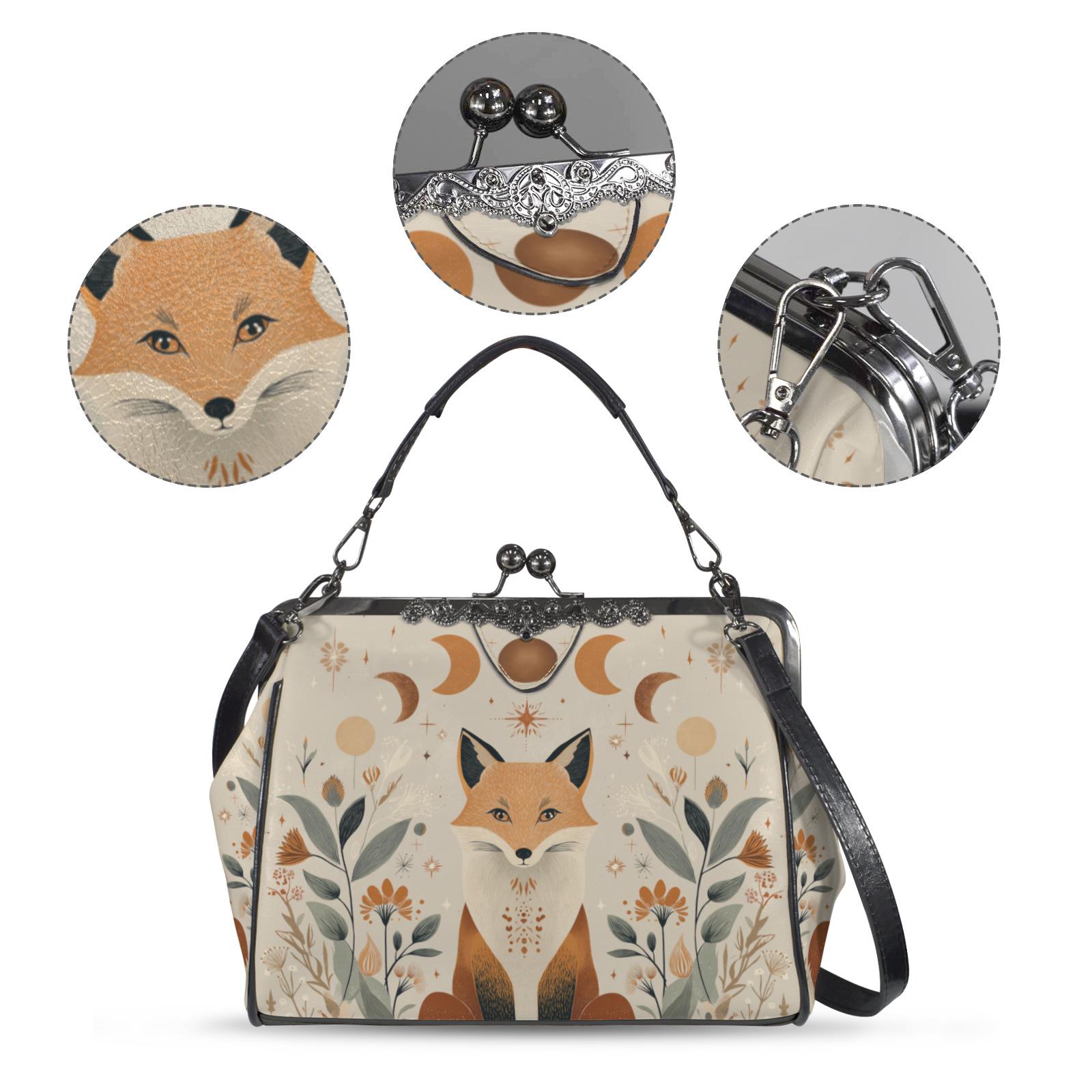 Retro Fox Beige Boho Kisslock Bag - Vegan Leather Moon Phases Kisslock Purse, Witchy Crossed body sholder bag, Cottagecore purse, goth bag