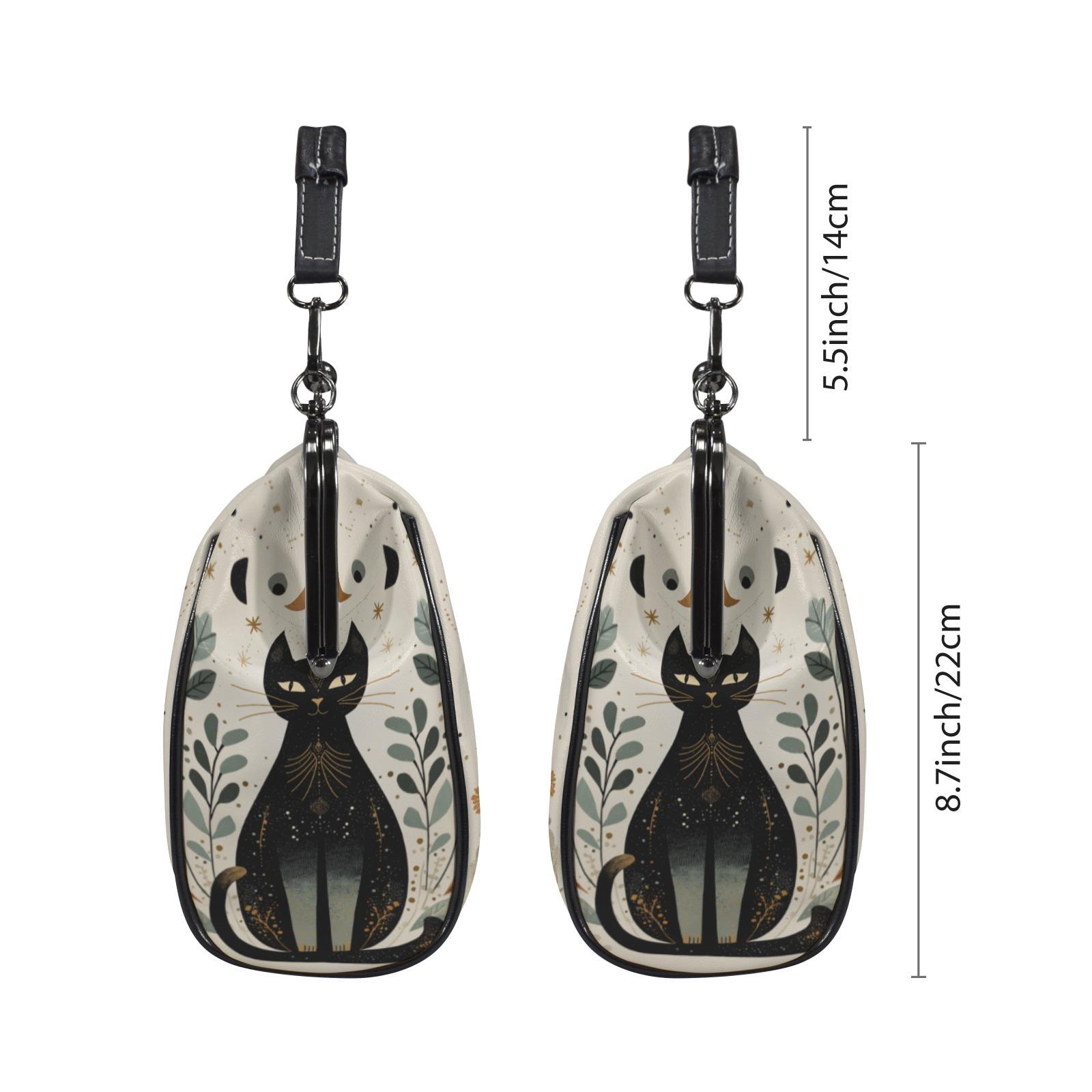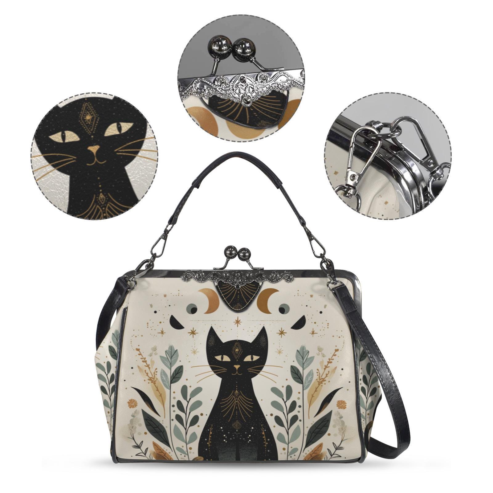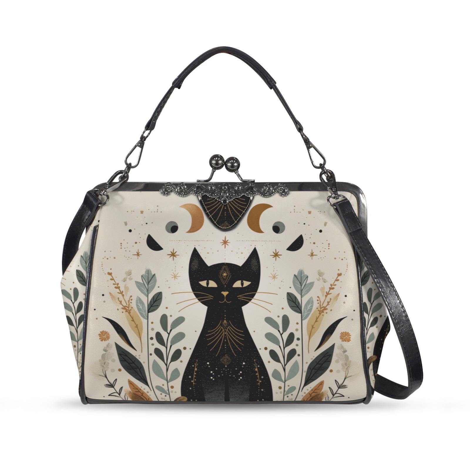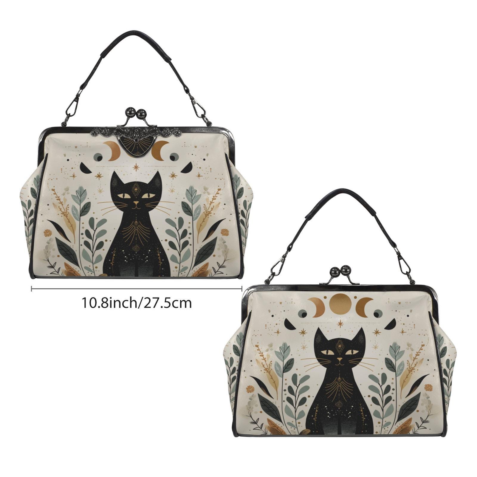 Black Cat Moon Phase Kisslock Bag - Vegan Leather Dark academia Kisslock Purse, Witchy Crossed body Nature purse, goth bag, hippie boho gift