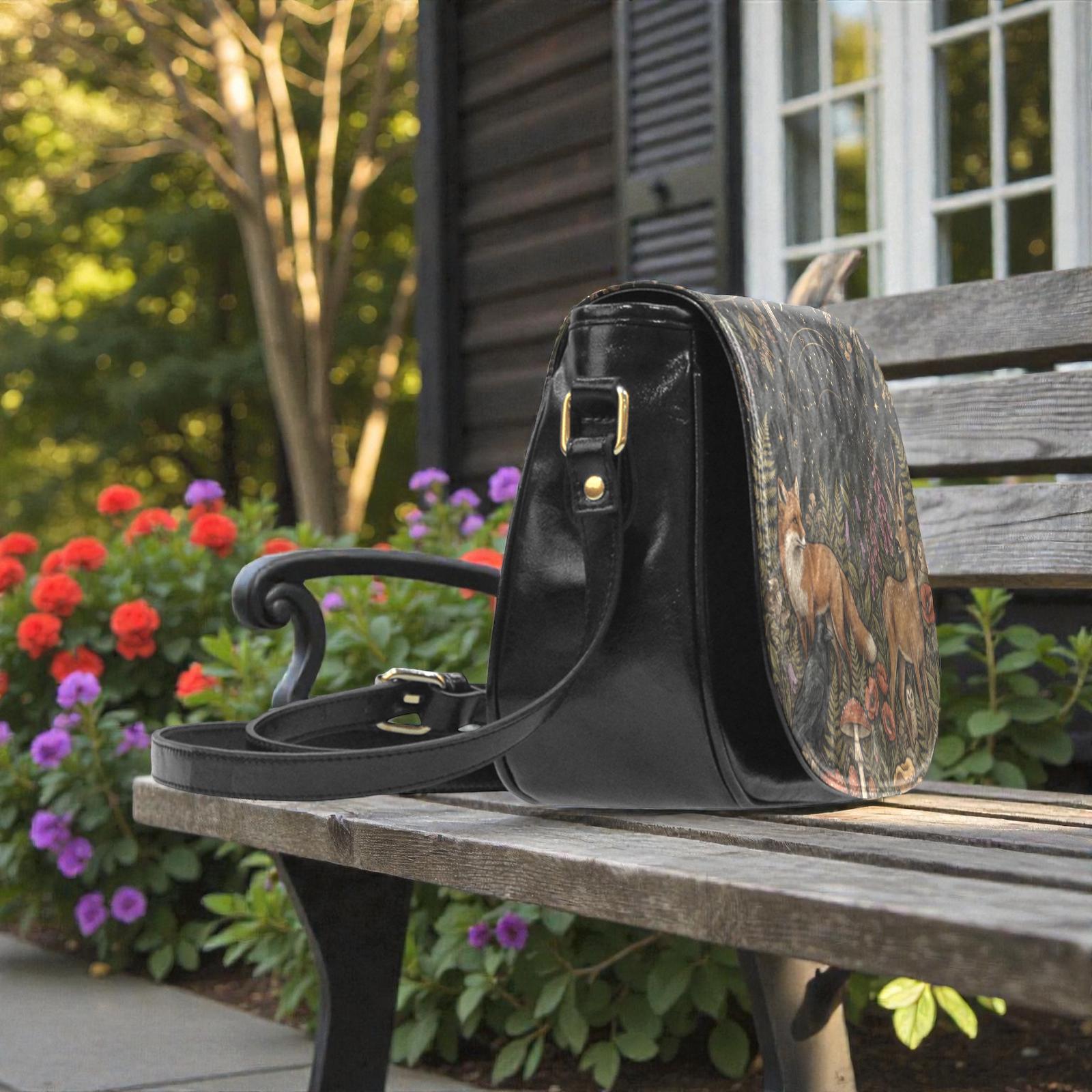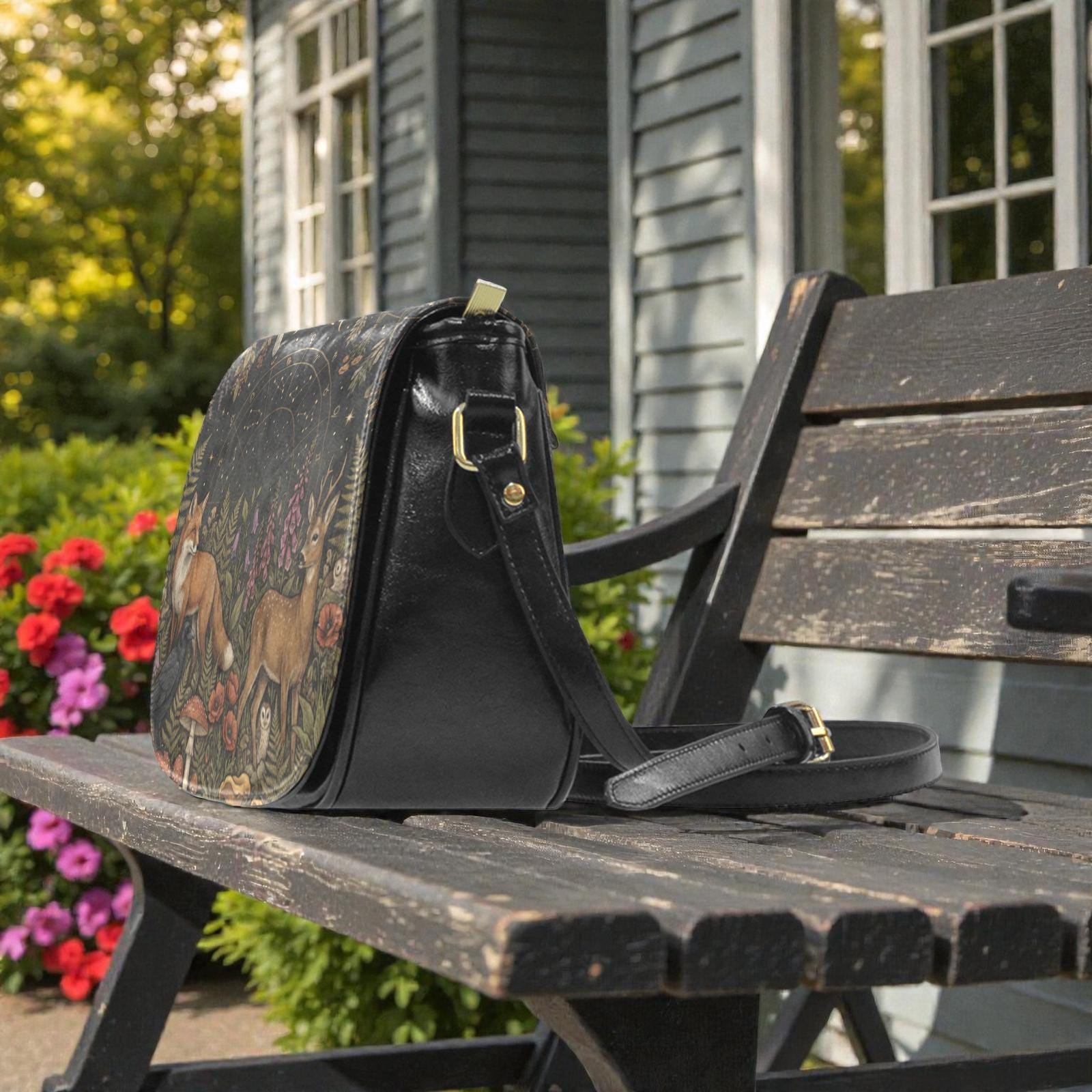 Woodland Animals under Moon Phase crossbody saddle bag, Witchy Cottagecore Vegan leather shoulder bag, Astrology saddle purse handbag gift