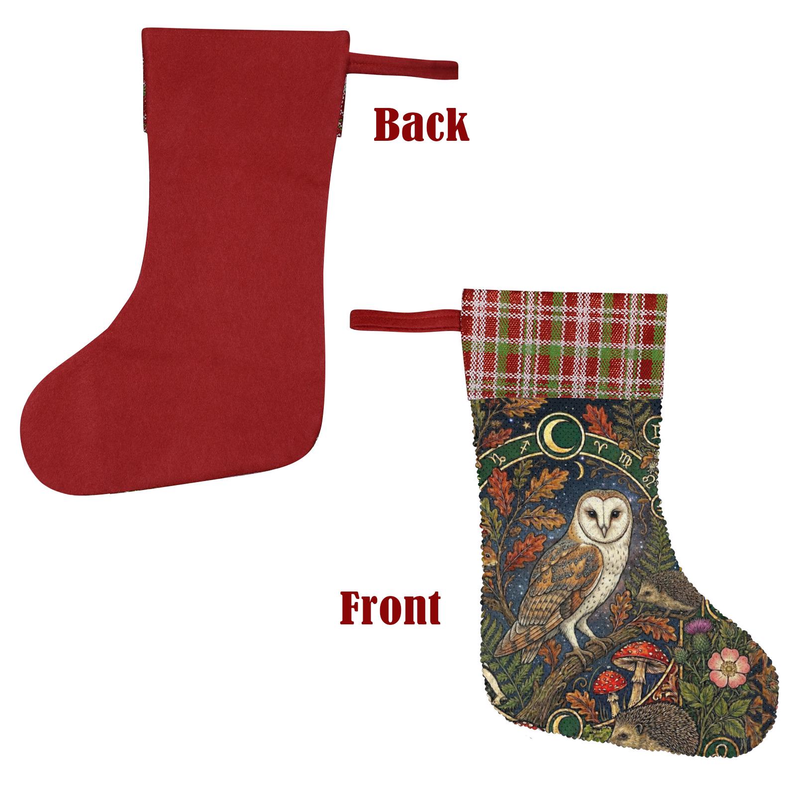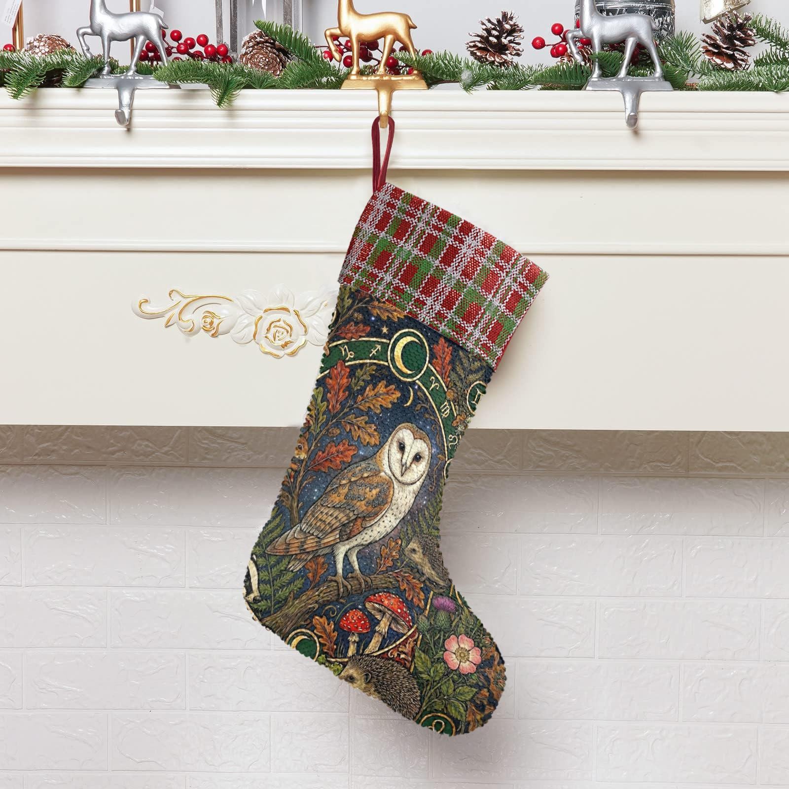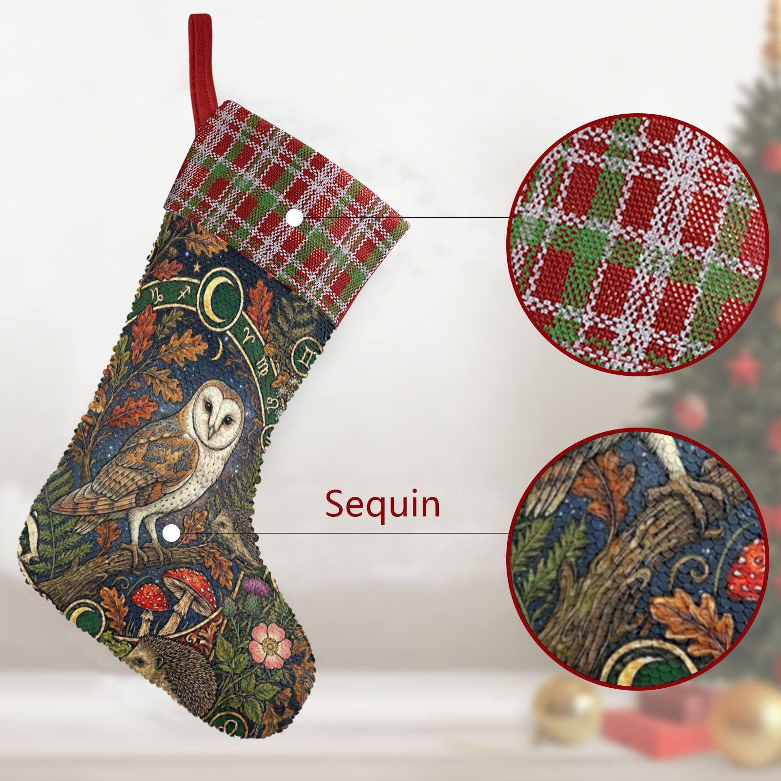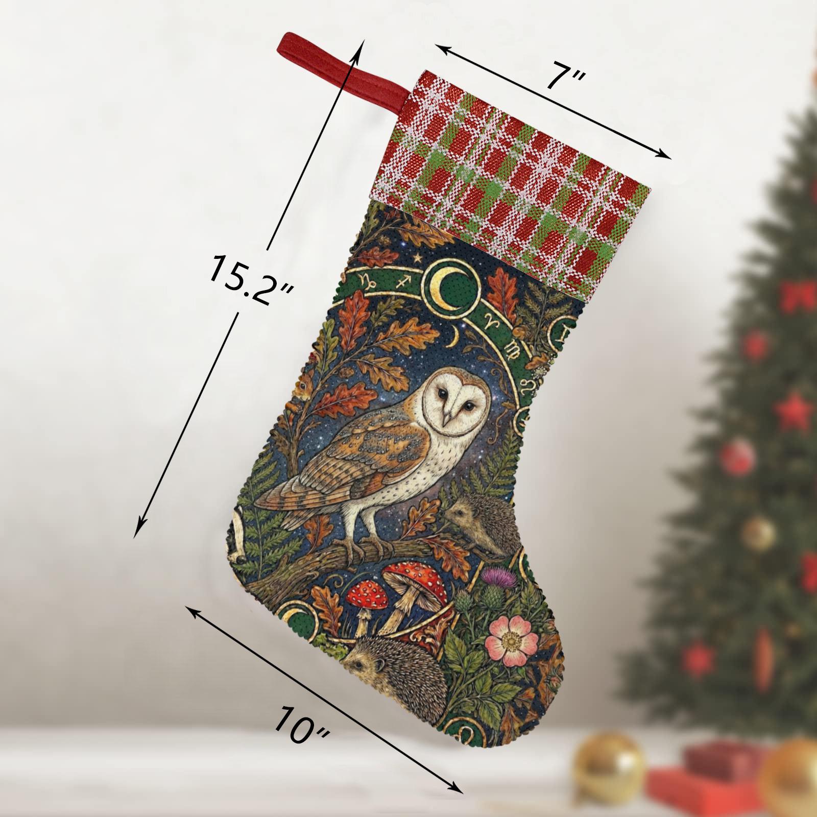 Mystic Owl Moon Sequin Stocking, Perfect for stuffing Santa's Gifts, Mushroom Fireplace Decor, Animal Woodlan Christmas, Holliday gift idea