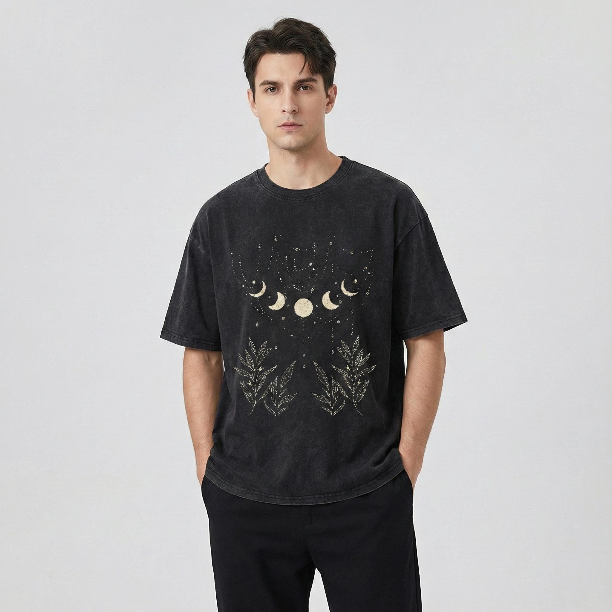 The moon phases graphic is DTG printed on the front, ensuring crisp details and long-lasting color. Its oversized unisex fit makes it perfect for relaxed everyday wear, layering, or styling with skirts, cardigans, or boots for a cozy woodland aesthetic.