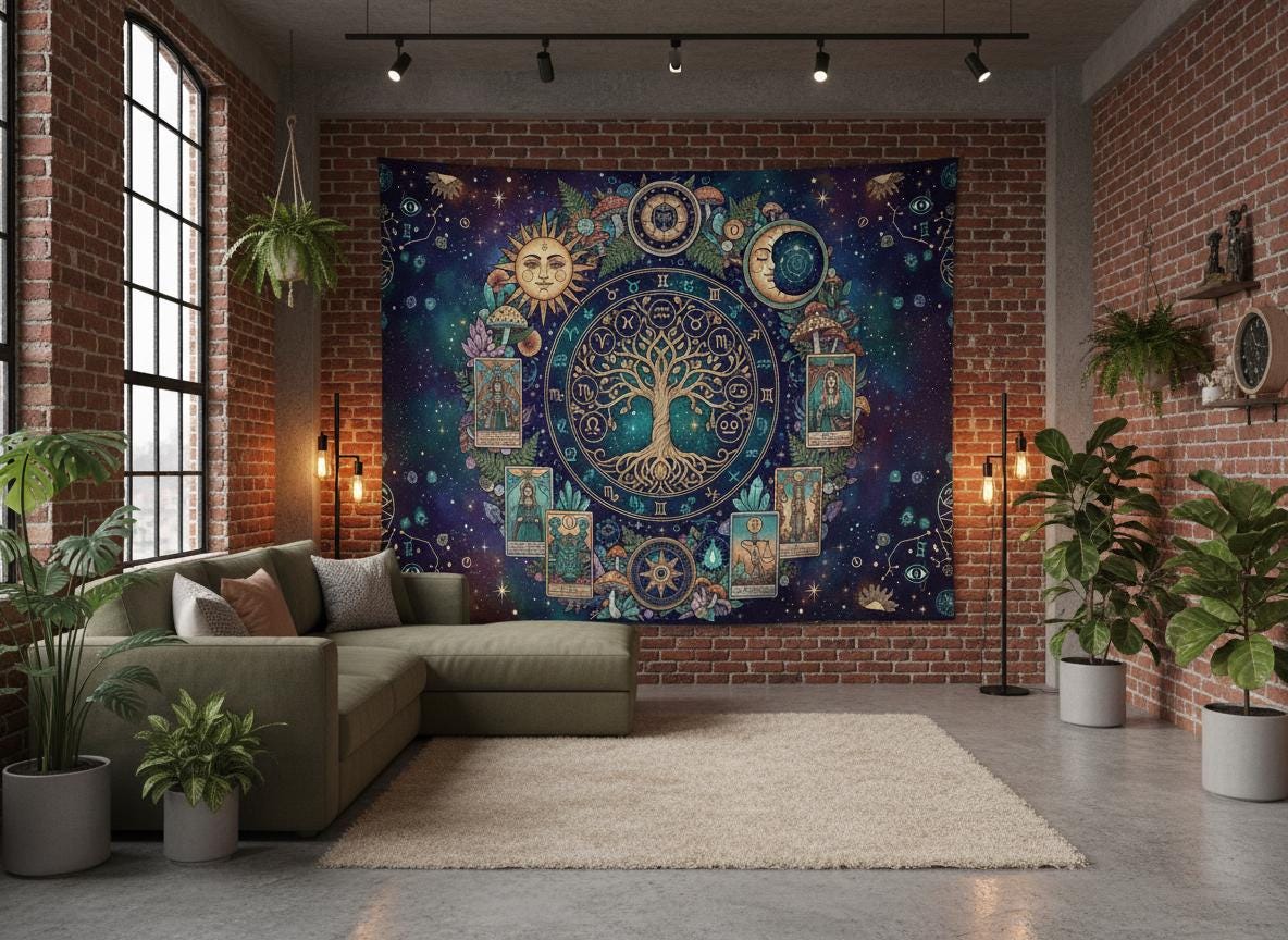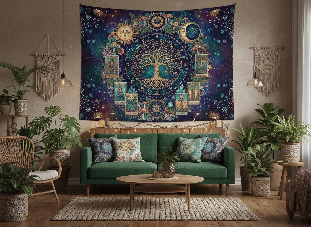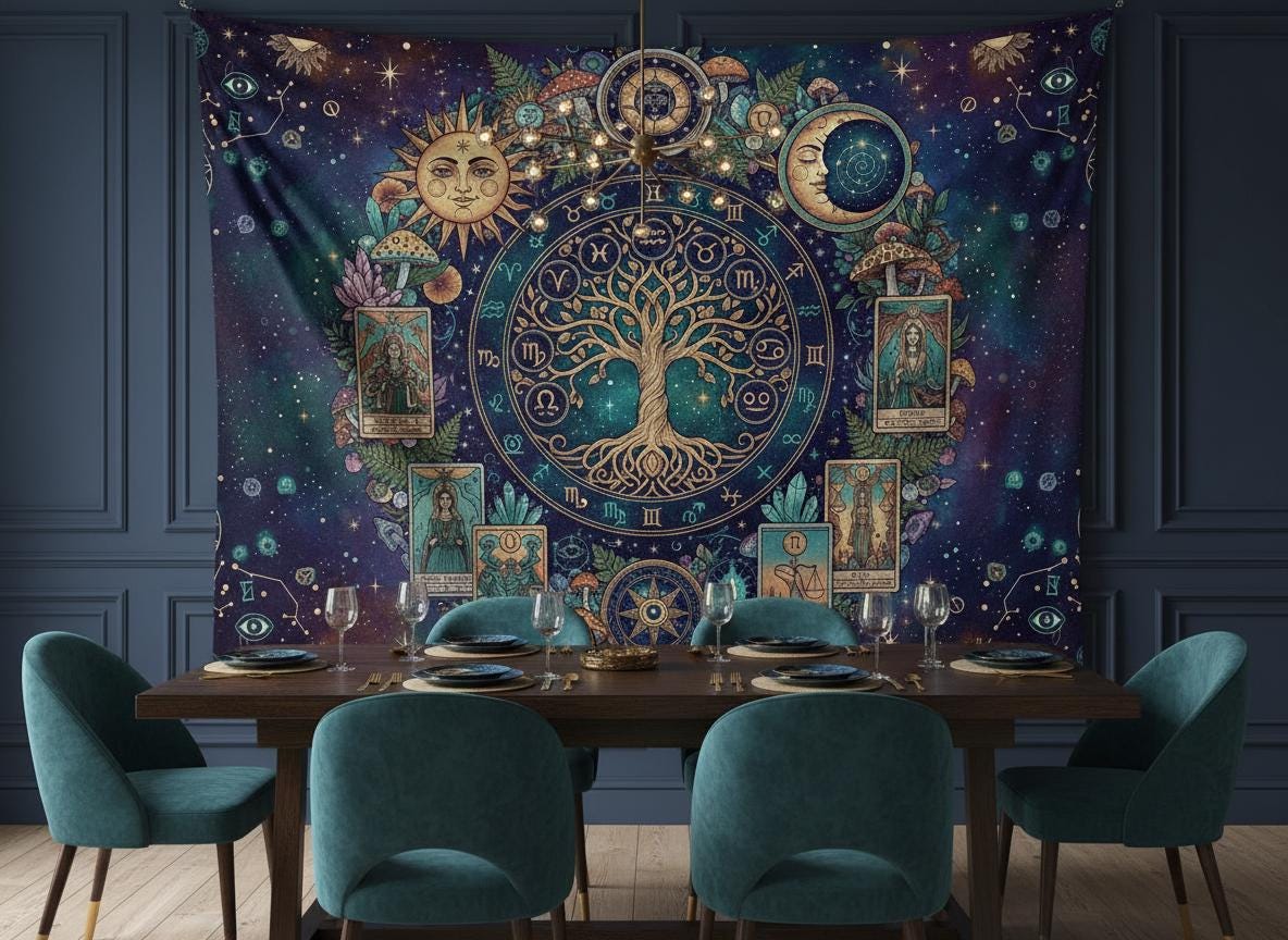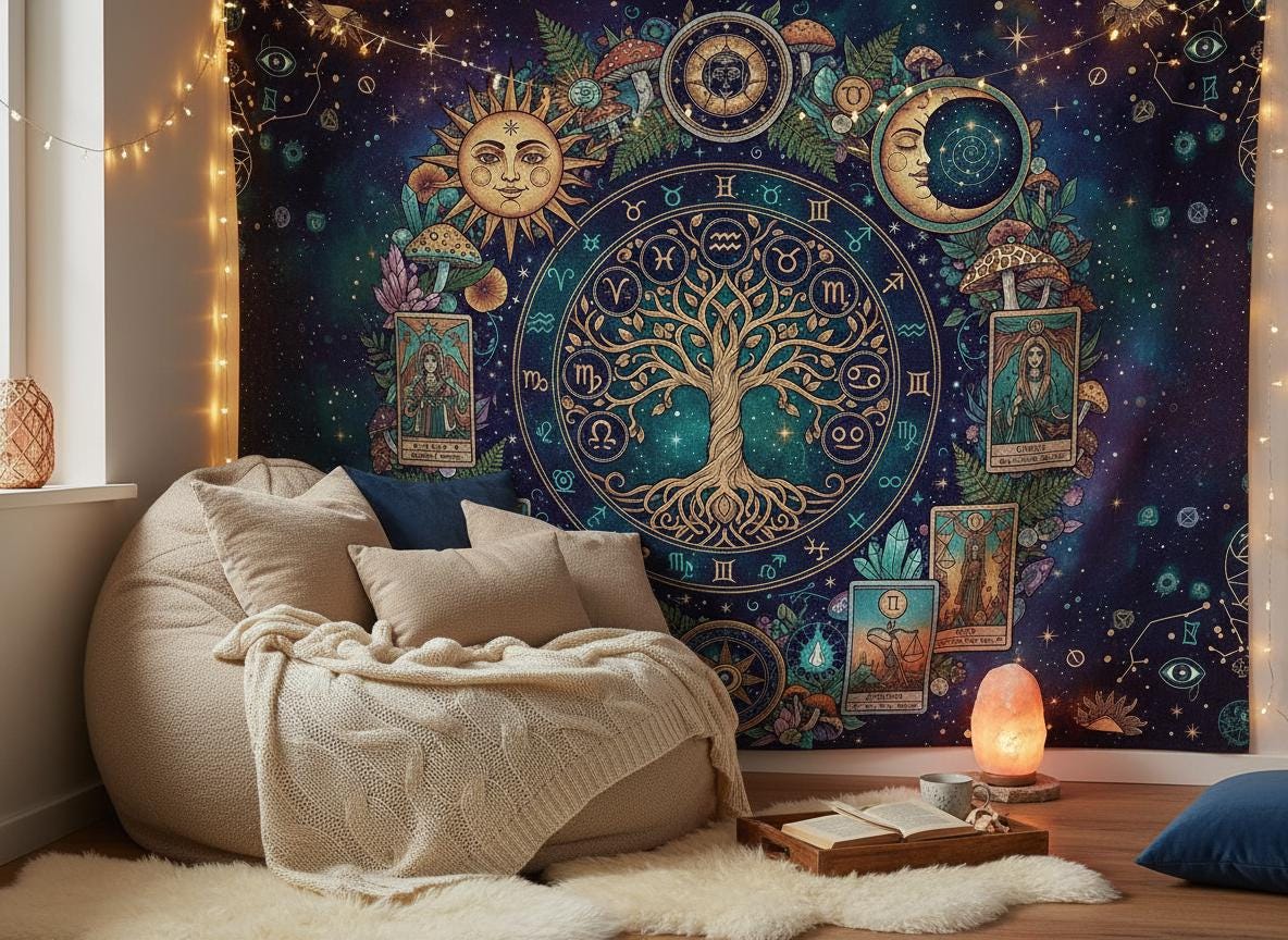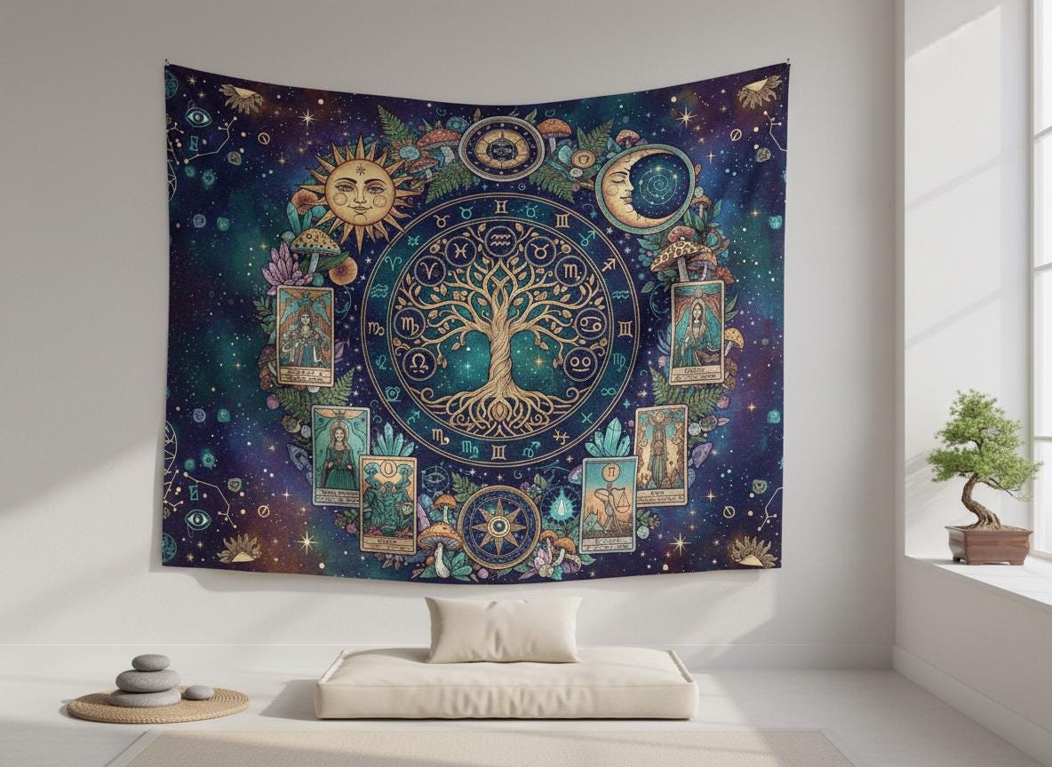Mystic sun with Tree of Life, Cottagecore Mushroom Tapestry, Tarot Celestial Wall Tapestry, Boho Hippies Gift, Cottagecore Witch Tapestry