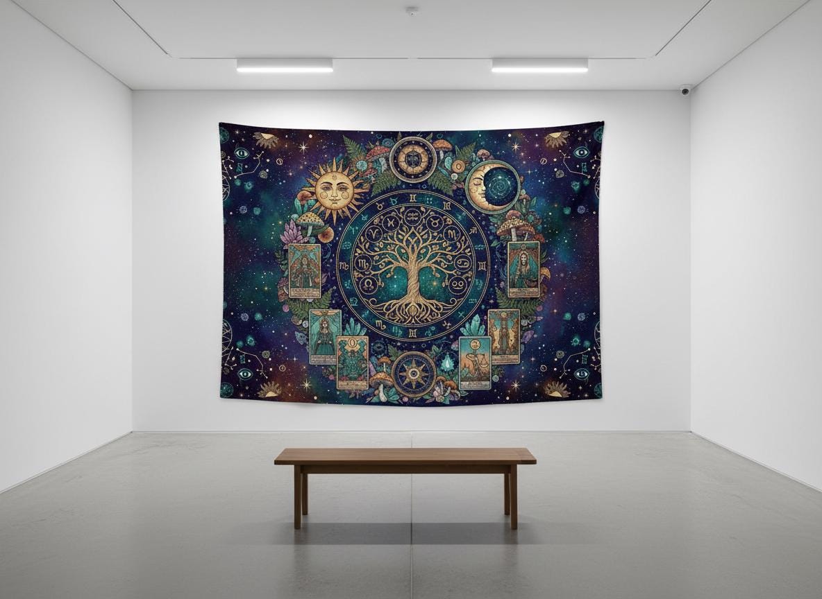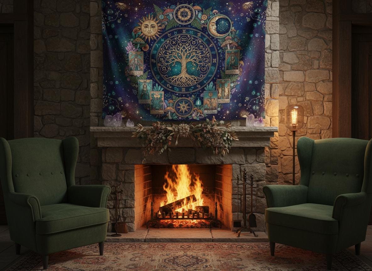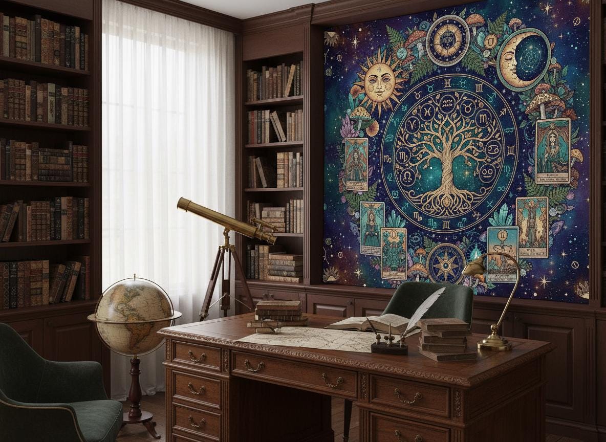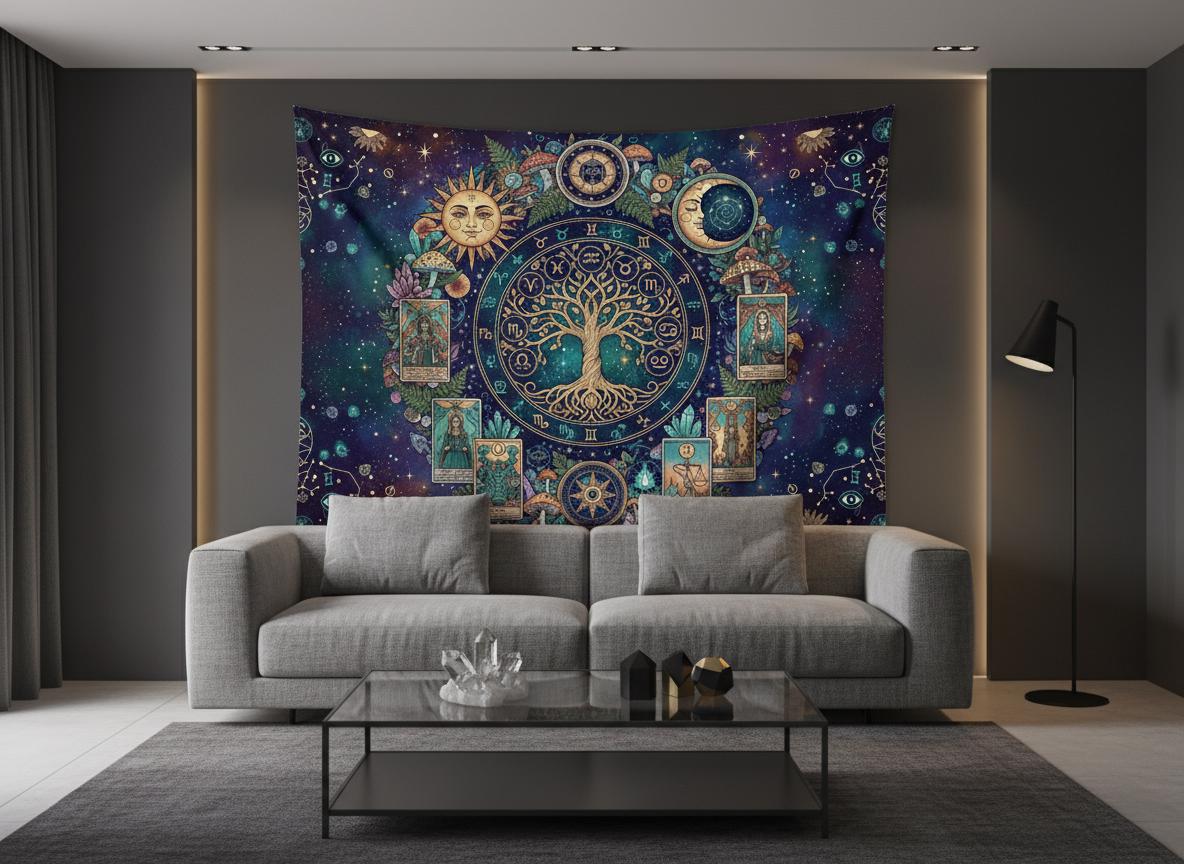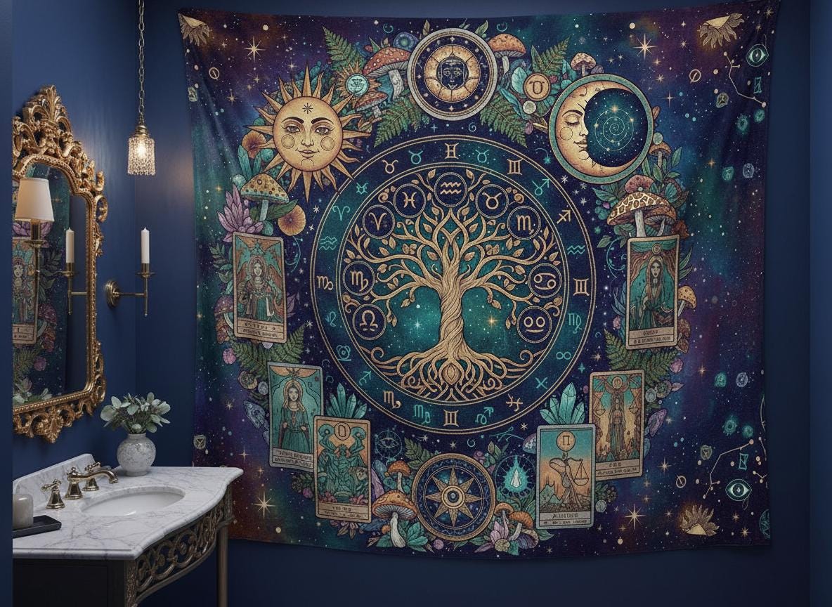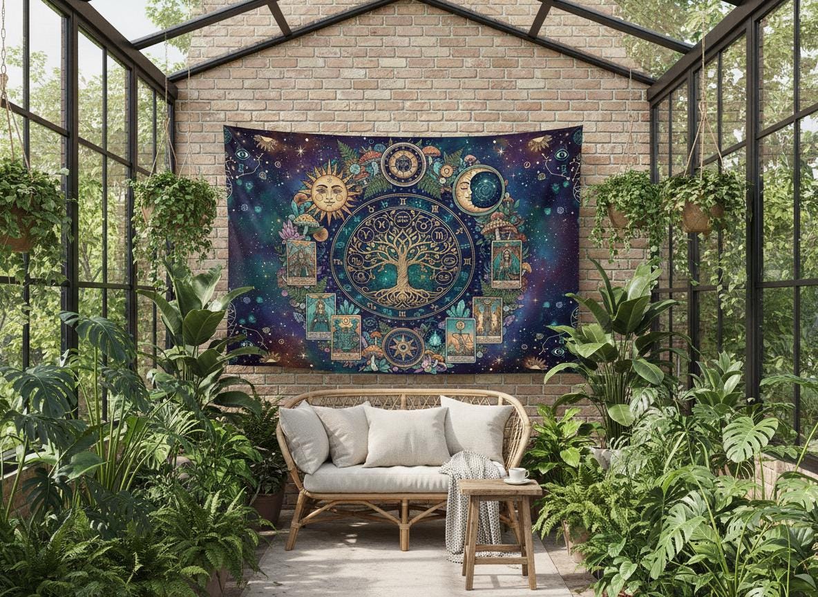 Mystic sun with Tree of Life, Cottagecore Mushroom Tapestry, Tarot Celestial Wall Tapestry, Boho Hippies Gift, Cottagecore Witch Tapestry