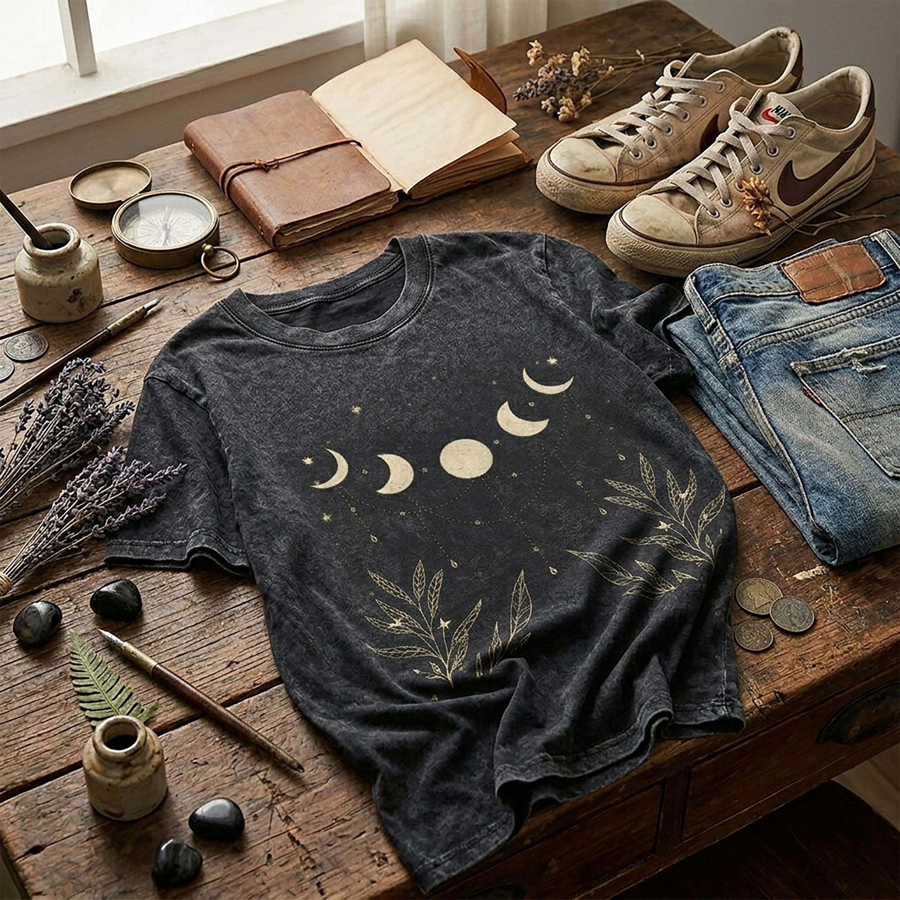 Mystical Design: Detailed front-print featuring moon phases and botanical accents for a unique boho-witchy aesthetic.