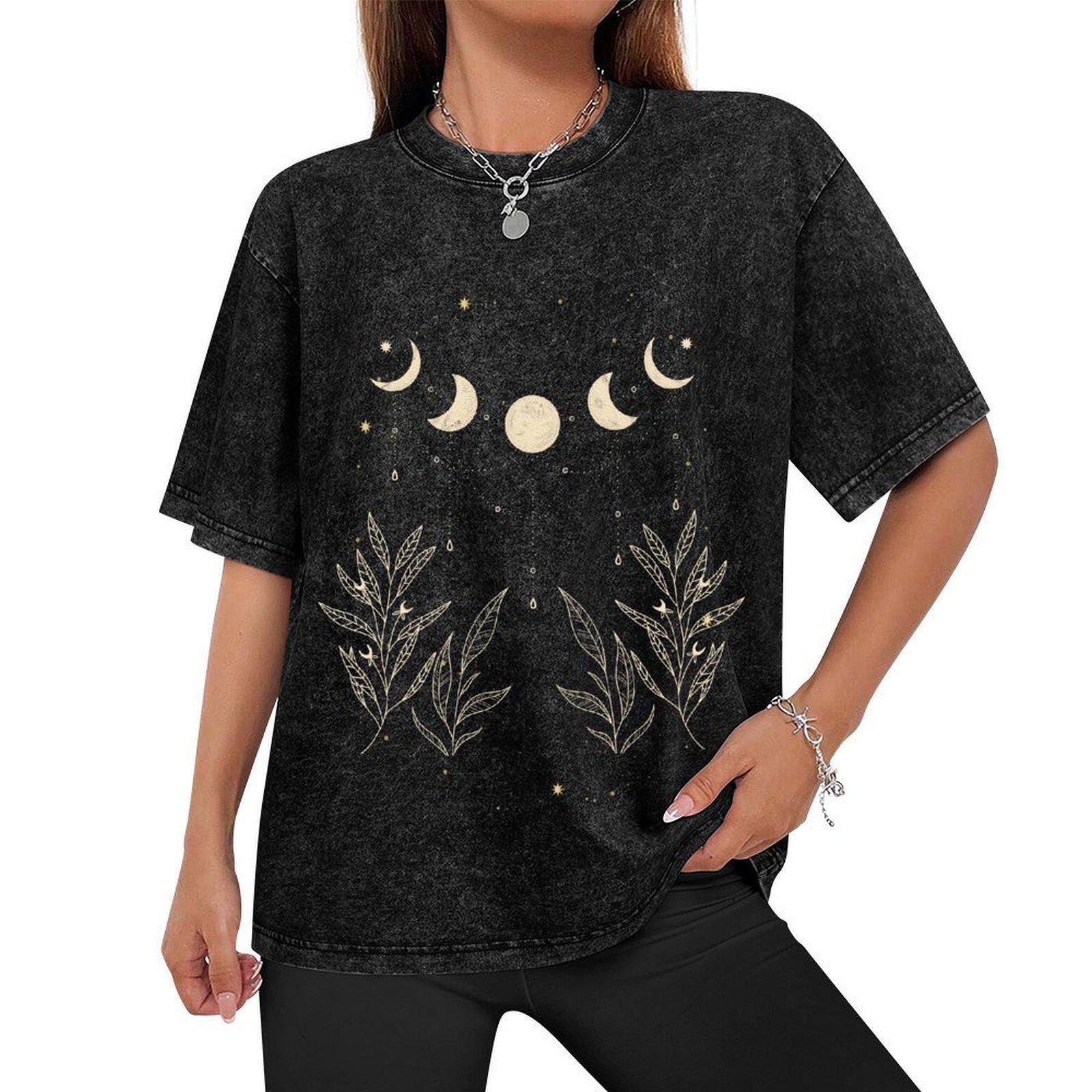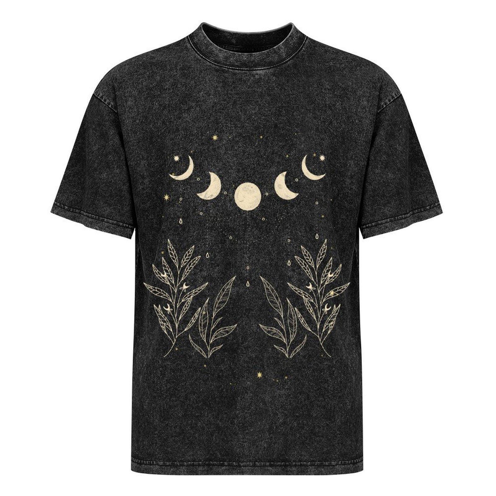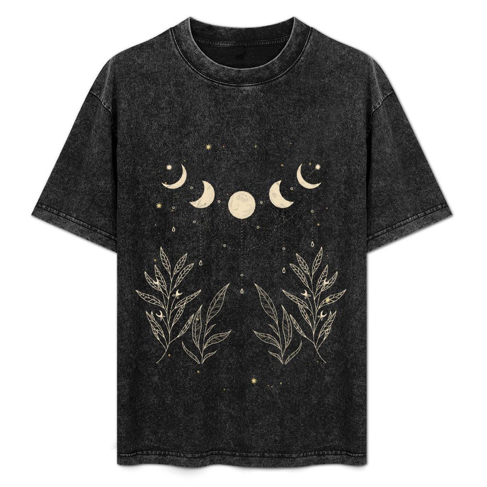 Celestial Moon Phase Shirt, Boho Botanical Graphic Tee, Witchy Moon and Leaves T-shirt, Dark Academia Clothing, 100% Cotton Oversized Top