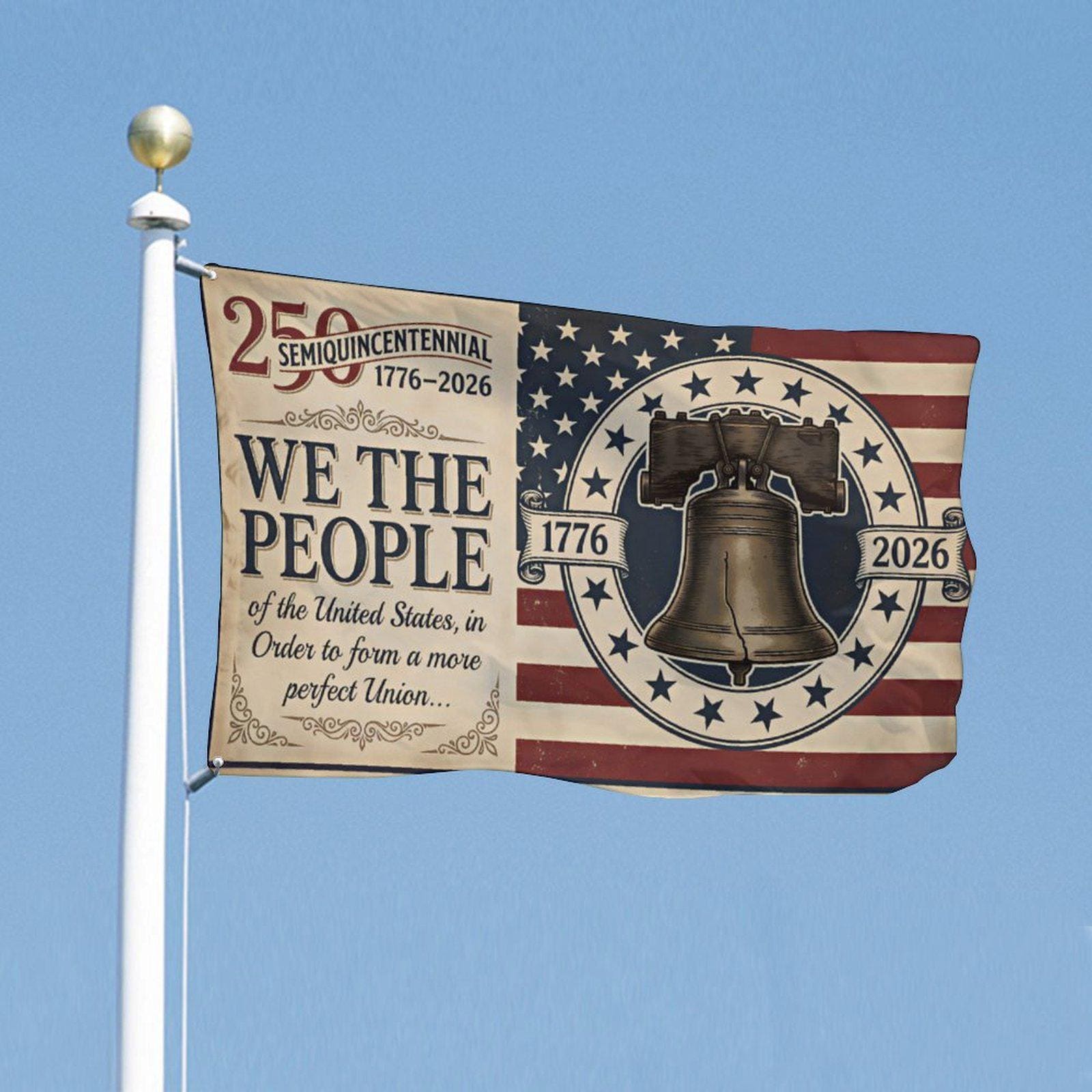 Honor the United States Semiquincentennial (1776–2026) with this striking, vintage-inspired patriotic flag. Featuring a distressed aesthetic that beautifully showcases the Liberty Bell, the classic 13-star constellation, and the timeless preamble of the Constitution, this banner is the perfect way to display your American pride.